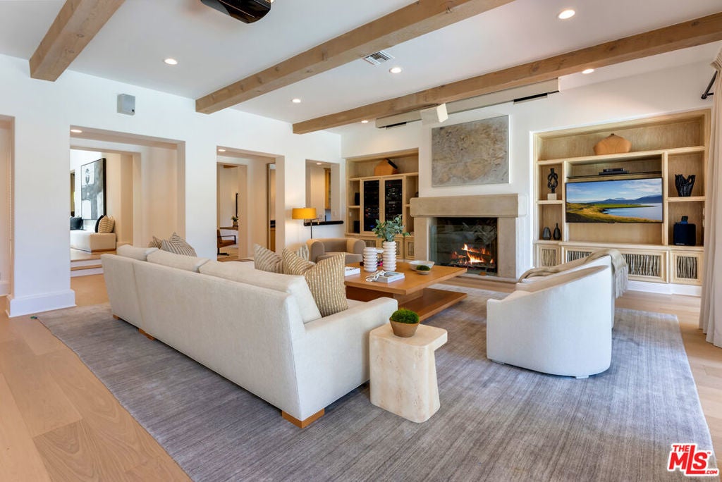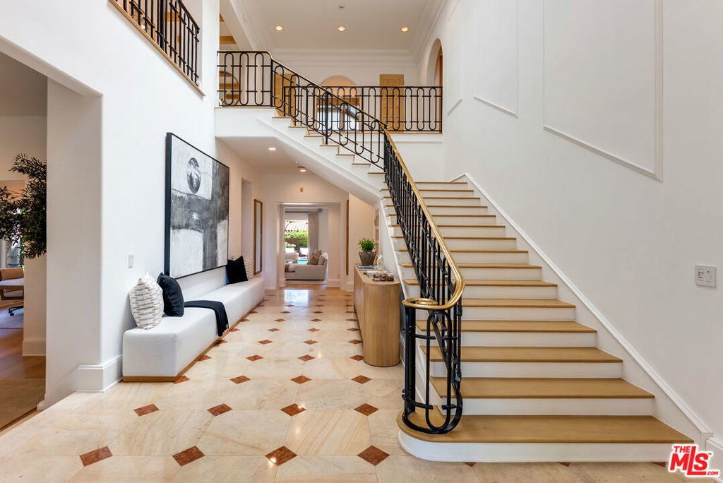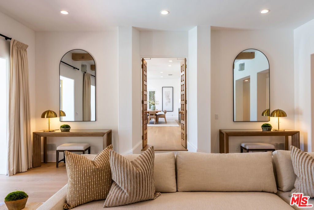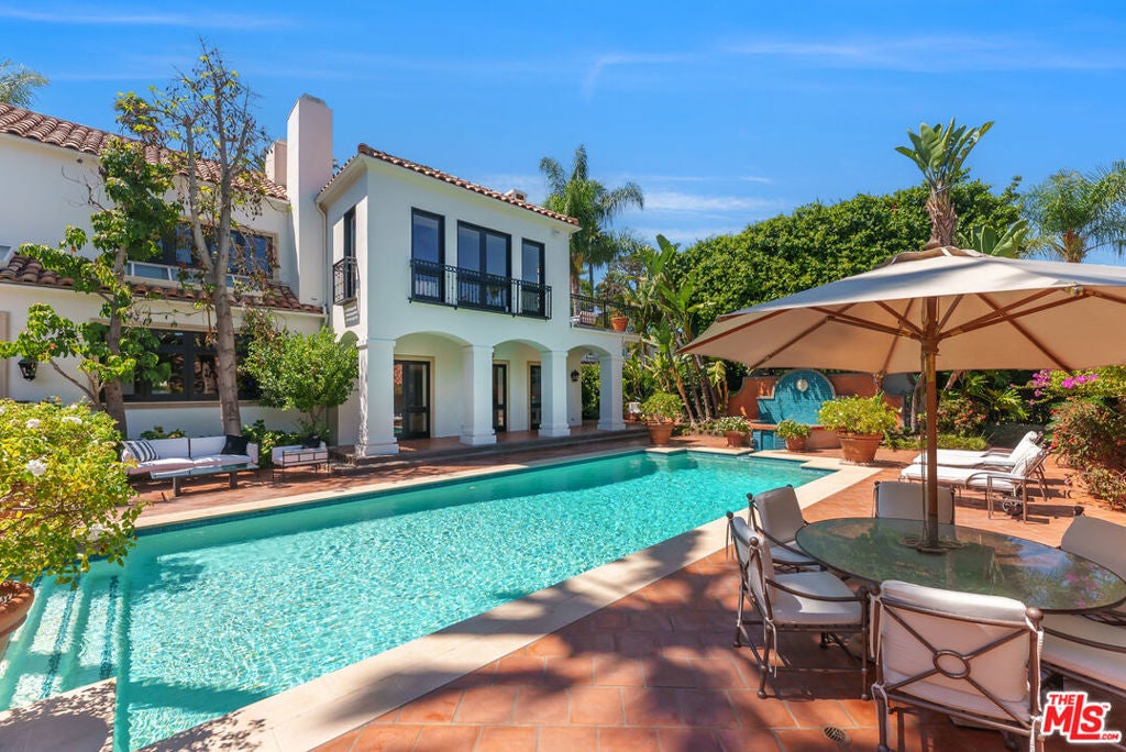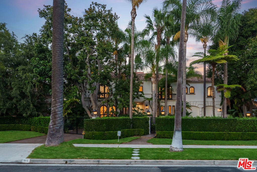 Presenting The Bedford Estate, a newly refreshed Mediterranean masterpiece in the coveted Flats of Beverly Hills. Gated and private, the striking white exterior with black trim is framed by a circular driveway, leading to an elegantly designed two-story residence of approximately 11,000 square feet on a half-acre of pristine grounds. A dramatic two-story foyer with a sweeping staircase introduces the formal living room, dining room, office, and an exceptional family room with floor-to-ceiling French doors that open seamlessly to the backyard. Wide-plank white oak floors, soaring ceilings, expansive windows, multiple fireplaces, and abundant natural light create a warm yet grand atmosphere. The chef's kitchen is a culinary dream, featuring skylights, a large center island, and an expansive informal dining area that also opens to the outdoors. The backyard is a private oasis, offering multiple seating and lounging areas, an inviting pool, and a beautifully landscaped grassy yard. A separate pool house complete with a bath provides the perfect retreat or entertainment space. Upstairs, the primary suite is truly exceptional, showcasing vaulted beamed ceilings, floor-to-ceiling windows, a fireplace, and two luxurious spa-style bathrooms each with a seating area and boutique-sized closets. Three additional upstairs ensuite bedrooms offer generous proportions, high ceilings, and refined finishes. A service bedroom is conveniently located downstairs near the back staircase. Completing the estate are two attached garages plus two additional garages accessed from the alley. This is truly a one-of-a-kind home in a one-of-a-kind Beverly Hills location.