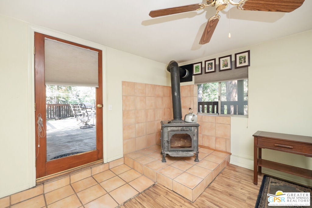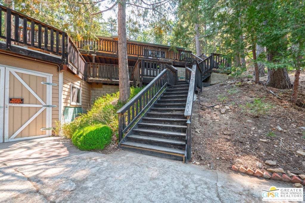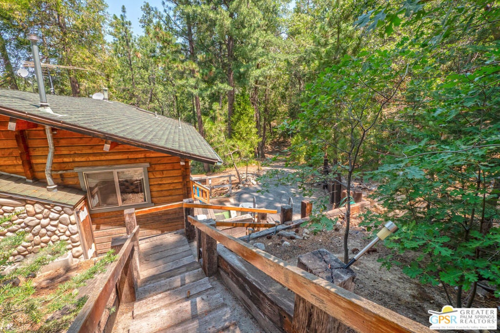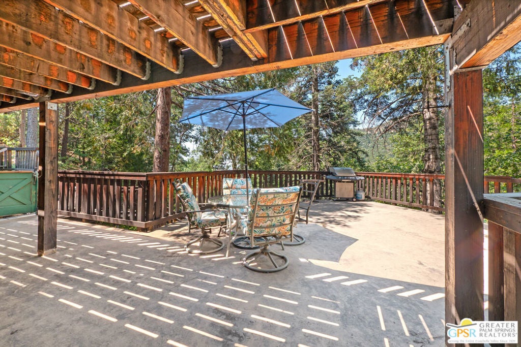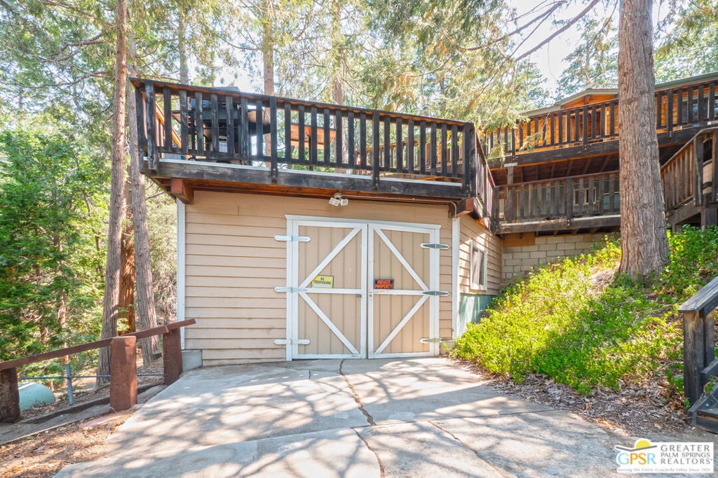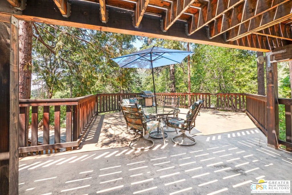 Welcome to your dream mountain home in beautiful Angelus Oaks, where you can experience all four seasons on a sprawling 42,080 sq ft lot! Nestled at the end of a cul-de-sac with two of its long driveways, this charming cabin-style home offers endless possibilities. This two-level cabin is full of character and comfort. The main level features a wrap-around upper deck perfect for enjoying the crisp mountain breeze. Imagine stepping into an inviting open floor plan, starting with a cozy living room that includes a cobblestone wood-burning fireplace, vaulted ceilings with a ceiling fan, and a kitchen area with ample cabinet space. Featuring two bedrooms with glass-mirror closets and built-in shelves, one of the bedrooms offers a skylight for additional lighting. The home also features one upgraded, beautiful marble bathroom, a tall cabinet for extra storage, and a pantry situated just off the hallway. Downstairs is a converted space, serving as a spacious 3rd bedroom, also perfect for use as a primary suite, guest room, or extra living space, complete with a walk-in closet, an additional storage closet with built-in shelves, a free-standing wood-burning stove, a ceiling fan, and tons of natural lighting. The laundry closet is also located on the lower level. Two separate entry points lead to a large lower deck ideal for entertaining or relaxing under the pines. There's even a jacuzzi hook-up ready for your future spa. Outside, you'll find a dog run and a spacious attached workshop/storage area, offering both functionality and flexibility. Enjoy the comfort of peaceful sitting areas throughout the property perfect for unwinding and soaking in the surrounding natural beauty. Ideally located just minutes from The Oaks Restaurant, The Country Store, Jenks Lake, and scenic hiking trails, with convenient access to Big Bear ski resorts and nearby towns like Redlands and Yucaipa, this mountain haven offers the perfect blend of serenity and accessibility.
