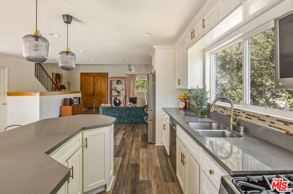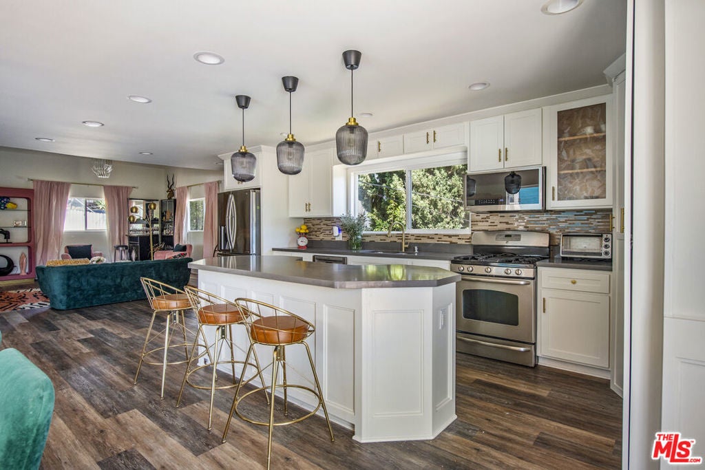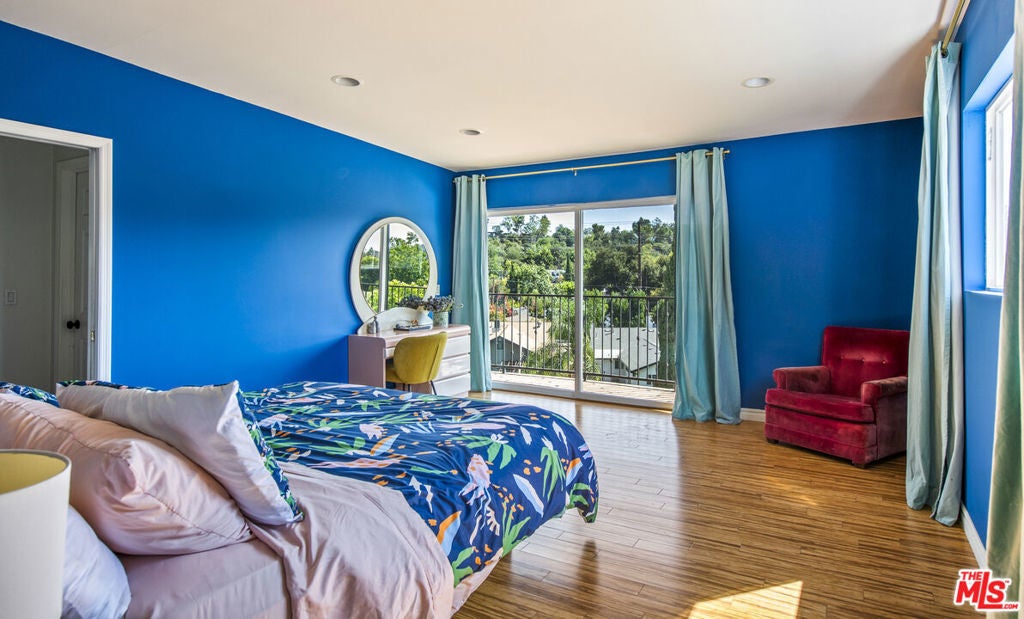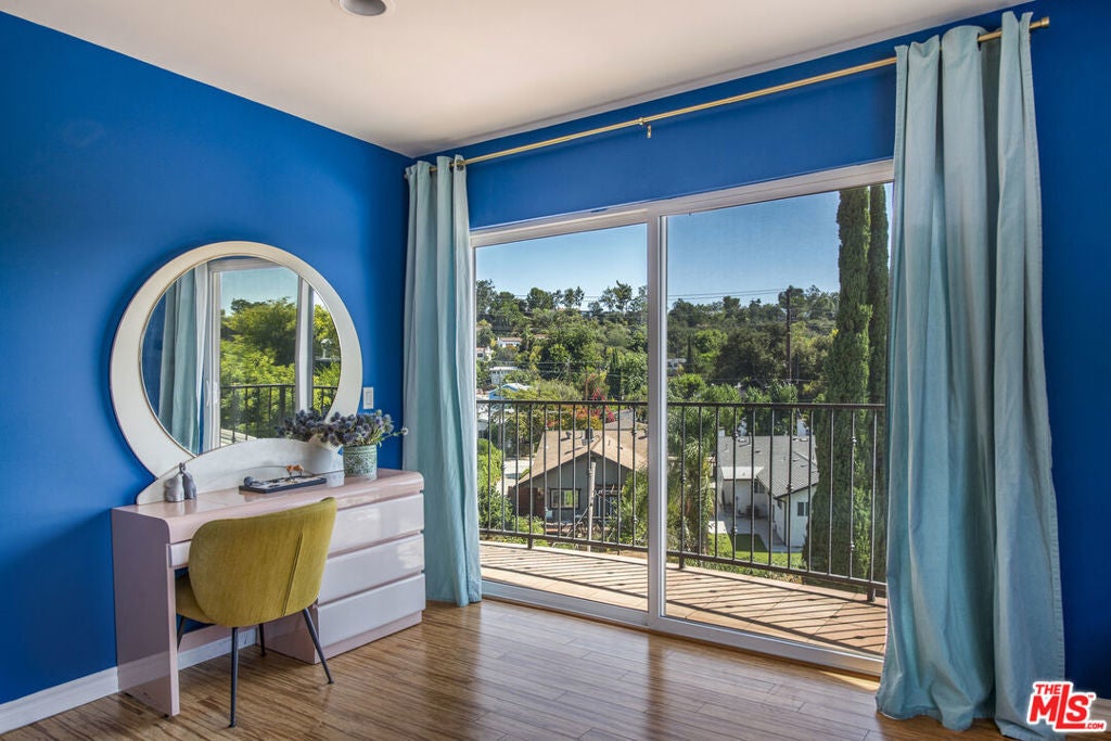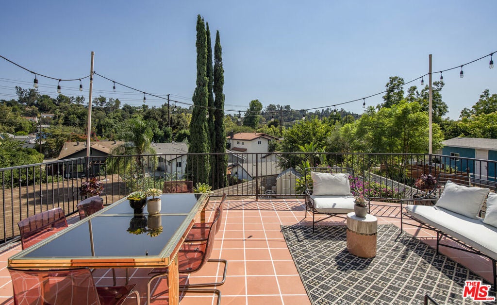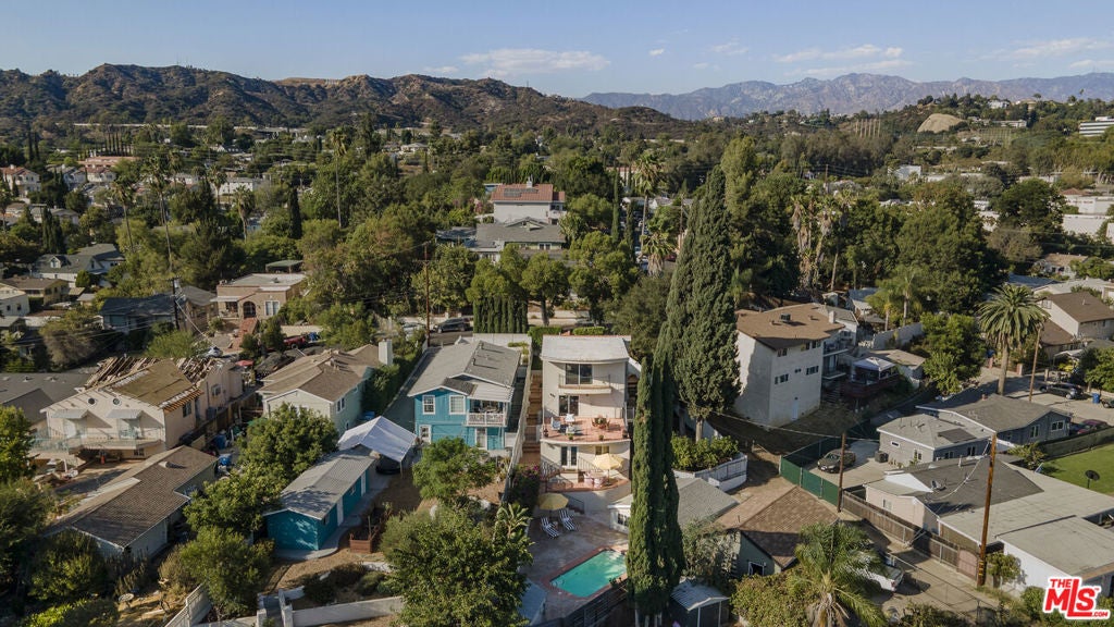 Perched high in the coveted hills of Eagle Rock, this sophisticated tri-level residence delivers privacy, drama, and sweeping skyline views. A drought-tolerant front garden leads to a shaded double-door entry, opening to soaring ceilings and a sun-drenched living room with built-ins and powder room. The newly reimagined kitchen dazzles with quartz counters, a generous island, and top-tier stainless appliances, flowing seamlessly to the dining area and expansive balcony for al fresco evenings with the city lights as your backdrop.Upstairs, the primary suite is a true retreat with its own balcony, walk-in closet, and spa-style bath featuring dual sinks, soaking tub, and glass-enclosed shower. A versatile bonus room nearby is ideal as a nursery or office. The lower level offers two additional bedrooms, a sleekly remodeled bath, and a spacious bonus room ready for a home gym, media lounge, or creative studio.Out back, an entertainer's playground awaits a sparkling pool with cabana, shaded terrace, and a lush collection of fruit trees. Multiple balconies capture the magic of indoor-outdoor California living. Just moments to Eagle Rock's prized schools, Trader Joe's, trendy cafes, and parks, this turnkey home embodies style, serenity, and location all in one.