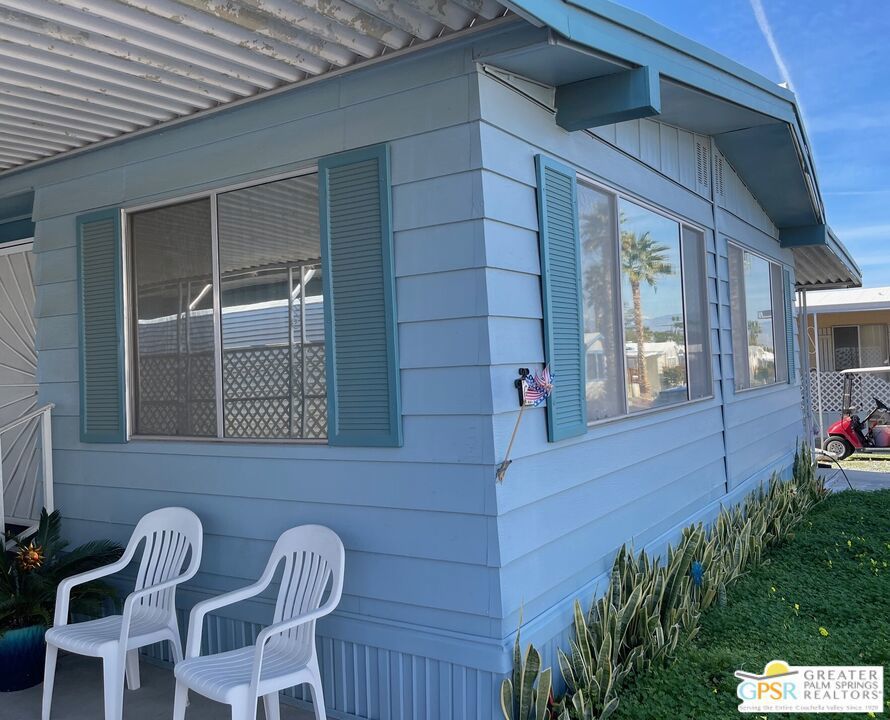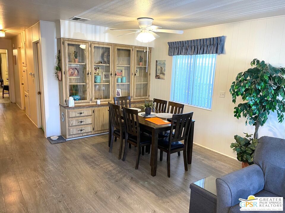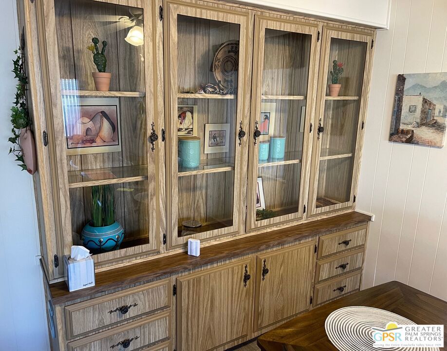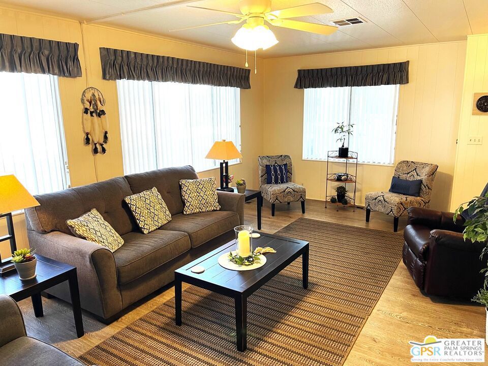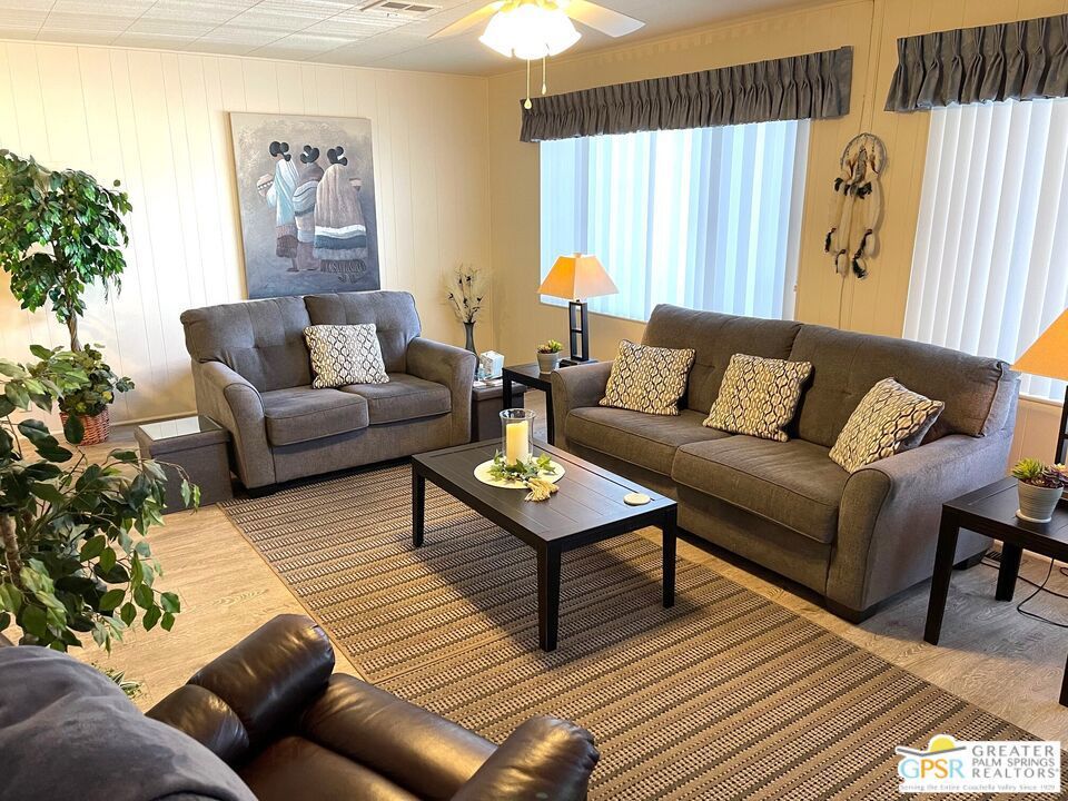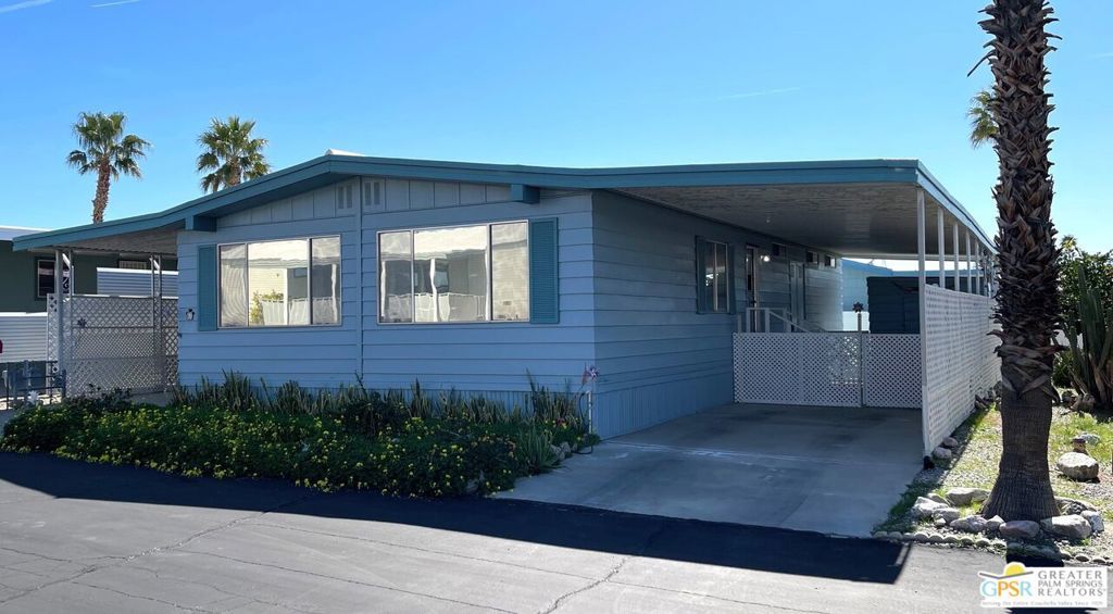 Welcome to the beautiful quaint 55+ community of Corkill Palms. This home is a beauty with several updates and it comes mostly furnished with newer quality furniture. It features 2 bedrooms and 2 baths. Both baths have newer toilets, hand rails and sink faucets. The master bedroom is quite large with attached ensuite. The kitchen features a deeper than normal sink with newer faucet making it easy for washing large items as well as a dishwasher and the gas range and refrigerator are only one year old. The living room is very spacious and wraps around to the dining area with built in China Cabinet. All windows have been tinted to help keep the summer heat out. Ceiling fans are in all rooms as well to circulate air. Several renovations have been done in the past few years. The high efficient HVAC system and Water Heater and Washer and Dryer are only 3 years old. A new fire protected foam roof with a 20 year warranty was installed a little over a year ago which will also help with energy saving. Newer carpeting in bedrooms and attractive wood laminate flooring throughout the rest of the home. There are 2 covered carports with fenced areas for your pet if you have one or for you to relax plus 2 sheds as well as a backyard area. Although this home is on fee land the land it is owed by the park owners and home owners only rent the space the home is on. Space rent is approximately $540 per month and park approval is needed before opening escrow. Buyer to verify with park manager space rent amount and any utility charge amounts passed on to home owners. Relax in the Therapeutic Natural Mineral Springs at the Clubhouse or have some fun on the putting green or in the billiard room located very close by This home is very clean and move in ready. Contact us today to set up and appointment to see this wonderful home!