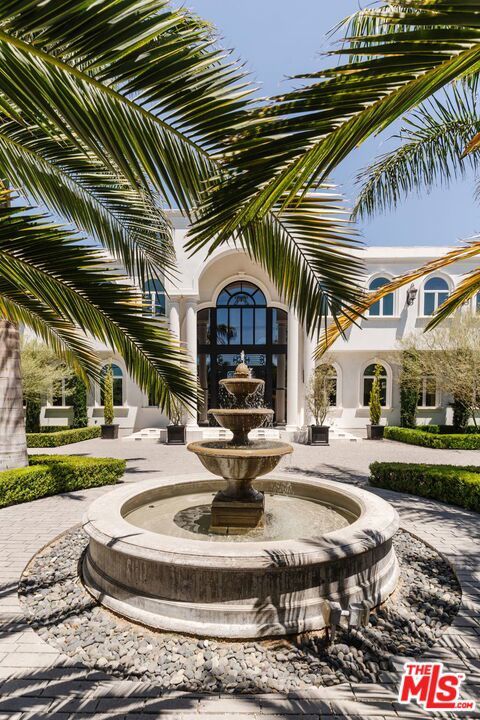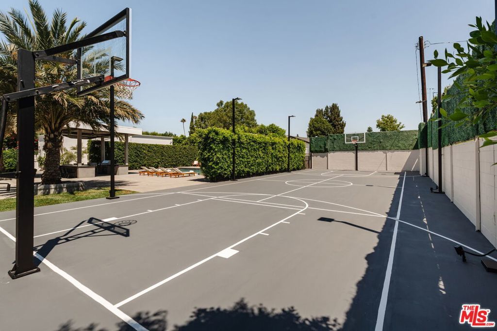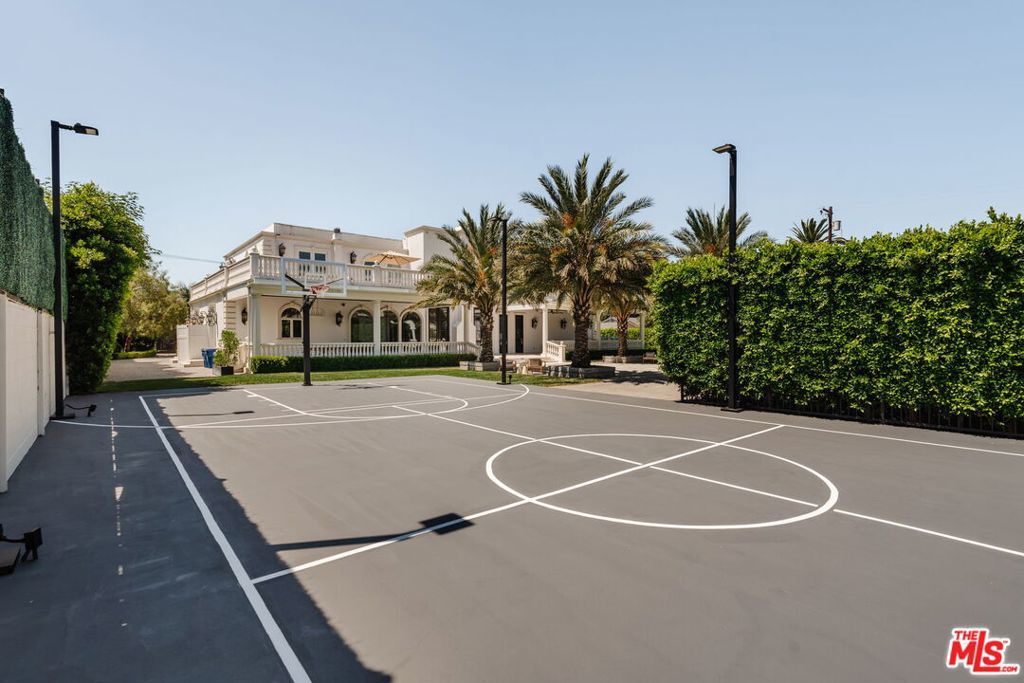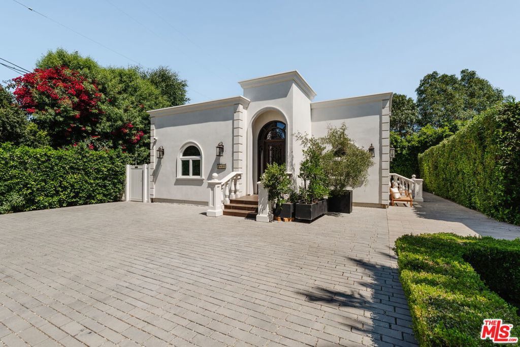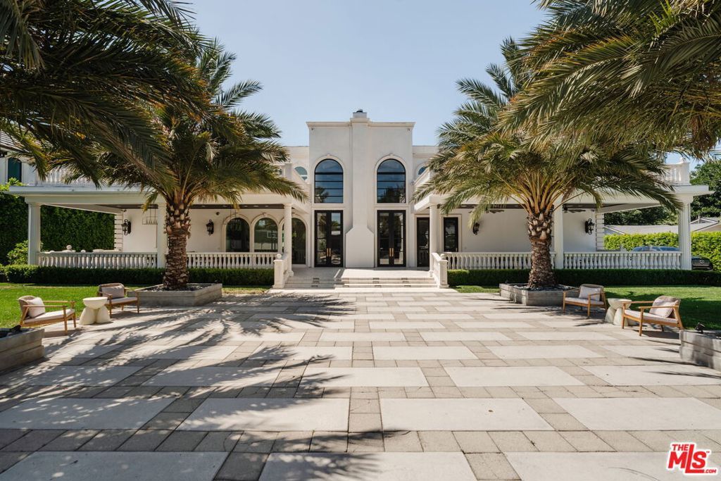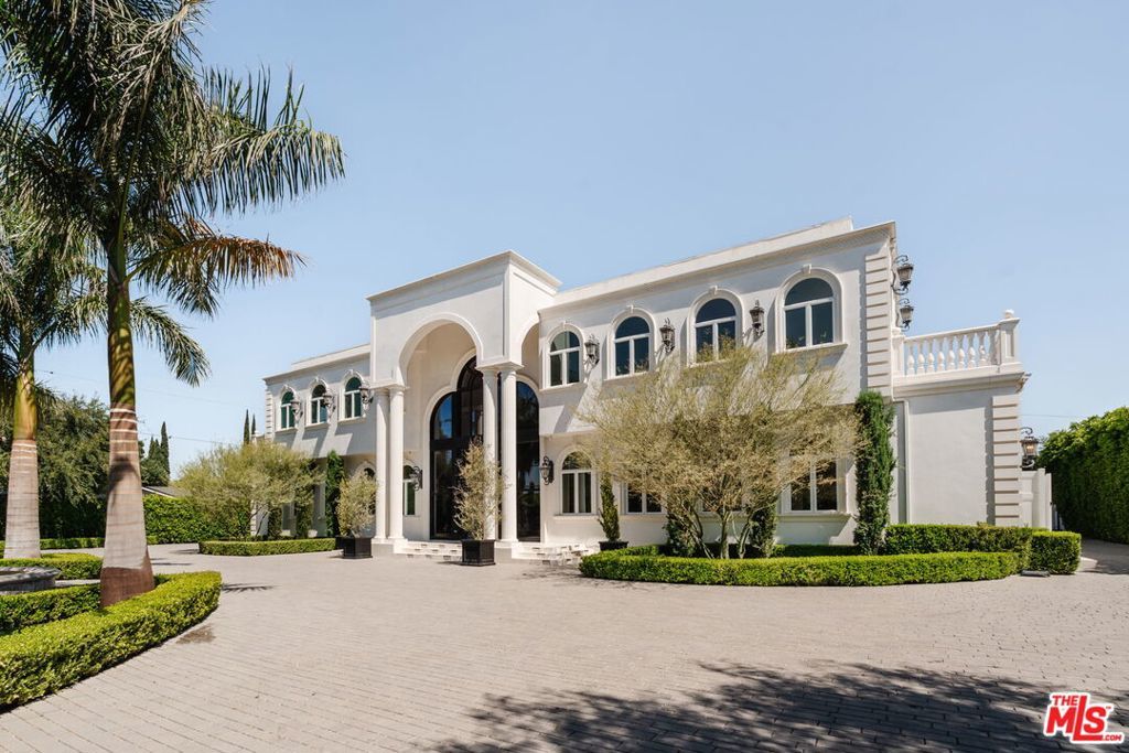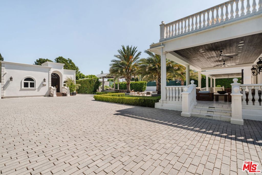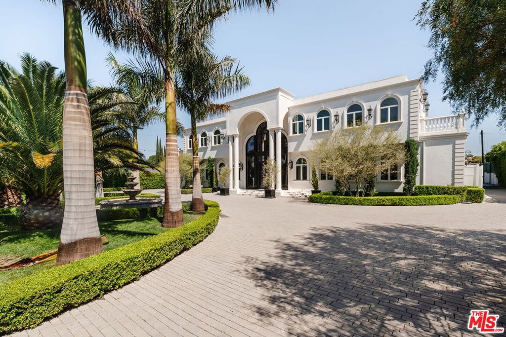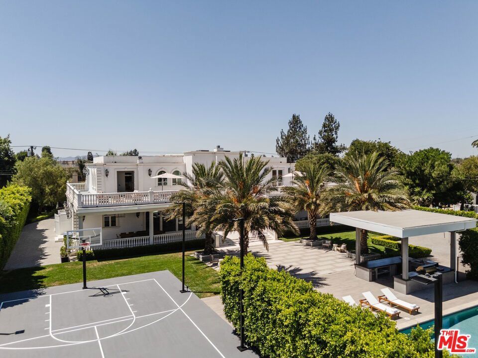 Behind double gates on nearly a flat acre, this stunning 2019-built Modern Mediterranean estate offers the scale, privacy, and elegance typically reserved for the Beverly Hills flats. With over 7,400 square feet of total living space including a detached ADU this turnkey compound was designed for luxurious living, grand-scale entertaining, and has been a highly sought-after location for film, television, and commercial shoots, generating approximately $300,000 in annual production income. From the moment you arrive, the estate impresses: a circular motor court with a stately fountain sets the stage for the dramatic double-door entry. Inside, a soaring 23-foot foyer and sweeping dual staircase create an unforgettable sense of arrival. Herringbone-patterned oak hardwood floors run throughout the main level, adding warmth and refinement. The open-concept layout includes formal living and dining rooms, a spacious great room, and a custom chef's kitchen with an oversized 8x11 island, high-end finishes, and views out to the terrace.Upstairs features three en-suite bedrooms, including a luxurious primary suite privately located in its own wing. This retreat offers a spacious bedroom, his and hers baths, dual walk-in closets, a private balcony, and an adjoining sitting room or home office ideal for relaxation, remote work, or creative pursuits. The main level also includes a guest suite, powder room, and laundry room, with a second laundry conveniently located upstairs. Step outside to a true backyard oasis designed for year-round enjoyment. A sparkling pool and spa are anchored by a full outdoor kitchen, cabana, covered dining area, fire features, and a full-size basketball/sports court. Surrounded by mature palms and lush landscaping, the outdoor areas offer privacy, scale, and the perfect setting for both entertaining and everyday living.The detached 1,190 sq ft ADU with its own address includes two bedrooms, two bathrooms, a full kitchen, living room, and private yard. Whether for guests, extended family, staff, or rental income, it adds tremendous versatility to the property. A finished four-car garage and gated driveway provide ample parking for multiple vehicles, RV, boat, or production crews.Located just minutes from Encino and the 405, this rare offering combines designer-level detail, resort-style amenities, flexible living, and substantial income potential all on a grand scale. It's not just a home it's a private compound ready to live, host, or create in.