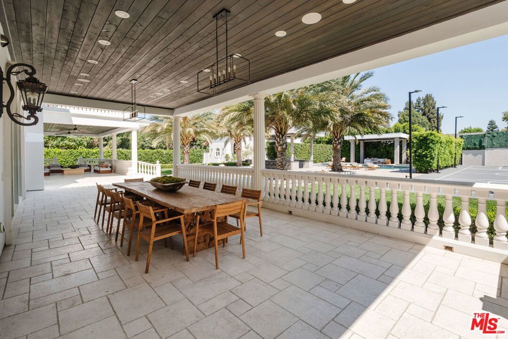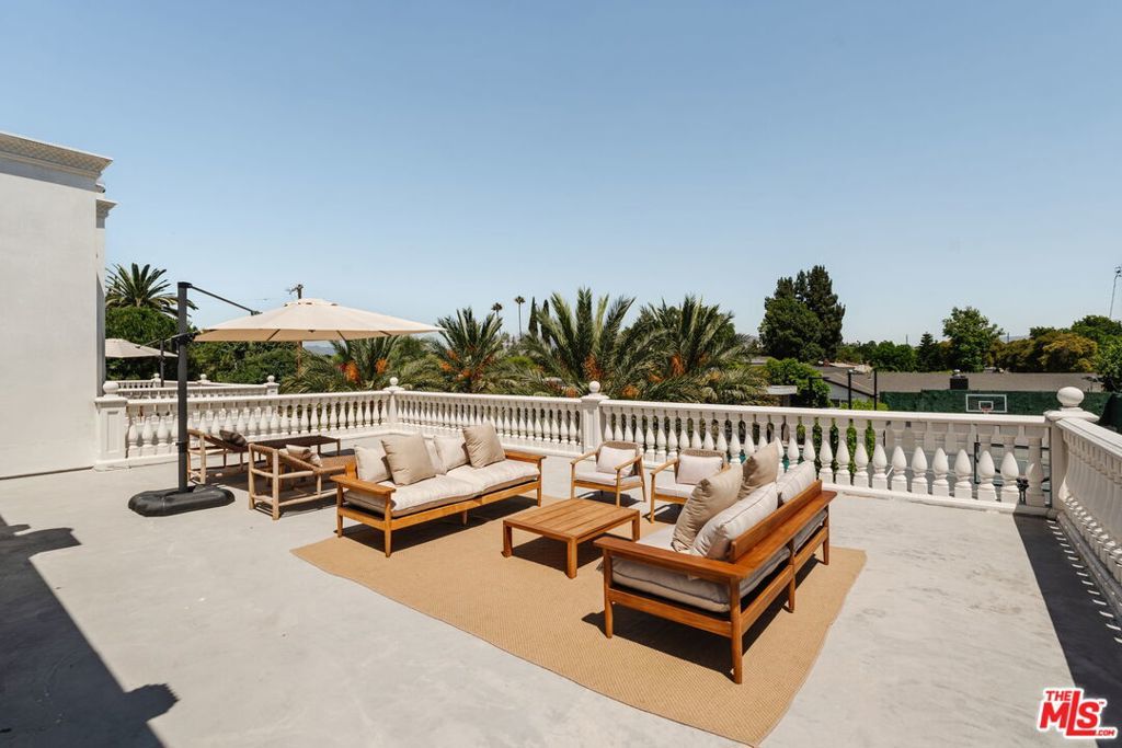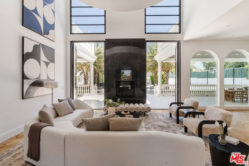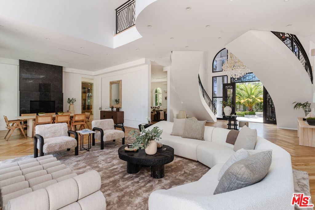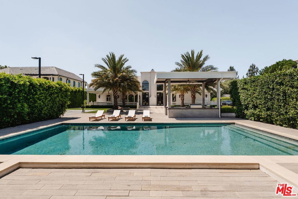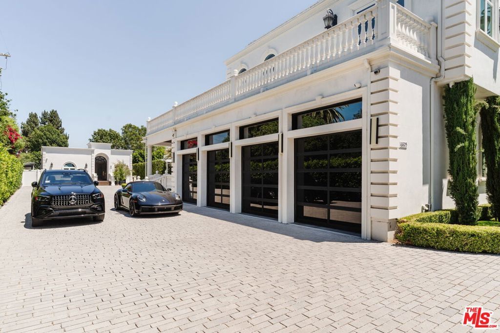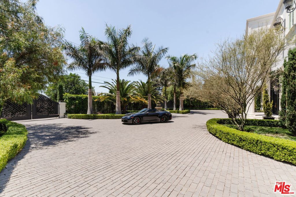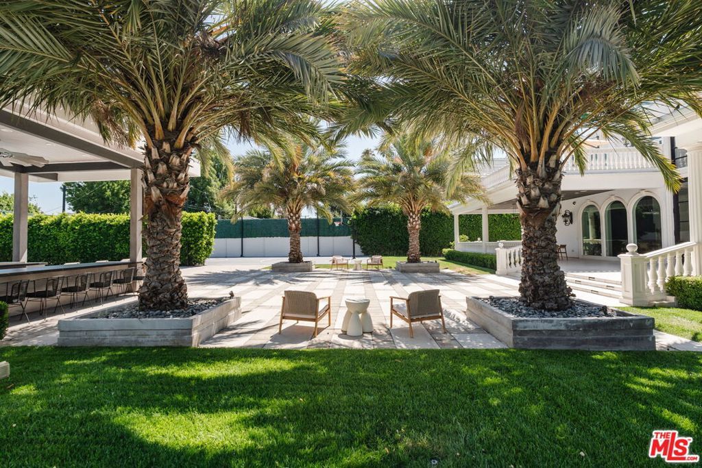 Behind double gates on nearly a flat acre, this stunning 2019-built Modern Mediterranean estate offers the scale, privacy, and elegance typically reserved for the Beverly Hills flats. With over 7,400 square feet of total living space including a detached ADU this turnkey compound was designed for luxurious living, grand-scale entertaining, and has been a highly sought-after location for film, television, and commercial shoots, generating approximately $300,000 in annual production income. From the moment you arrive, the estate impresses: a circular motor court with a stately fountain sets the stage for the dramatic double-door entry. Inside, a soaring 23-foot foyer and sweeping dual staircase create an unforgettable sense of arrival. Herringbone-patterned oak hardwood floors run throughout the main level, adding warmth and refinement. The open-concept layout includes formal living and dining rooms, a spacious great room, and a custom chef's kitchen with an oversized 8x11 island, high-end finishes, and views out to the terrace.Upstairs features three en-suite bedrooms, including a luxurious primary suite privately located in its own wing. This retreat offers a spacious bedroom, his and hers baths, dual walk-in closets, a private balcony, and an adjoining sitting room or home office ideal for relaxation, remote work, or creative pursuits. The main level also includes a guest suite, powder room, and laundry room, with a second laundry conveniently located upstairs. Step outside to a true backyard oasis designed for year-round enjoyment. A sparkling pool and spa are anchored by a full outdoor kitchen, cabana, covered dining area, fire features, and a full-size basketball/sports court. Surrounded by mature palms and lush landscaping, the outdoor areas offer privacy, scale, and the perfect setting for both entertaining and everyday living.The detached 1,190 sq ft ADU with its own address includes two bedrooms, two bathrooms, a full kitchen, living room, and private yard. Whether for guests, extended family, staff, or rental income, it adds tremendous versatility to the property. A finished four-car garage and gated driveway provide ample parking for multiple vehicles, RV, boat, or production crews.Located just minutes from Encino and the 405, this rare offering combines designer-level detail, resort-style amenities, flexible living, and substantial income potential all on a grand scale. It's not just a home it's a private compound ready to live, host, or create in.