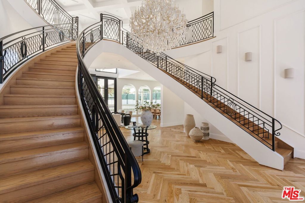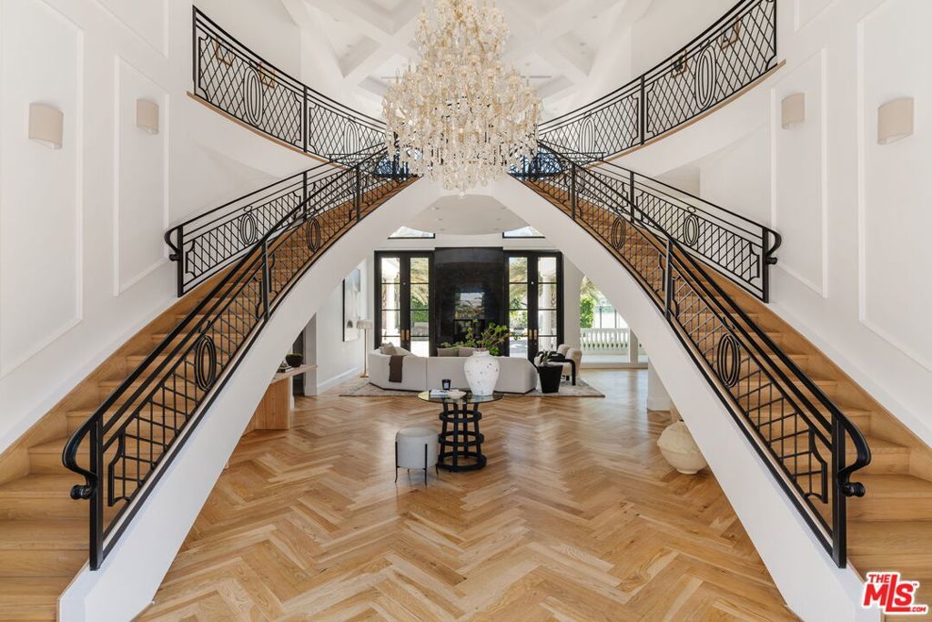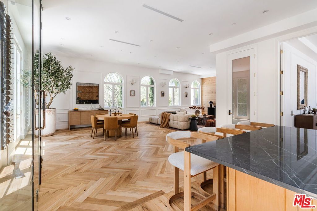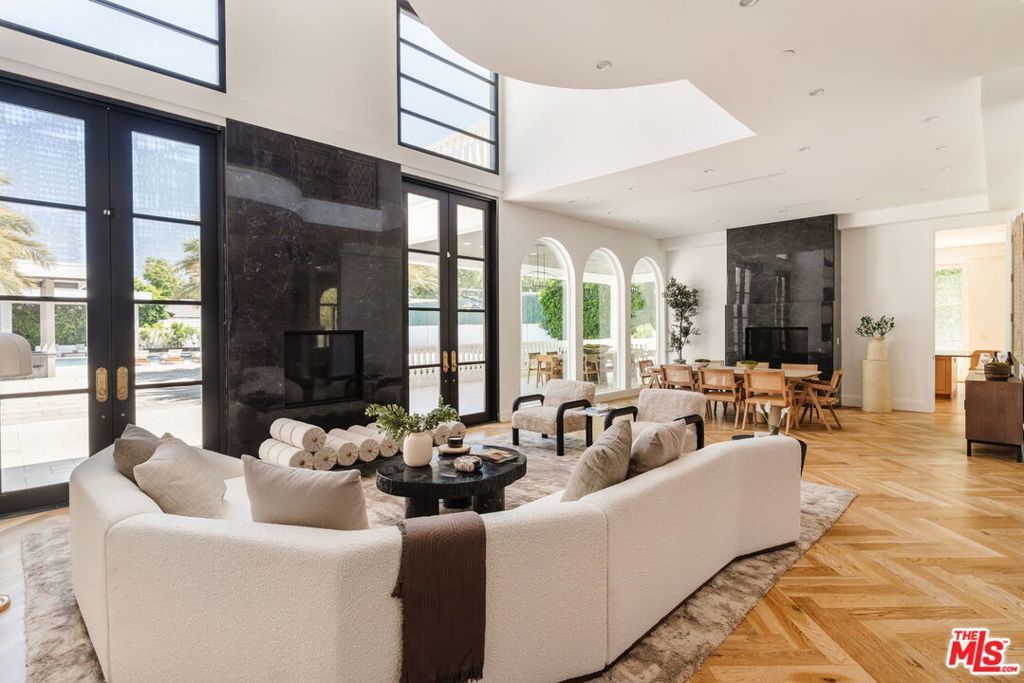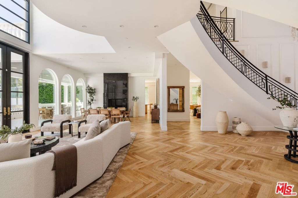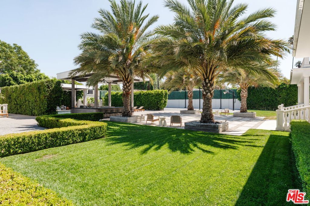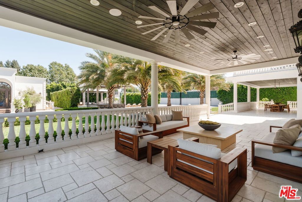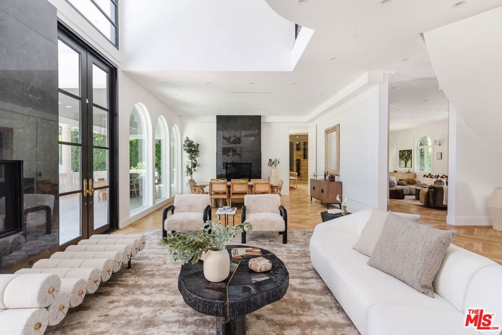 Behind double gates on nearly a flat acre, this stunning 2019-built Modern Mediterranean estate offers the scale, privacy, and elegance typically reserved for the Beverly Hills flats. With over 7,400 square feet of total living space including a detached ADU this turnkey compound was designed for luxurious living, grand-scale entertaining, and has been a highly sought-after location for film, television, and commercial shoots, generating approximately $300,000 in annual production income. From the moment you arrive, the estate impresses: a circular motor court with a stately fountain sets the stage for the dramatic double-door entry. Inside, a soaring 23-foot foyer and sweeping dual staircase create an unforgettable sense of arrival. Herringbone-patterned oak hardwood floors run throughout the main level, adding warmth and refinement. The open-concept layout includes formal living and dining rooms, a spacious great room, and a custom chef's kitchen with an oversized 8x11 island, high-end finishes, and views out to the terrace.Upstairs features three en-suite bedrooms, including a luxurious primary suite privately located in its own wing. This retreat offers a spacious bedroom, his and hers baths, dual walk-in closets, a private balcony, and an adjoining sitting room or home office ideal for relaxation, remote work, or creative pursuits. The main level also includes a guest suite, powder room, and laundry room, with a second laundry conveniently located upstairs. Step outside to a true backyard oasis designed for year-round enjoyment. A sparkling pool and spa are anchored by a full outdoor kitchen, cabana, covered dining area, fire features, and a full-size basketball/sports court. Surrounded by mature palms and lush landscaping, the outdoor areas offer privacy, scale, and the perfect setting for both entertaining and everyday living.The detached 1,190 sq ft ADU with its own address includes two bedrooms, two bathrooms, a full kitchen, living room, and private yard. Whether for guests, extended family, staff, or rental income, it adds tremendous versatility to the property. A finished four-car garage and gated driveway provide ample parking for multiple vehicles, RV, boat, or production crews.Located just minutes from Encino and the 405, this rare offering combines designer-level detail, resort-style amenities, flexible living, and substantial income potential all on a grand scale. It's not just a home it's a private compound ready to live, host, or create in.
