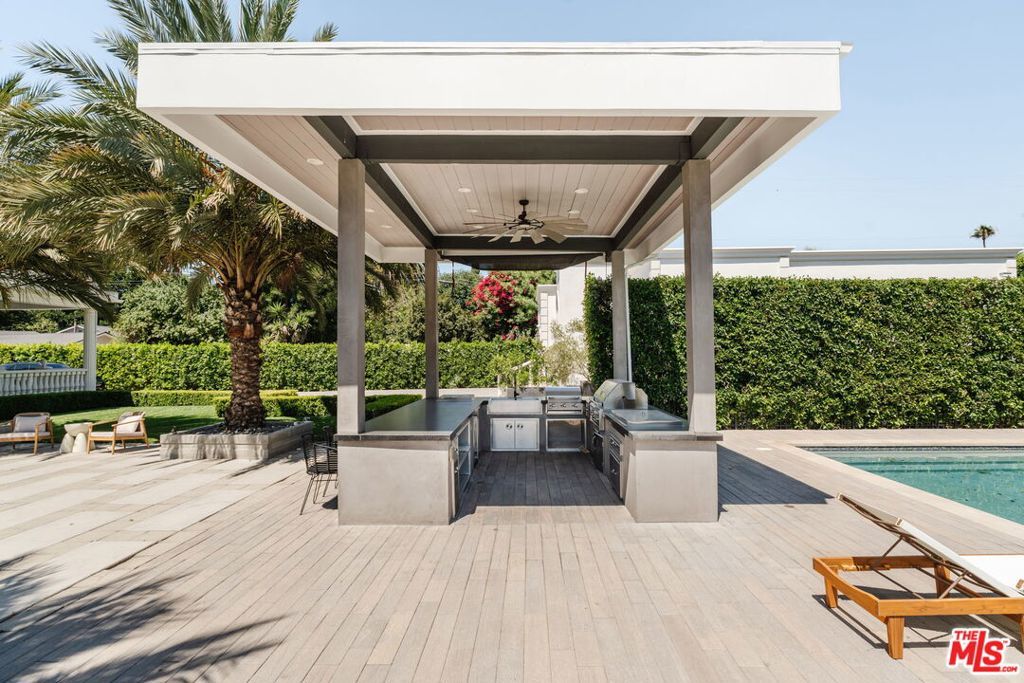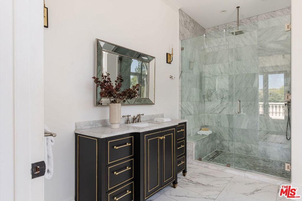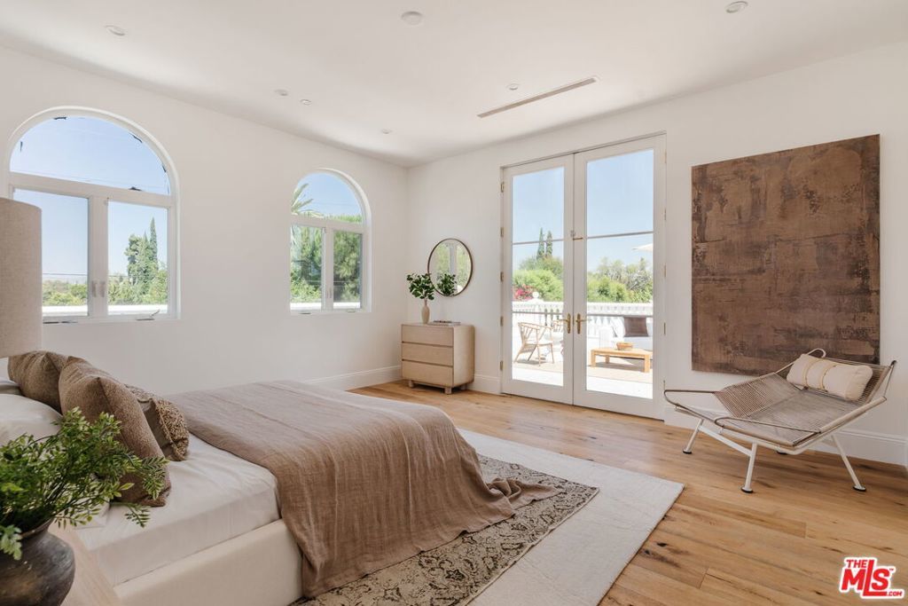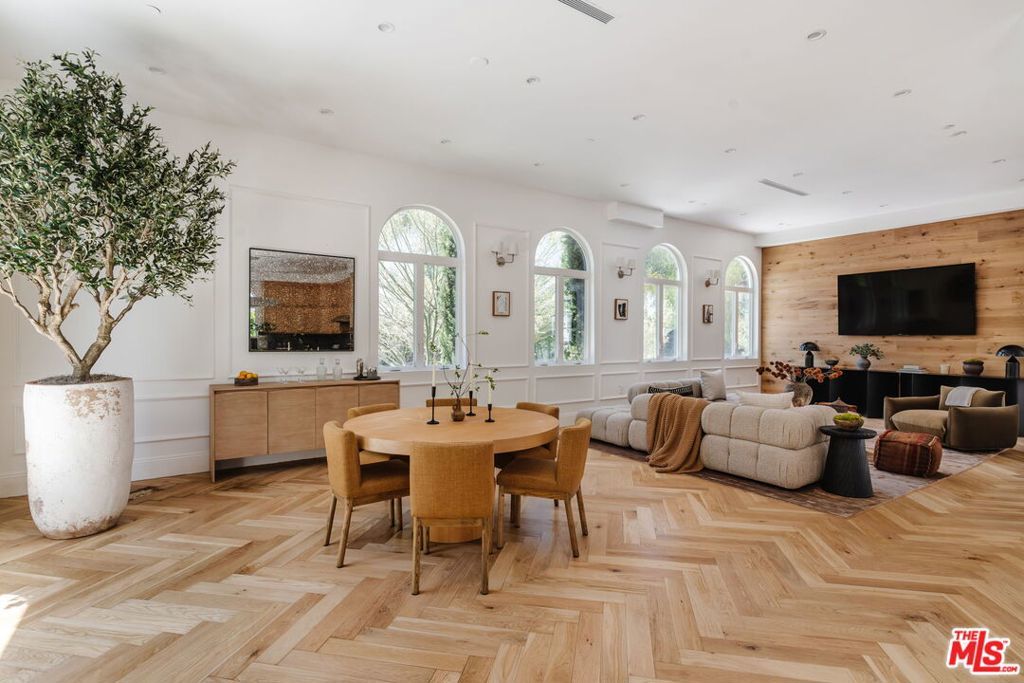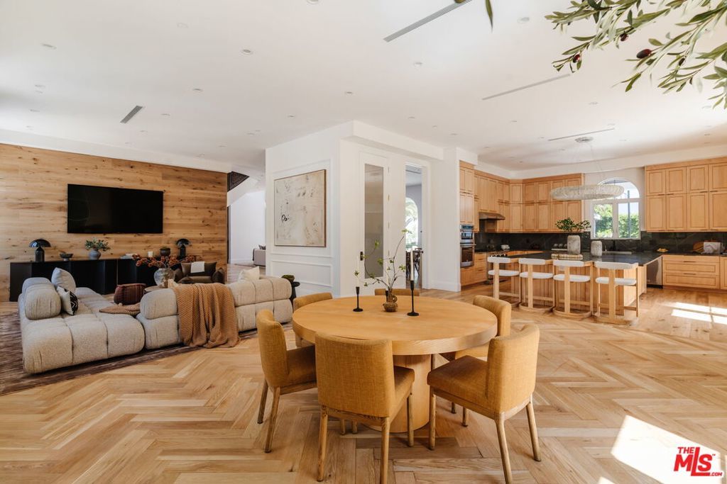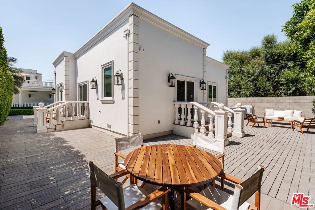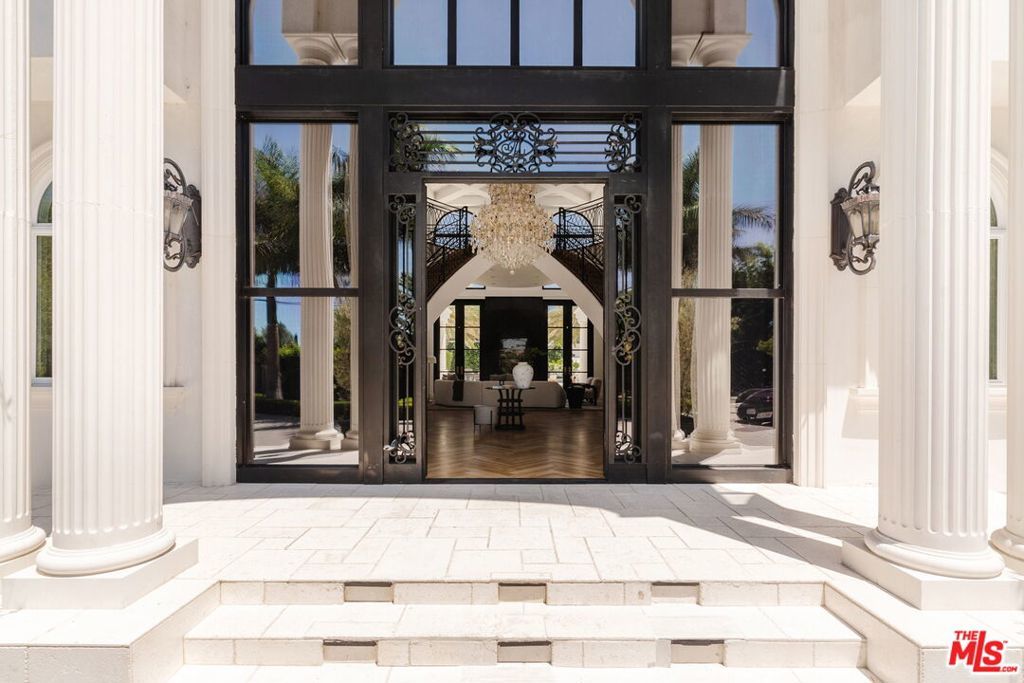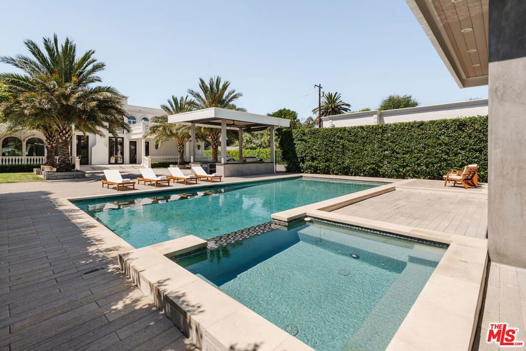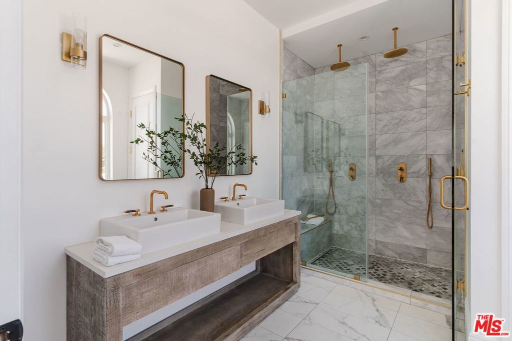 Behind double gates on nearly a flat acre, this stunning 2019-built Modern Mediterranean estate offers the scale, privacy, and elegance typically reserved for the Beverly Hills flats. With over 7,400 square feet of total living space including a detached ADU this turnkey compound was designed for luxurious living, grand-scale entertaining, and has been a highly sought-after location for film, television, and commercial shoots, generating approximately $300,000 in annual production income. From the moment you arrive, the estate impresses: a circular motor court with a stately fountain sets the stage for the dramatic double-door entry. Inside, a soaring 23-foot foyer and sweeping dual staircase create an unforgettable sense of arrival. Herringbone-patterned oak hardwood floors run throughout the main level, adding warmth and refinement. The open-concept layout includes formal living and dining rooms, a spacious great room, and a custom chef's kitchen with an oversized 8x11 island, high-end finishes, and views out to the terrace.Upstairs features three en-suite bedrooms, including a luxurious primary suite privately located in its own wing. This retreat offers a spacious bedroom, his and hers baths, dual walk-in closets, a private balcony, and an adjoining sitting room or home office ideal for relaxation, remote work, or creative pursuits. The main level also includes a guest suite, powder room, and laundry room, with a second laundry conveniently located upstairs. Step outside to a true backyard oasis designed for year-round enjoyment. A sparkling pool and spa are anchored by a full outdoor kitchen, cabana, covered dining area, fire features, and a full-size basketball/sports court. Surrounded by mature palms and lush landscaping, the outdoor areas offer privacy, scale, and the perfect setting for both entertaining and everyday living.The detached 1,190 sq ft ADU with its own address includes two bedrooms, two bathrooms, a full kitchen, living room, and private yard. Whether for guests, extended family, staff, or rental income, it adds tremendous versatility to the property. A finished four-car garage and gated driveway provide ample parking for multiple vehicles, RV, boat, or production crews.Located just minutes from Encino and the 405, this rare offering combines designer-level detail, resort-style amenities, flexible living, and substantial income potential all on a grand scale. It's not just a home it's a private compound ready to live, host, or create in.