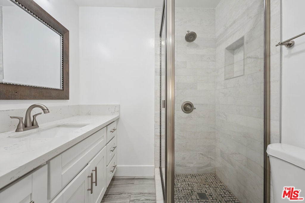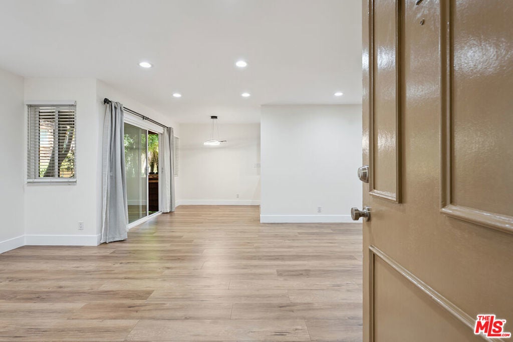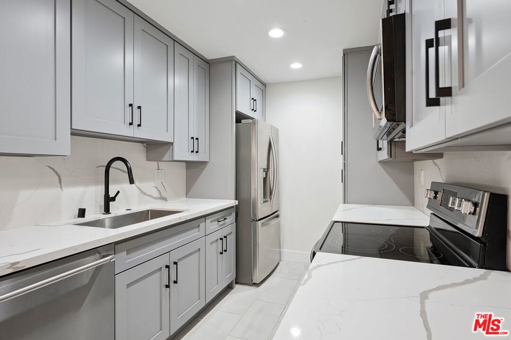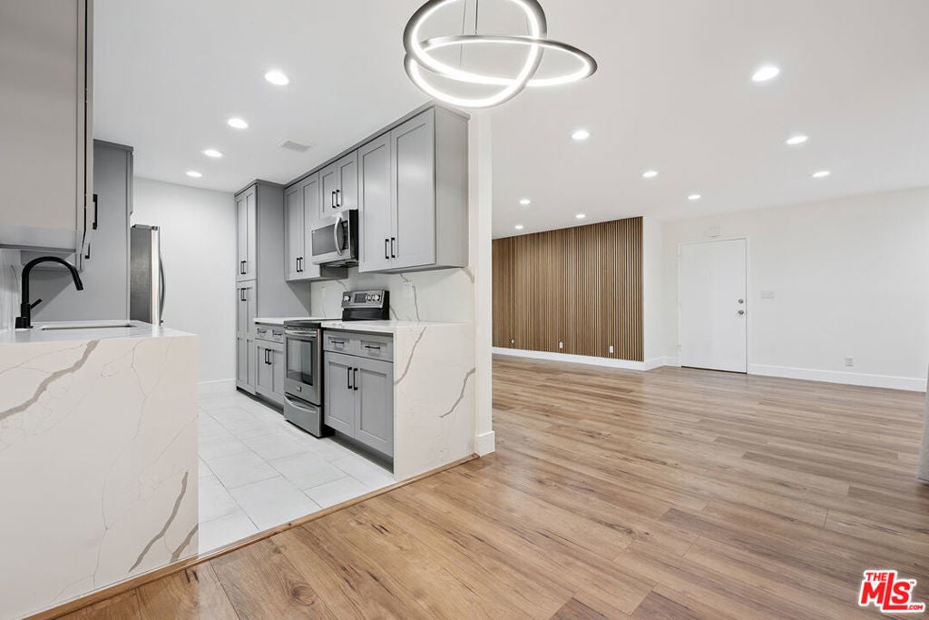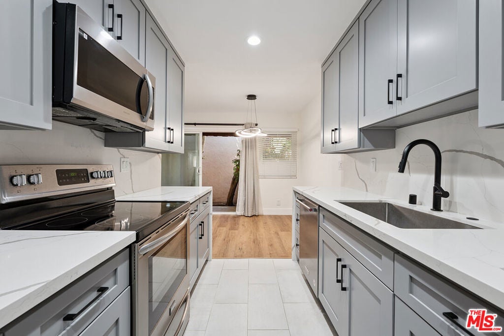 Welcome to this fully remodeled 2BR 2BA first floor unit in the Newcastle Manor Condo Association. This stylish unit features new waterproof laminate flooring throughout, recessed lighting throughout, fully updated kitchen with stainless steel appliances and quartz countertops. Primary bedroom with recessed lighting, walk-in closet and updated bathroom. Large guest bedroom with recessed lighting and a wide closet. This unit features one of the buildings 4 extra large covered patios, great for hanging out or gardening. This is one of the larger 2 bedroom floorplans with a large living area that can be set up in multiple ways, great for entertaining. Easy first floor access near the lobby. 2 covered tandem parking spaces. Association amenities include a recently replastered sparkling pool, fitness room, laundry room, gated parking and controlled access.