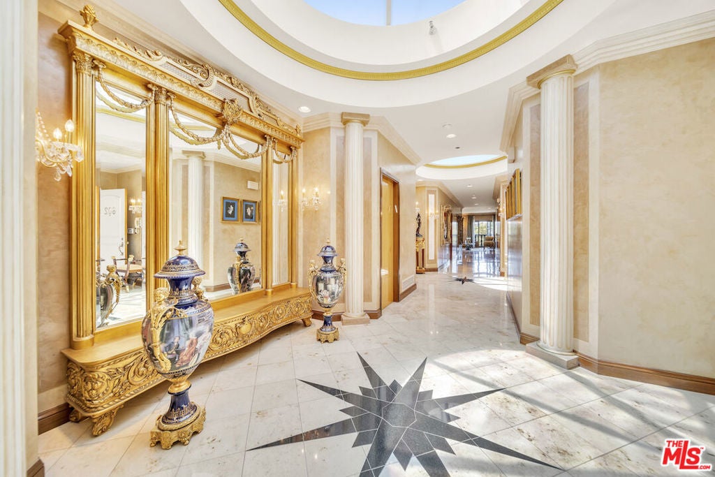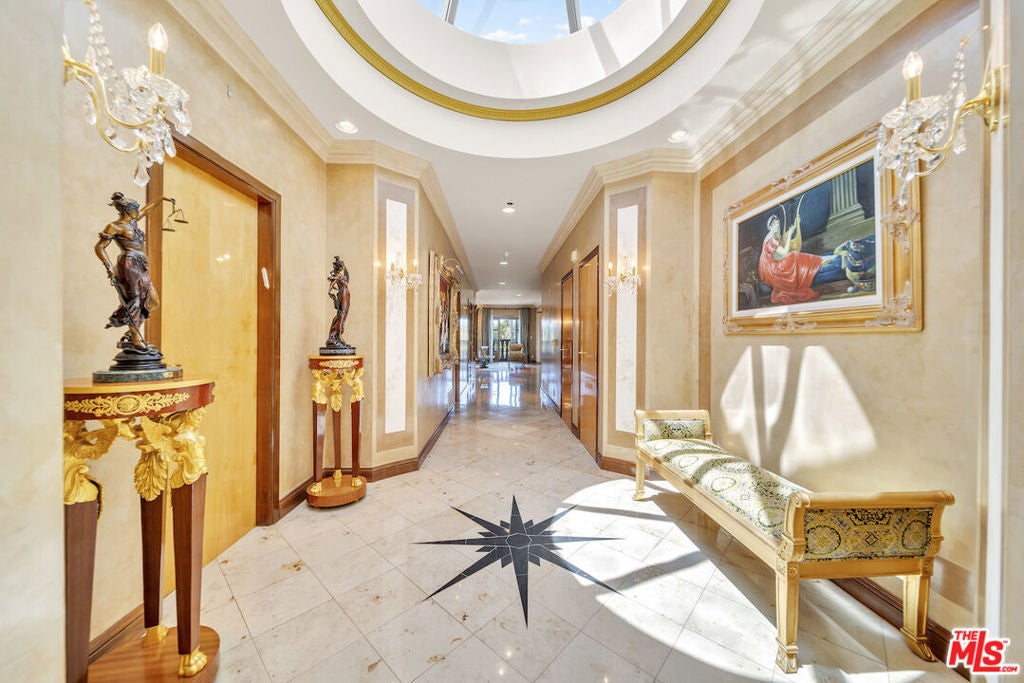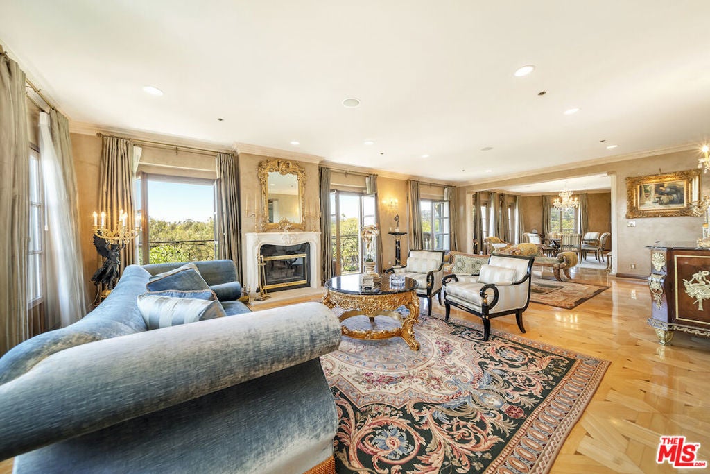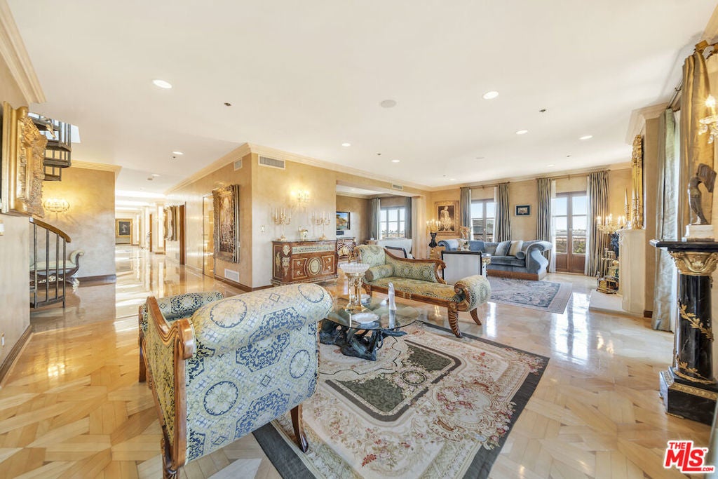 This regal penthouse in the iconic Le Faubourg building, which has been home to celebrities, offers over 5,300 sq ft of impressive unobstructed panoramic views from Beverly Hills to Downtown LA. This penthouse offers privacy and high security. 6 bedrooms, 7.5 baths, 4 fireplaces, a large chef's kitchen, formal living room with wet bar, formal dining room, library, separate service entrance and 3 dramatic pyramid skylights, flood the penthouse with natural light. The oversized primary suite includes two fireplaces, a sitting area, large walk in cedar closets and an opulent marble bath. French doors lead to multiple balconies, while a spiral staircase leads to the private rooftop, spanning over 700 sq ft, overlooking Beverly Hills and beyond. Full-service luxury begins when you pull into the driveway and are greeted by an onsite valet. Additional amenities include a large private storage room, 24-hour doormen, concierge, security, pool/spa and gym. Moments from Rodeo Drive, Sunset Blvd, and everything Beverly Hills has to offer. A rare opportunity to own this landmark Beverly Hills Penthouse in the world- famous 90210.