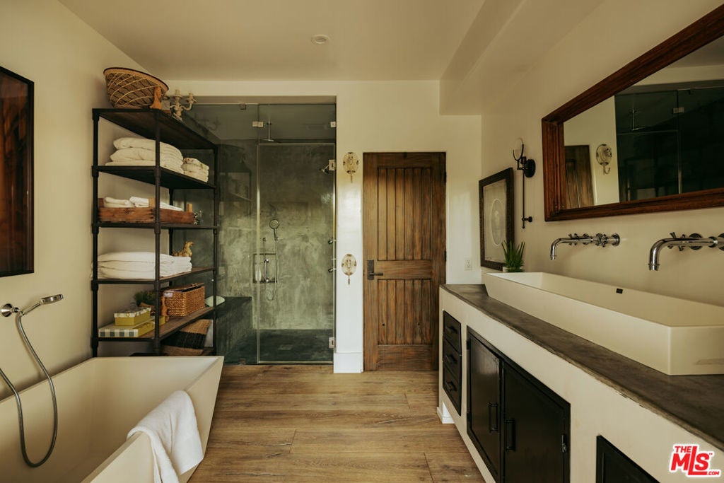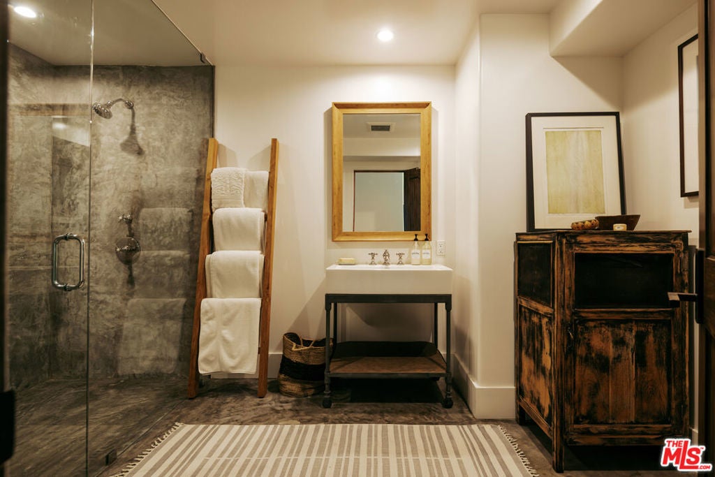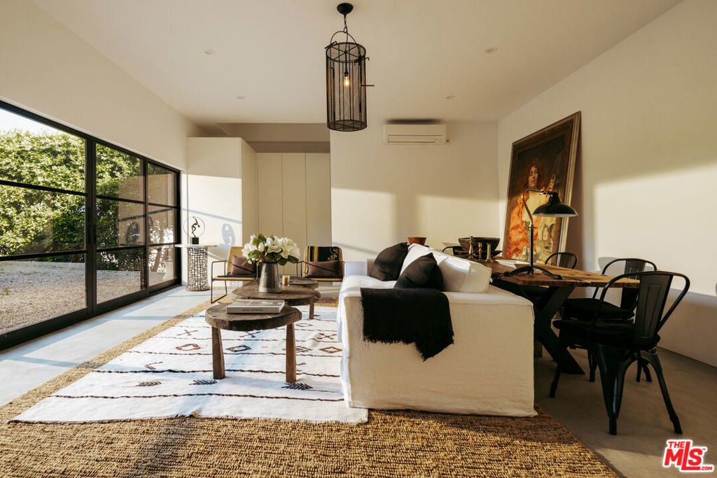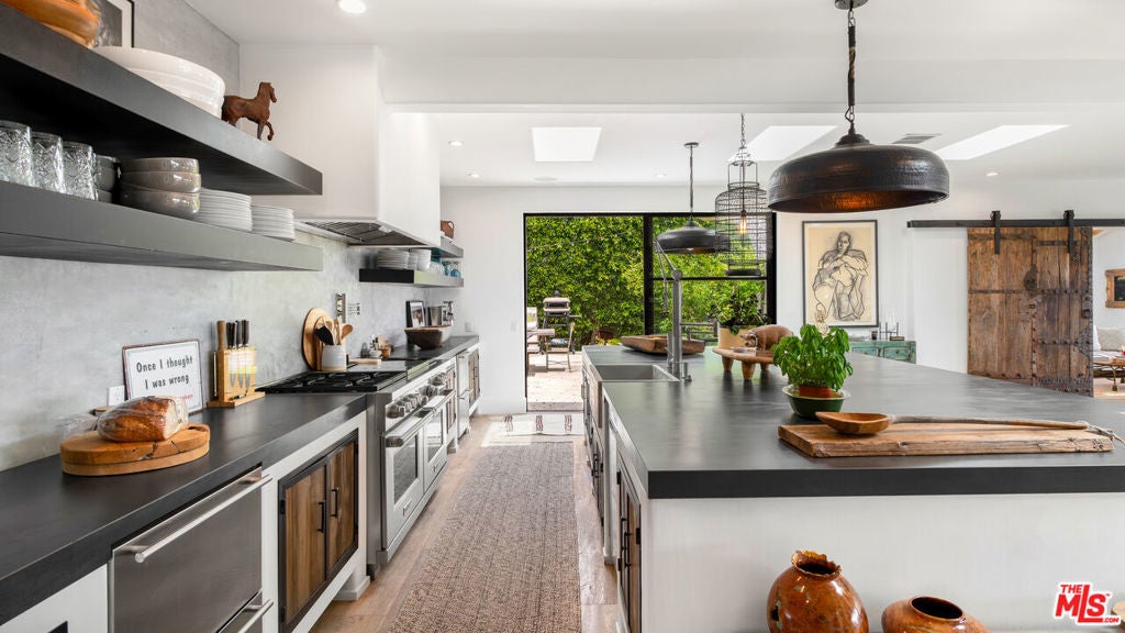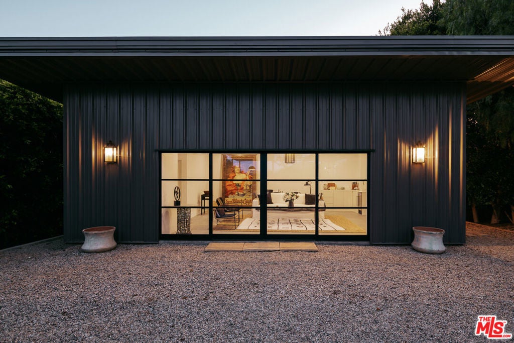 Tucked behind mature hedging on one of Malibu's most desirable streets, this exquisite estate presents a striking blend of California modernism and rustic refinement. Completely reimagined with an emphasis on natural light, flow, and function, the property exudes a sense of serenity from the moment you arrive. Anchored by clean lines and framed by mature trees, the residence features a contemporary stucco exterior with sharp geometric rooflines and walls of glass that open to expansive grounds. Inside, the interiors unfold with organic warmth where wide-plank oak floors, beamed ceilings, vintage fixtures, and antique doors create a soulful counterbalance to the home's modern architecture. The heart of the home is a sunlit great room with soaring ceilings and disappearing walls of glass that open onto a lush green lawn and shimmering pool. Thoughtfully layered seating areas surround a central fireplace, while oversized iron chandeliers cast a warm glow overhead. The adjacent dining room framed by oversized sliders and a pair of reclaimed wood barn doors effortlessly connects to the gourmet kitchen. Designed for both utility and aesthetic impact, the kitchen features a massive center island with stone countertops, custom wood cabinetry, and open shelving, all illuminated by industrial pendant lighting. The primary suite is a haven of texture and tranquility, with a romantic canopy bed, hand-finished plaster walls, and direct access to the pool deck. A curated mix of woven textures, soft linens, and patinated wood imbue the space with an effortless global elegance. Beyond the main residence, the grounds unfold into a spectacular lifestyle setting. A sleek lap pool with integrated spa is flanked by sun loungers and bordered by lush privacy hedges. Tiered gardens bloom with vibrant plantings, and a thoughtfully designed dining terrace invites open-air meals beneath the trees. A fully realized edible garden, complete with raised beds and fruiting trees, enhances the property's sense of abundance and connection to nature. Nestled just beyond the garden, a beautifully finished guest house offers a peaceful retreat for visitors or an inspiring studio space. Featuring polished concrete floors, steel-framed glass doors, and warm natural textures throughout, the guest house evokes quiet luxury and lives like a private sanctuary perfect for work, creativity, or extended stays. Modern yet soulful, expansive yet intimate, this Winding Way estate offers a rare balance of architecture, landscape, and lifestyle just minutes from the beaches and boutiques of Malibu's eastern coastline.