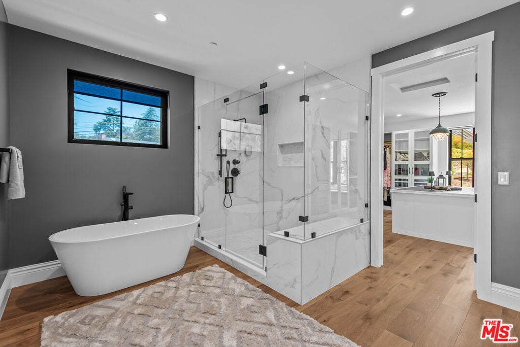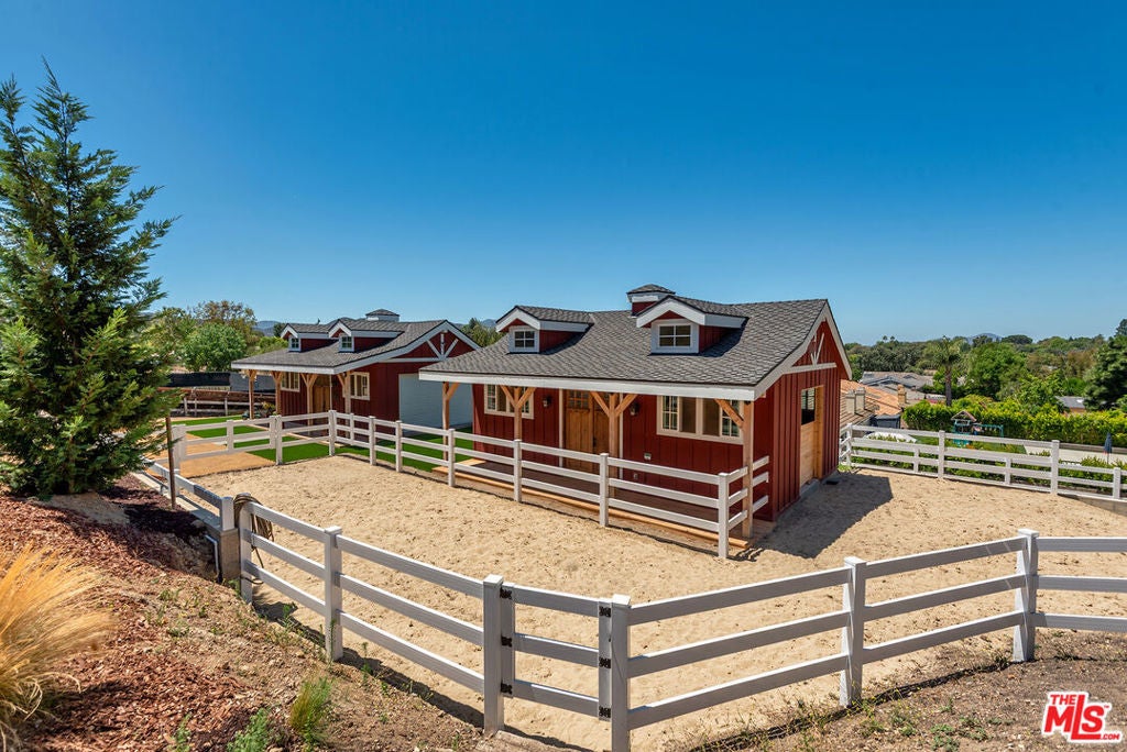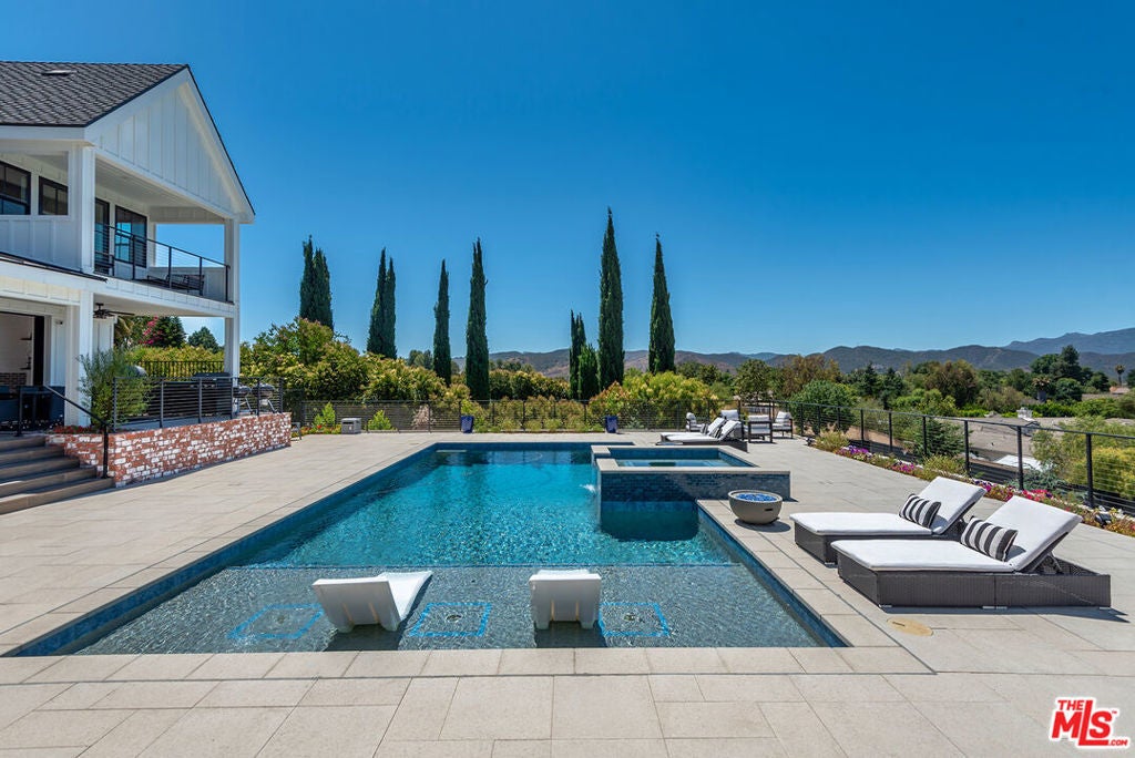 Experience luxury country living in this stunning modern farmhouse estate atop a gated acre in Thousand Oaks. With panoramic canyon and mountain views, this equestrian property blends rustic charm and contemporary design featuring 2story vaulted ceilings, wide plank floors, steel-framed windows, and designer finishes. The open layout connects a state-of-the-art chef's kitchen to light-filled living spaces with sliding pocket doors that lead to a resort-style backyard with pool, spa, fire pit, pool house, plus an outdoor kitchen with pizza oven, BBQ, and smokers. Wonderful primary retreat with sumptuous bath, large walk-in closet w/ center island and private balcony overlooking views. 3 additional en suite bedrooms upstairs. Equestrian amenities include fenced paddock, 2 unfinished barns ideal for tack room/horse stalls, and trail access. An office, maids/guest suite, mini putting green and a fully equipped 1 bed +1 bath rec room with kitchen completes this rare trophy estate just minutes from the city.