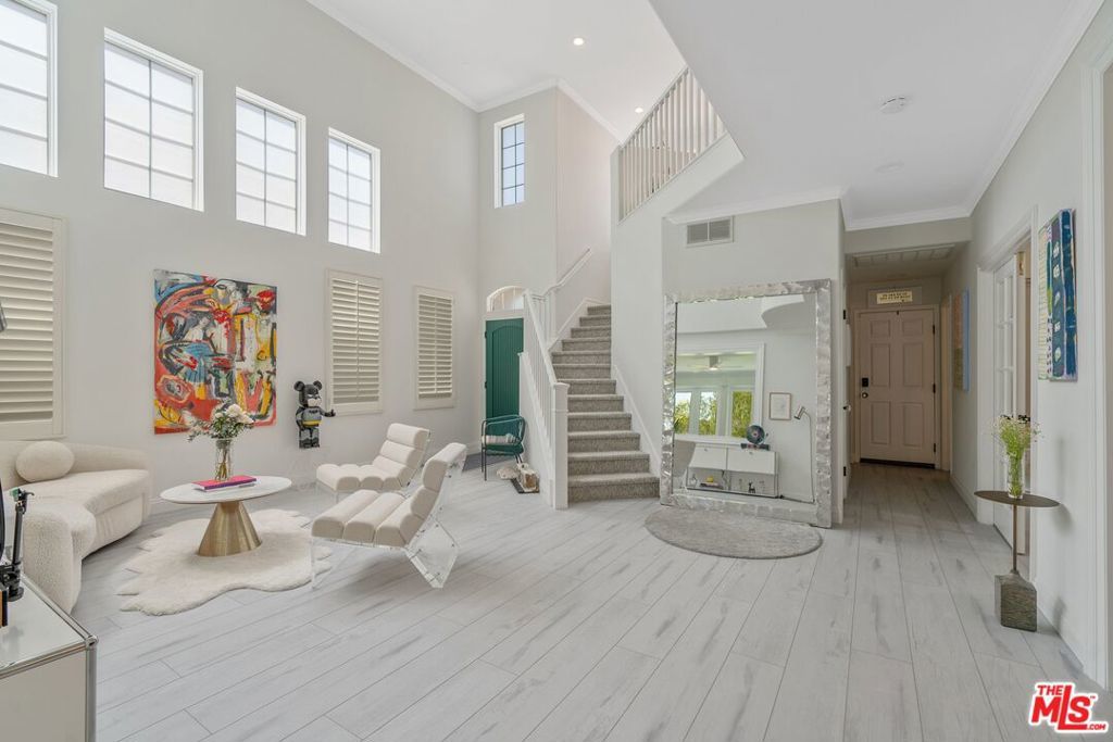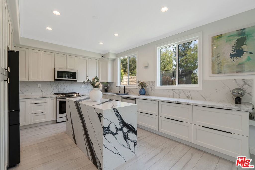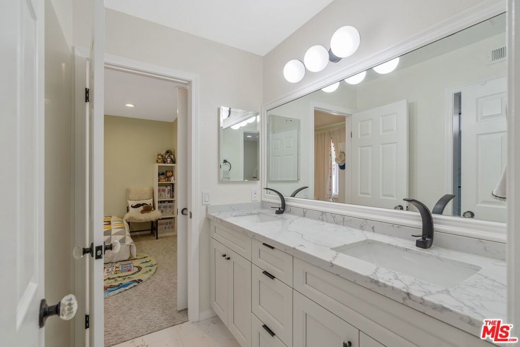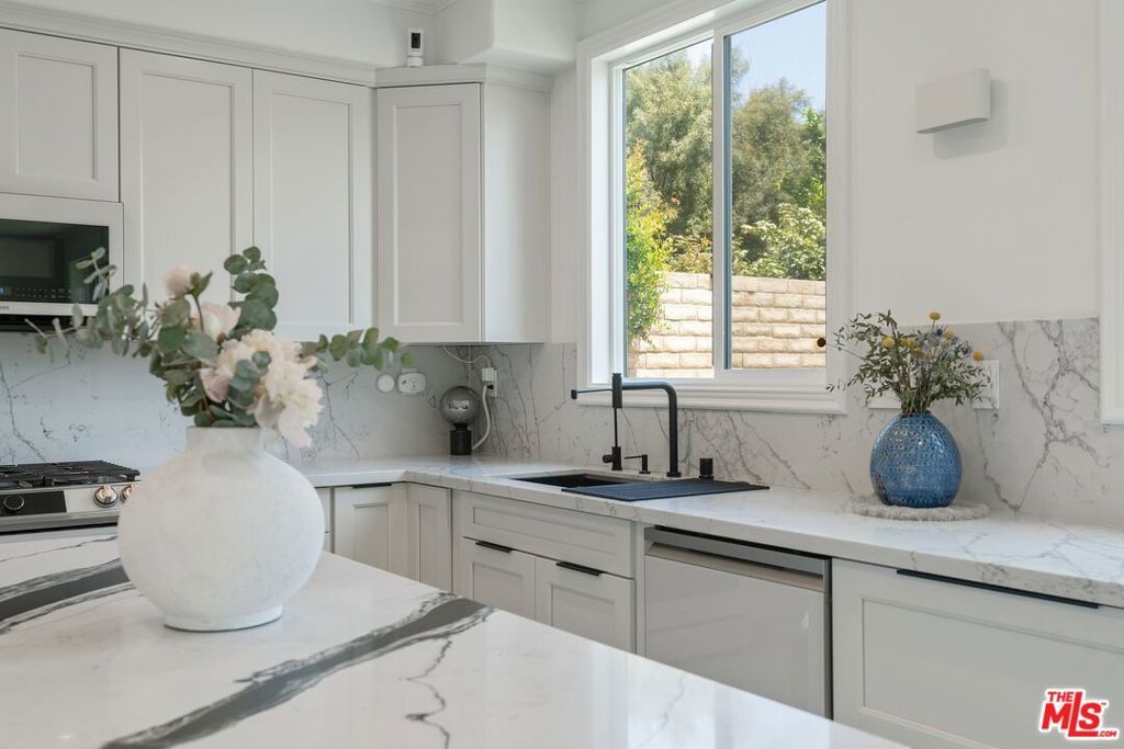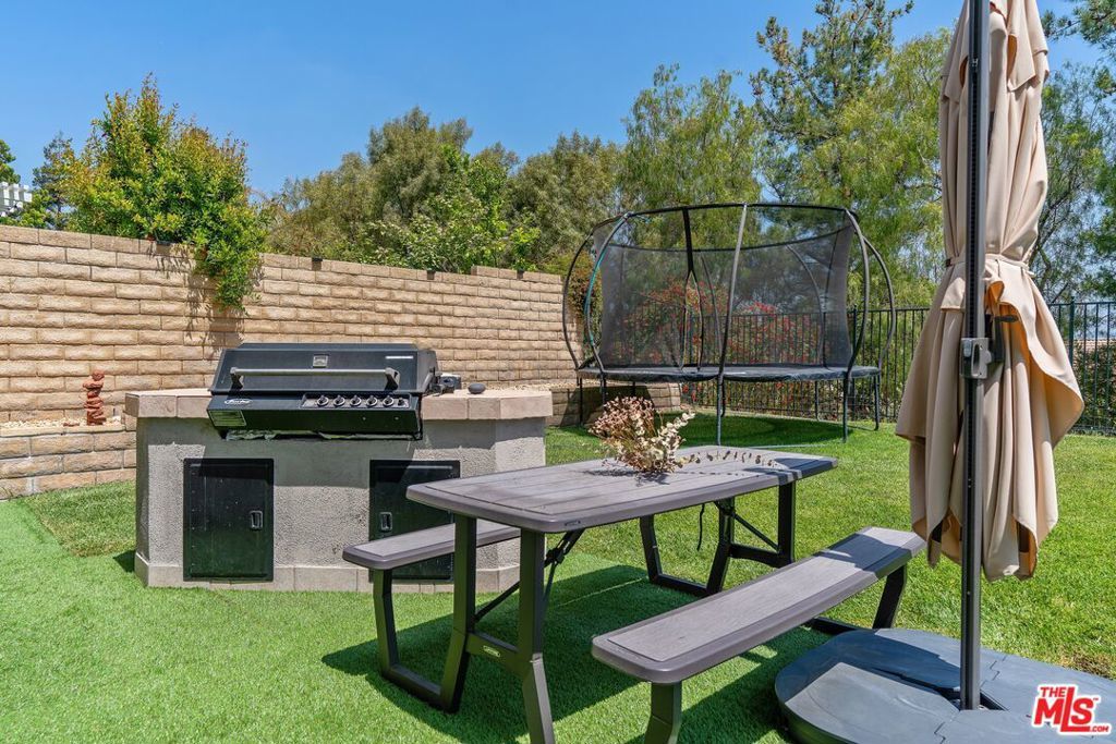 Welcome Home! This ultra-modern interior styled property within the established neighborhood of Stevenson Ranch offers an open floor plan, high-end black & white interior throughout the house gives clean, sleek, sophisticated vibe, with tons of natural light and warmth. Renovations completed in 2024, elegant hardwood flooring, new carpet with heavy padding for comfort and noise reduction, LED lights throughout the house, custom mini bar built-in with wine cooler and draft beer dispenser, all new kitchen appliances, double washer and double dryer, all counters throughout have the look of fine marble with durable ceramic material for easy usage and maintenance. House fan works to pull in air from outside to circulate inside air and cooking odors quickly. Custom audio system in the living room perfect for entertaining. The backyard has built-in bbq, with stunning mountain view for hours of enjoyment and relaxation.