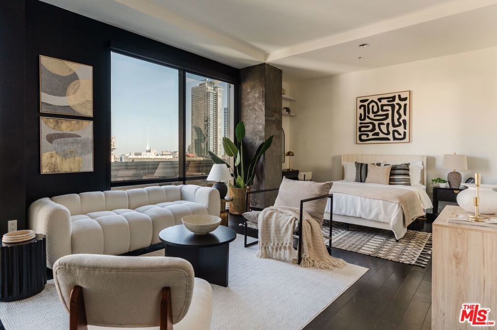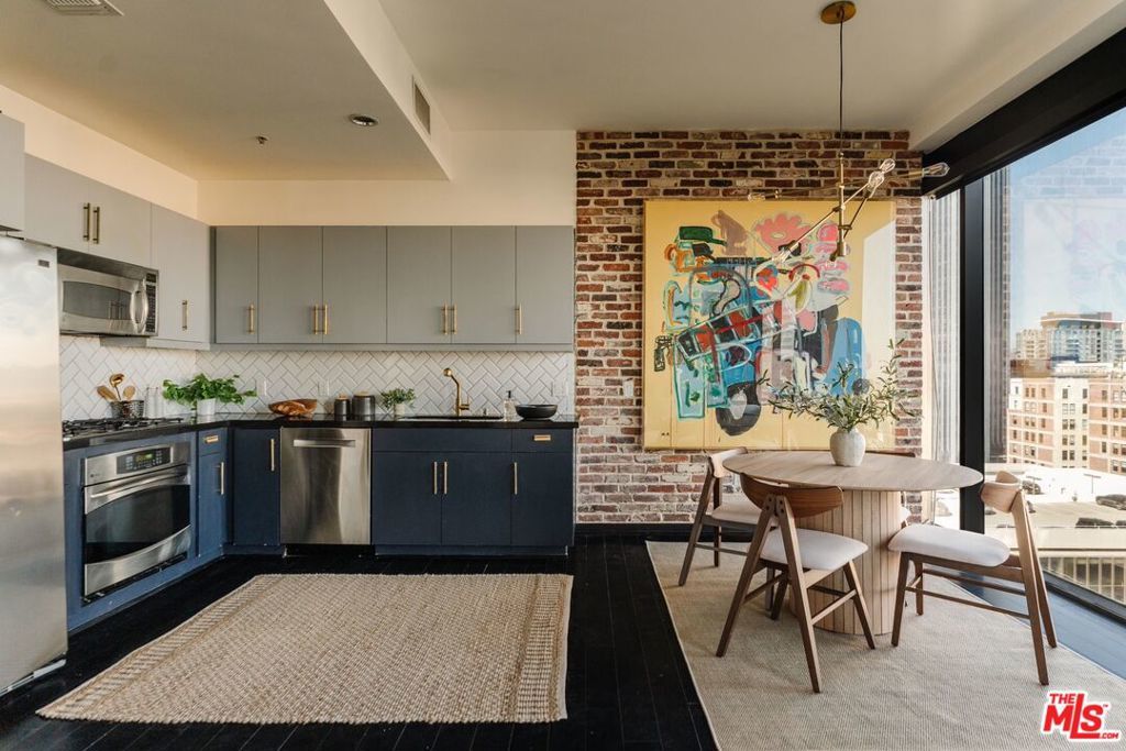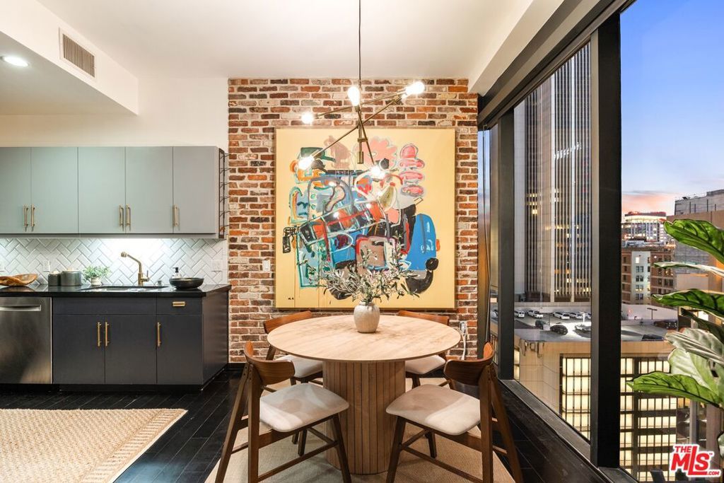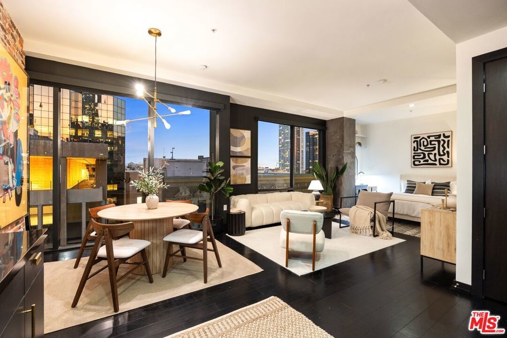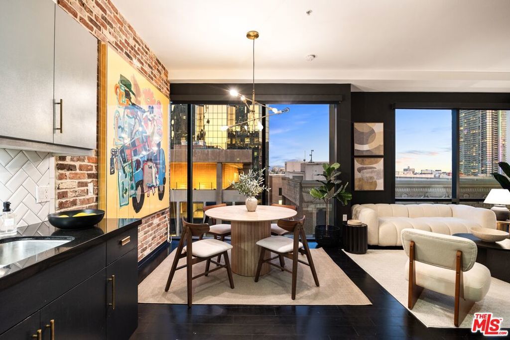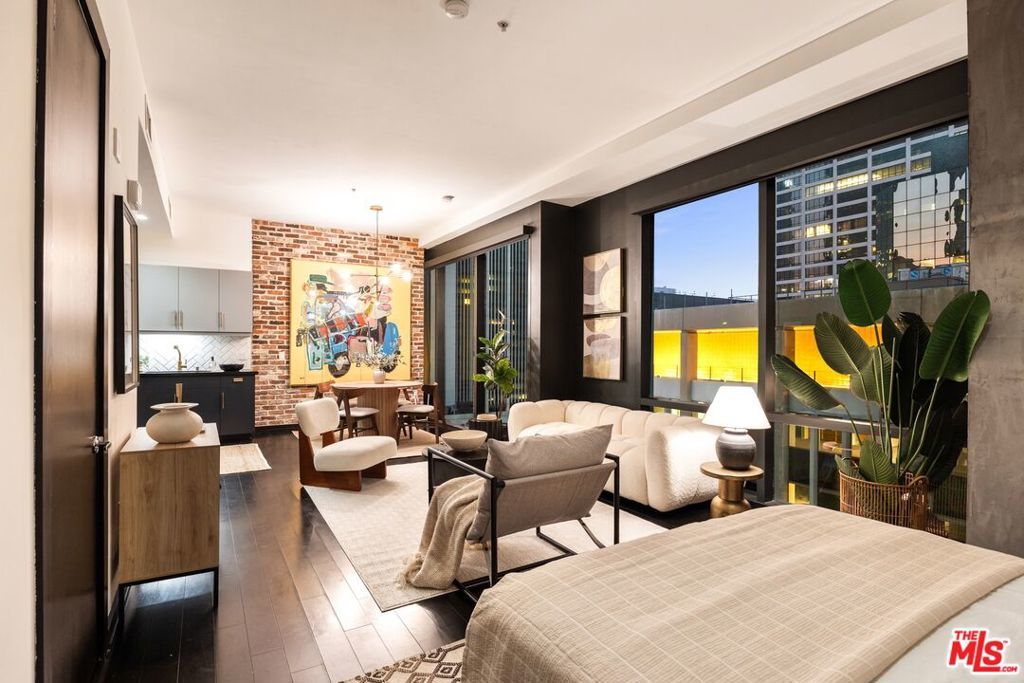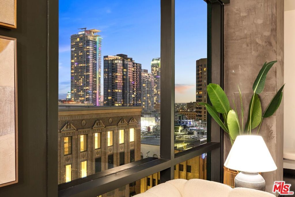 Nestled high on the 14th floor, the highly desirable end unit is a harmonious blend of modern elegance and urban sophistication. True urban dwelling with views of the bustling city down below. The open floor plan loft boasts floor-to-ceiling glass walls, tall gallery walls, 12-foot ceilings and warm dark hardwood floors. 2 unique brick accent walls and an East facing wall painted black. Natural light emanates throughout. The sleek kitchen features blue color cabinetry, white backsplash, granite countertops, stainless steel appliances and a new Bosch dishwasher. The bathroom features a soaking tub. Washer/dryer are included! Building amenities include 24/7 security/concierge, a rooftop sundeck, barbecue, a chic bar with panoramic downtown views, a resident club room, gym and a helicopter pad. 1 unassigned parking space included - in the building with a direct elevator bank to the 14th floor as well as the lobby.Located directly above the 7th Street Metro Station, enjoy the best of urban dwelling at your doorsteps. Walk to the action at Crypto.com Arena or LA Live. Enjoy the best of food and beverages at Javiers and Joyce. Across the street from the Bloc and Joeys. Whole foods is a stone's throw away and the Broad Museum is just a few blocks away. Enjoy rich and diverse dining, world class museums and tons of entertaiment options. Truly, the best location in Downtown L.A.