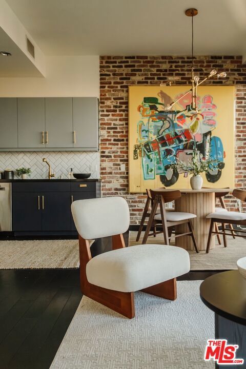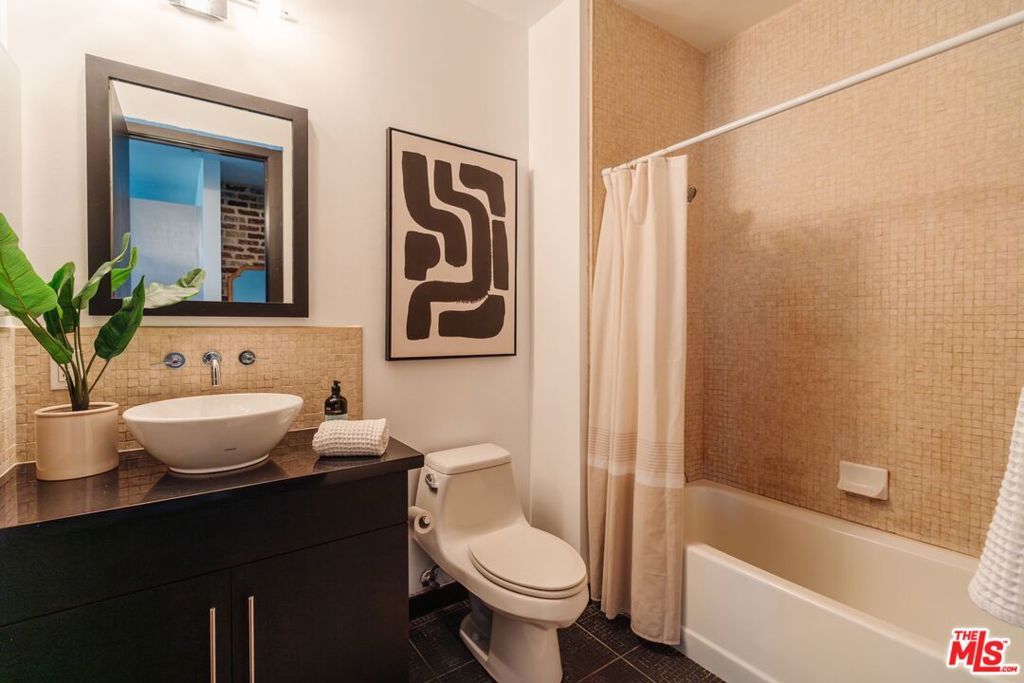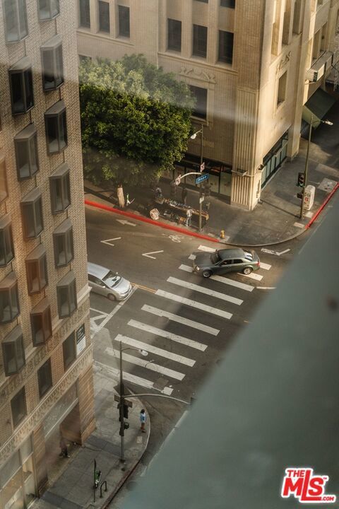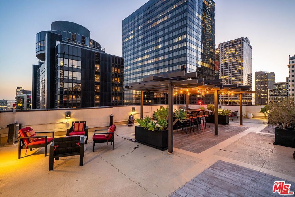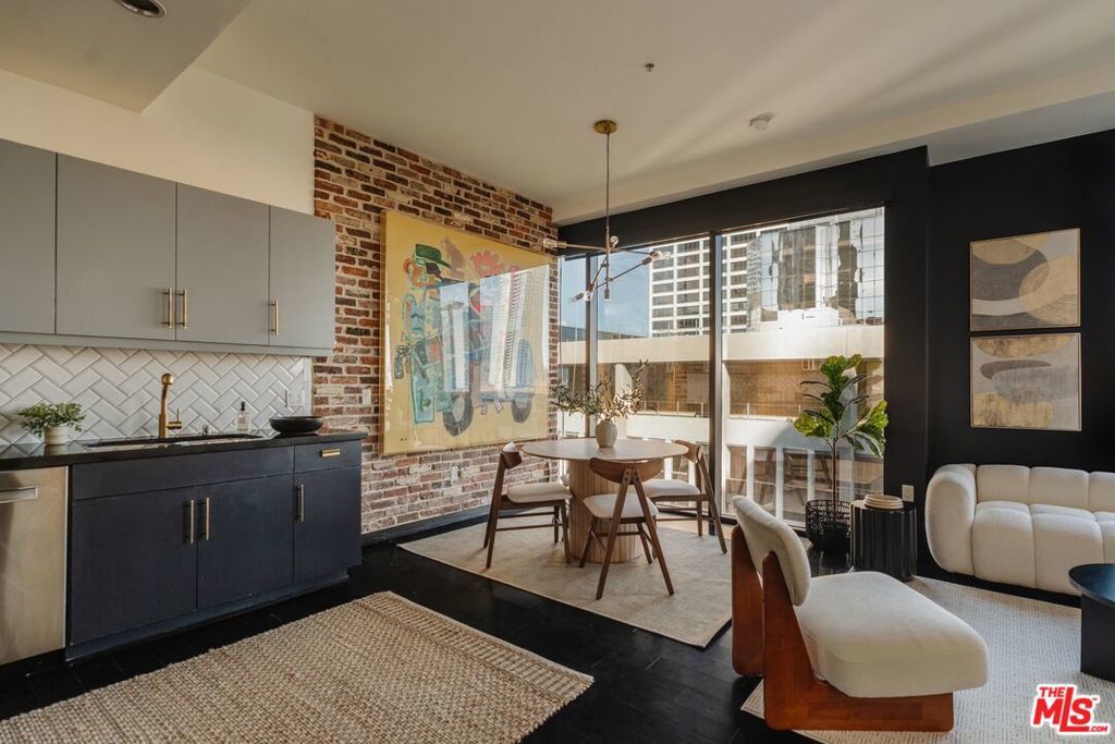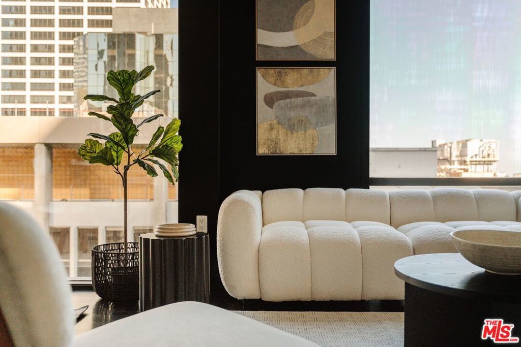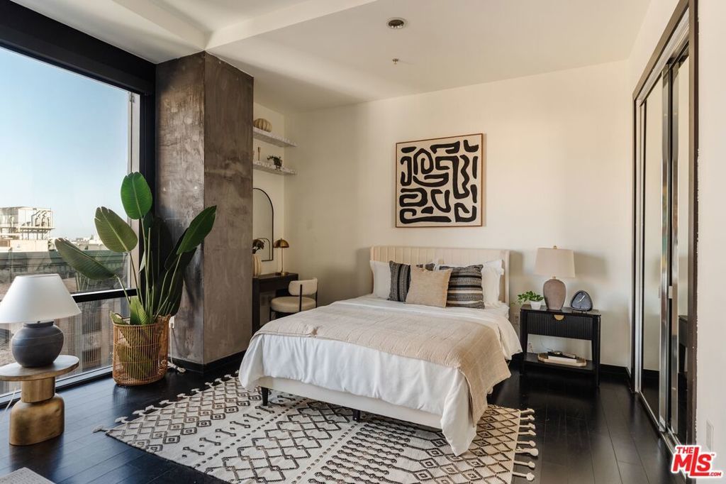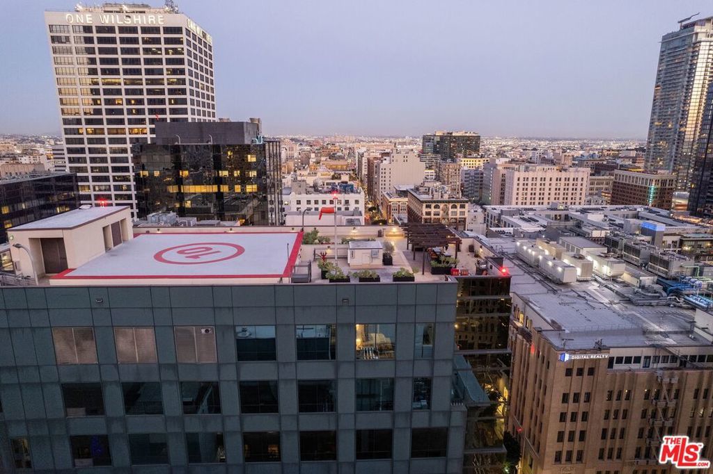 Nestled high on the 14th floor, the highly desirable end unit is a harmonious blend of modern elegance and urban sophistication. True urban dwelling with views of the bustling city down below. The open floor plan loft boasts floor-to-ceiling glass walls, tall gallery walls, 12-foot ceilings and warm dark hardwood floors. 2 unique brick accent walls and an East facing wall painted black. Natural light emanates throughout. The sleek kitchen features blue color cabinetry, white backsplash, granite countertops, stainless steel appliances and a new Bosch dishwasher. The bathroom features a soaking tub. Washer/dryer are included! Building amenities include 24/7 security/concierge, a rooftop sundeck, barbecue, a chic bar with panoramic downtown views, a resident club room, gym and a helicopter pad. 1 unassigned parking space included - in the building with a direct elevator bank to the 14th floor as well as the lobby.Located directly above the 7th Street Metro Station, enjoy the best of urban dwelling at your doorsteps. Walk to the action at Crypto.com Arena or LA Live. Enjoy the best of food and beverages at Javiers and Joyce. Across the street from the Bloc and Joeys. Whole foods is a stone's throw away and the Broad Museum is just a few blocks away. Enjoy rich and diverse dining, world class museums and tons of entertaiment options. Truly, the best location in Downtown L.A.