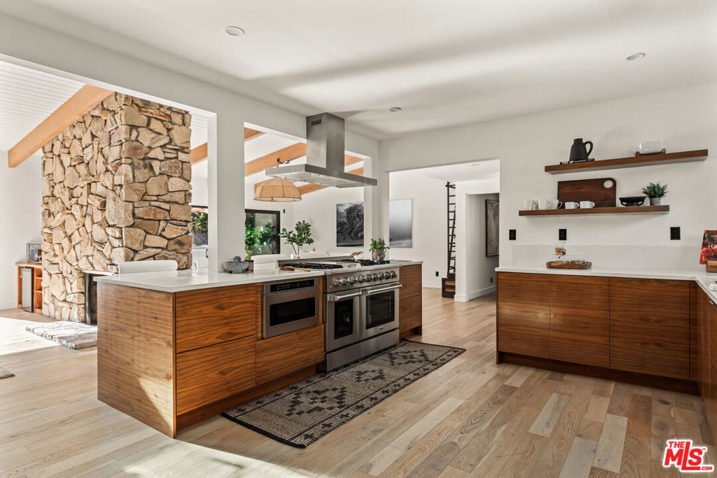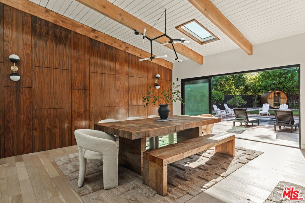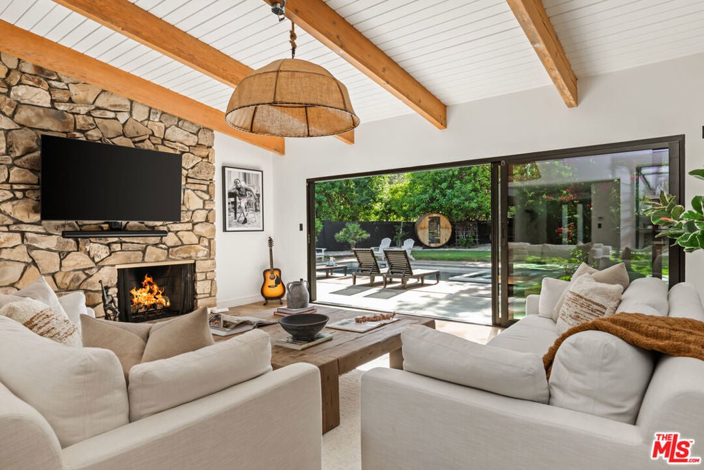 Tucked away on a tranquil, tree-lined cul-de-sac, this stunningly reimagined Charles Du Bois Mid-Century home offers an elevated living experience in one of Woodland Hills' most coveted pockets. Blending timeless mid-century architecture with modern luxury, the home has been thoughtfully updated with high-end finishes and inspired design choices throughout. Ideally located near top-rated schools, The Village, The Commons, and a vibrant collection of premier restaurants, this retreat places you in the heart of it all while still feeling worlds away. Inside, natural light pours into an expansive open-concept layout framed by dramatic glass walls and a striking double-sided fireplace. The living spaces flow effortlessly into the lush backyard, where a custom-designed pool and spa anchor a resort-style oasis, complete with a sleek gazebo, built-in BBQ, and deck with an outdoor fireplace, perfect for entertaining year-round. At the center of the home, the chef's kitchen stuns with walnut cabinetry, concrete slab countertops, and seamless integration into the dining area featuring a cozy fireplace, custom dry bar, and oversized sliders that open to the private yard.Hidden behind discreet paneling, a bespoke speakeasy offers the perfect spot for intimate evenings or spirited gatherings. The primary suite impresses with soaring ceilings, a fireplace, a boutique-inspired walk-in closet, and a spa-like bath that redefines relaxation. Step outside to a beautifully designed pergola and alfresco dining area creating a captivating backdrop for evenings under the stars. From its welcoming, tree-framed entry to the serene, Zen-style grounds, this property captures the essence of California indoor-outdoor living at its finest.