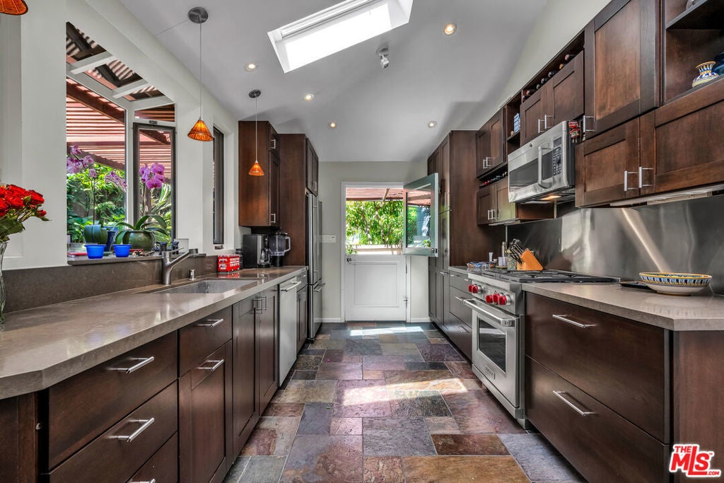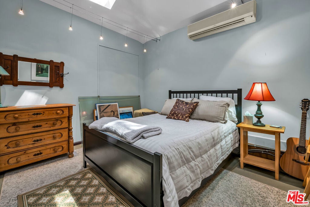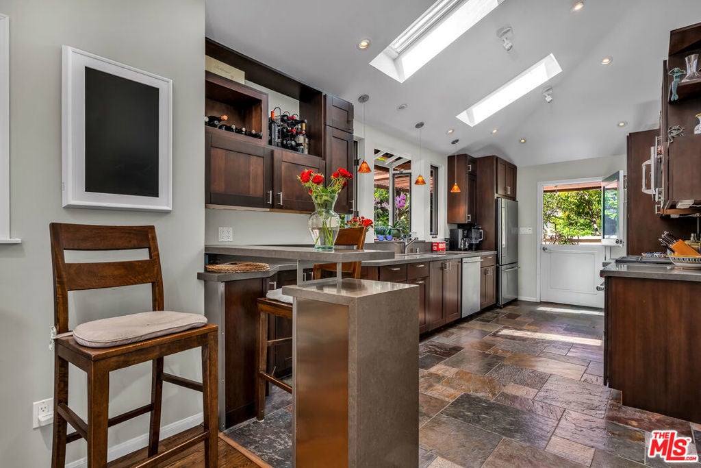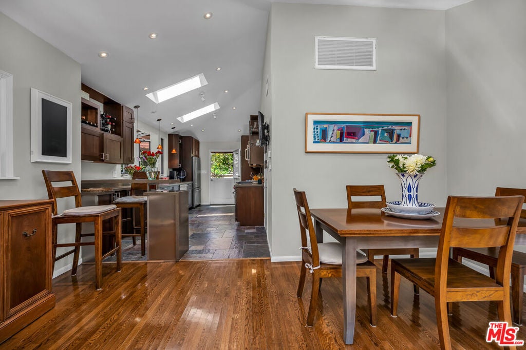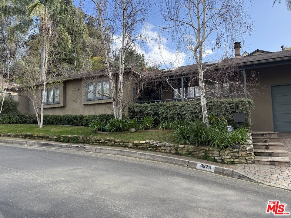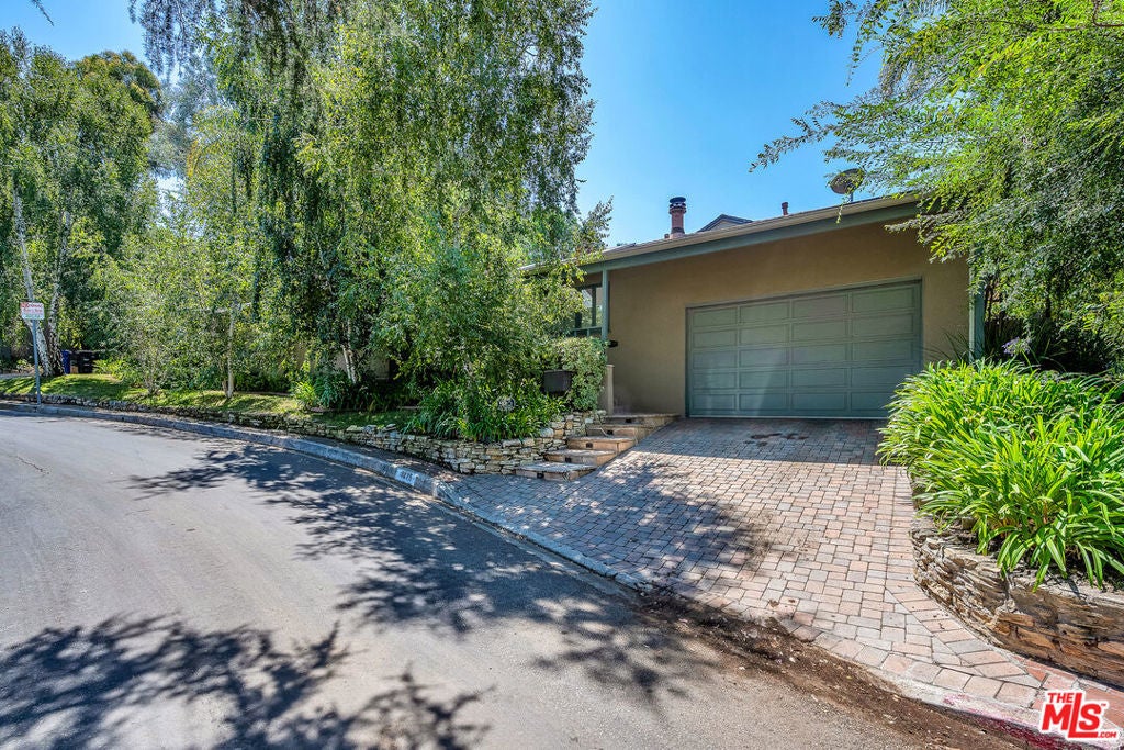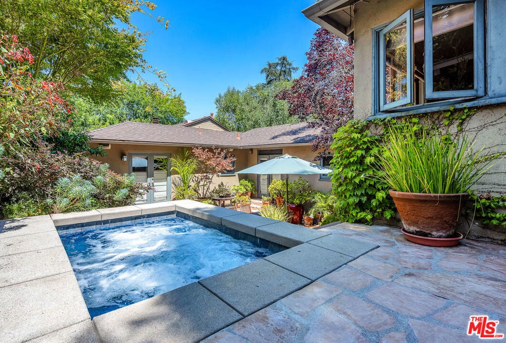 This exceptional property features a beautifully remodeled 2 bedroom, 2 bath main home plus a separate, permitted structure with a 3/4 bath and its own private driveway. The meticulously updated home radiates sleek, sunlit charm throughout. Vaulted ceilings and generous skylights fill the space with natural light, while hardwood floors and central air conditioning enhance the welcoming atmosphere. The recently renovated kitchen offers ample storage, stainless steel appliances, and a convenient breakfast bar. In addition, there is direct access to the two-car garage and laundry area. The expanded primary bedroom opens to the lush private yard and spa, providing an ideal retreat. The luxurious primary bath features a steam shower and a separate soaking tub for ultimate relaxation. The second bedroom, complete with a built-in desk, also opens to the serene patio area. The guest bath has been beautifully remodeled to match the home's sophisticated design. Additionally, a permitted structure with a 3/4 bath provides a versatile space perfect for an office, guest room or recording studio. Located on a spacious corner lot, in a prime section of the Hollywood Hills, this hidden gem is just moments from major studios and the Hollywood Bowl.