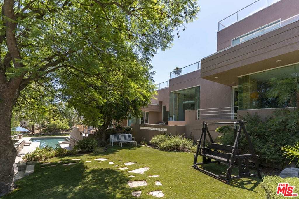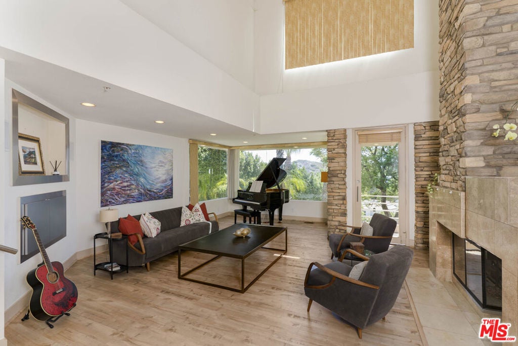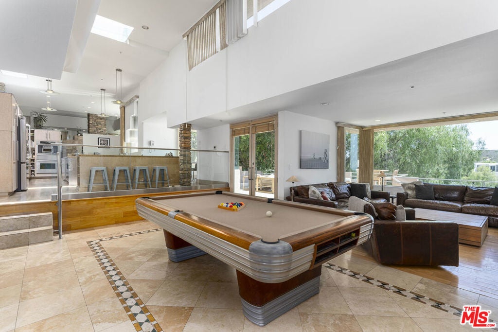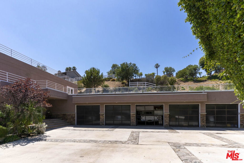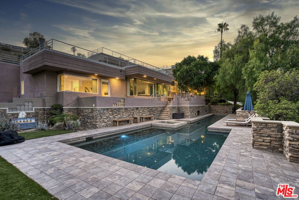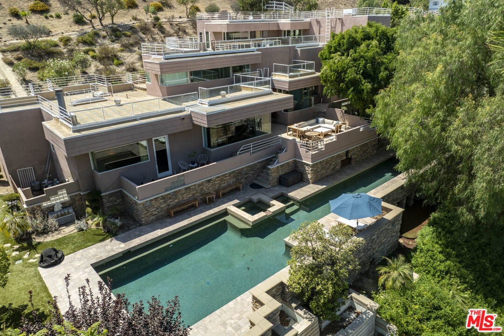 Perched at the end of a long private driveway in the prestigious guard-gated community of Bell Canyon, this striking architectural contemporary home blends privacy, luxury, and sweeping hillside and valley views from nearly every room. Set on over an acre of landscaped grounds, the property offers an exceptional backdrop for both everyday living and grand-scale entertaining. The impressive double-door entry opens to a light-filled multilevel floor plan, where glass, skylights, and soaring ceilings create a sense of openness and connection to the outdoors. Oversized living and dining areas flow seamlessly together, anchored by a dramatic two-sided fireplace and surrounded by view-filled patios. The chef's kitchen boasts Merle wood cabinetry, granite counters, dual islands, a breakfast bar, and an inviting eat-in nook with serene hillside vistas. A large family room overlooking the pool and patio features a pool table area and connects to a granite-topped wet bar with a mini-fridge that is perfectly placed for hosting guests. A highlight of the home is the private stadium-seating theater, offering the ultimate cinematic experience without ever leaving your property. For quieter moments, retreat to the private luxurious primary suite, complete with a fireplace, patio access, dual walk-in closets, and a huge spa-like bath featuring travertine finishes, a jetted tub, sauna, and separate vanities. The upstairs level includes a massive bedroom with a walk-in closet, a second large bedroom, and a shared Jack-and-Jill bath with dual vanities and an oversized soaking tub and makeup counter. Two additional main-level guest suites with en-suite baths provide flexibility for extended family or visitors. The resort-style front yard is a true showstopper, featuring a sparkling Pebble Tec lap pool with spa and grotto viewing window, expansive patios, a BBQ center, and rolling lawn areas - perfect for making memories with family and friends. The home is pre-wired for audio throughout. A viewing area up behind the house is a perfect spot for taking in the incredible views. A mirrored 5-car garage provides the perfect setting for the car enthusiast, as well as ample parking up the long private driveway. Residents of Bell Canyon enjoy access to an equestrian center, clubhouse, gym, tennis and pickleball courts, hiking trails, and year-round community events - all within the award-winning Las Virgenes School District.