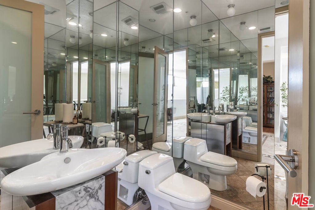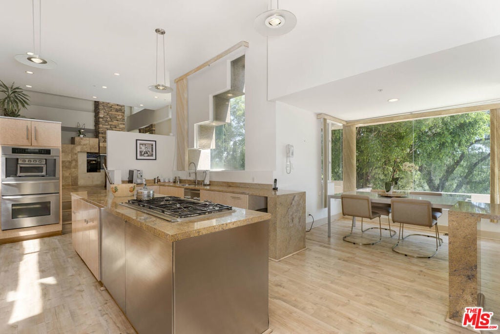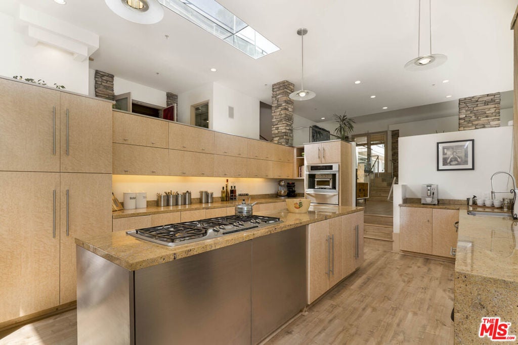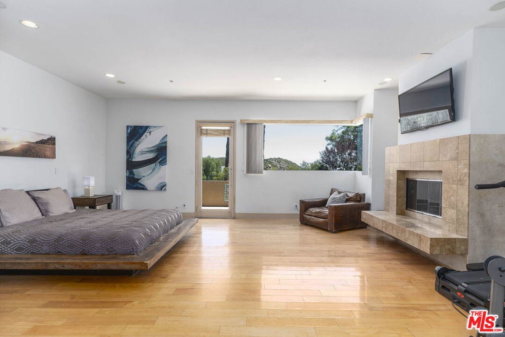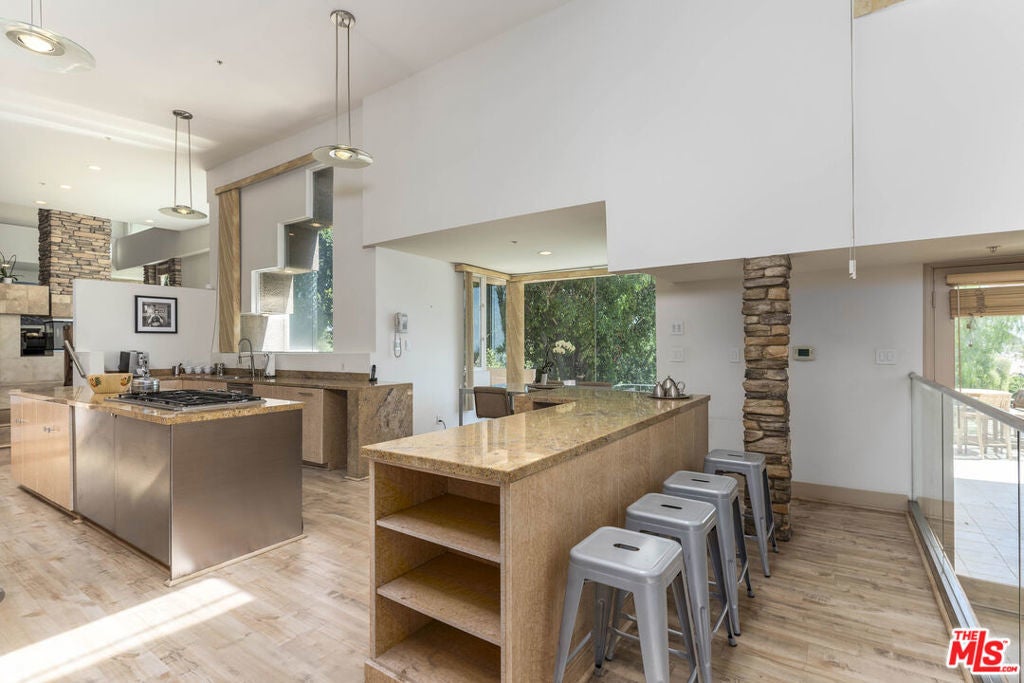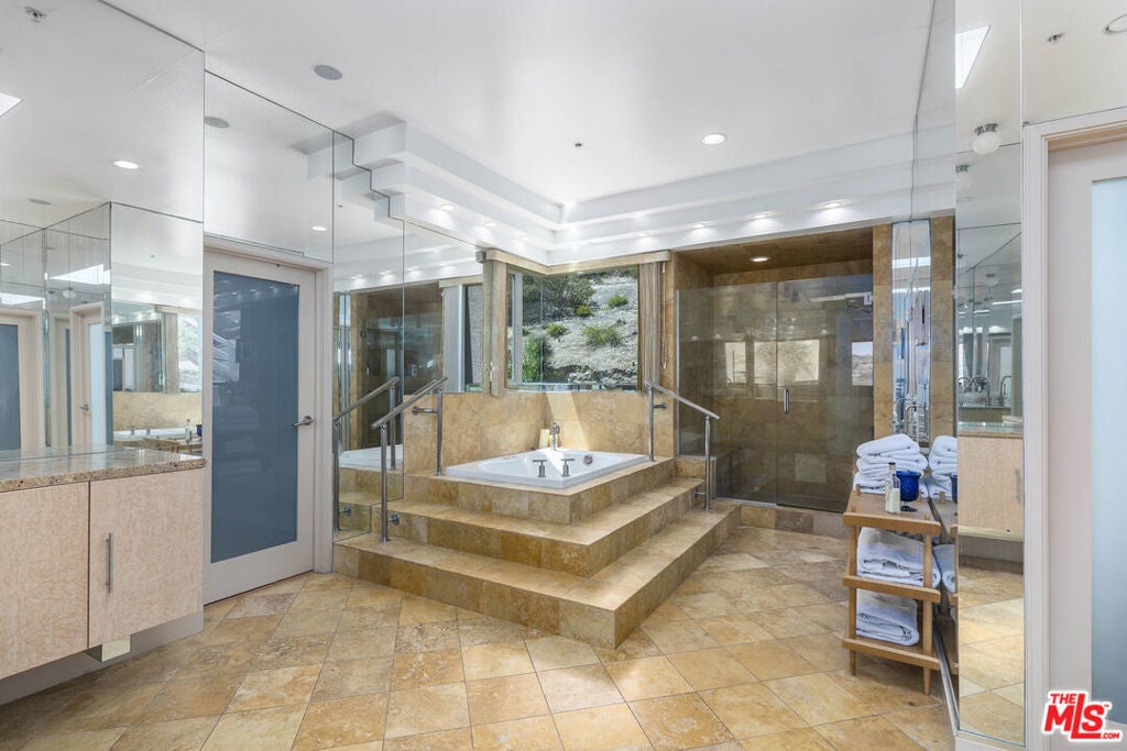 Perched at the end of a long private driveway in the prestigious guard-gated community of Bell Canyon, this striking architectural contemporary home blends privacy, luxury, and sweeping hillside and valley views from nearly every room. Set on over an acre of landscaped grounds, the property offers an exceptional backdrop for both everyday living and grand-scale entertaining. The impressive double-door entry opens to a light-filled multilevel floor plan, where glass, skylights, and soaring ceilings create a sense of openness and connection to the outdoors. Oversized living and dining areas flow seamlessly together, anchored by a dramatic two-sided fireplace and surrounded by view-filled patios. The chef's kitchen boasts Merle wood cabinetry, granite counters, dual islands, a breakfast bar, and an inviting eat-in nook with serene hillside vistas. A large family room overlooking the pool and patio features a pool table area and connects to a granite-topped wet bar with a mini-fridge that is perfectly placed for hosting guests. A highlight of the home is the private stadium-seating theater, offering the ultimate cinematic experience without ever leaving your property. For quieter moments, retreat to the private luxurious primary suite, complete with a fireplace, patio access, dual walk-in closets, and a huge spa-like bath featuring travertine finishes, a jetted tub, sauna, and separate vanities. The upstairs level includes a massive bedroom with a walk-in closet, a second large bedroom, and a shared Jack-and-Jill bath with dual vanities and an oversized soaking tub and makeup counter. Two additional main-level guest suites with en-suite baths provide flexibility for extended family or visitors. The resort-style front yard is a true showstopper, featuring a sparkling Pebble Tec lap pool with spa and grotto viewing window, expansive patios, a BBQ center, and rolling lawn areas - perfect for making memories with family and friends. The home is pre-wired for audio throughout. A viewing area up behind the house is a perfect spot for taking in the incredible views. A mirrored 5-car garage provides the perfect setting for the car enthusiast, as well as ample parking up the long private driveway. Residents of Bell Canyon enjoy access to an equestrian center, clubhouse, gym, tennis and pickleball courts, hiking trails, and year-round community events - all within the award-winning Las Virgenes School District.