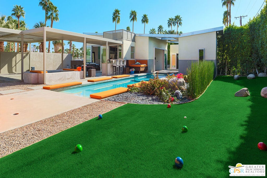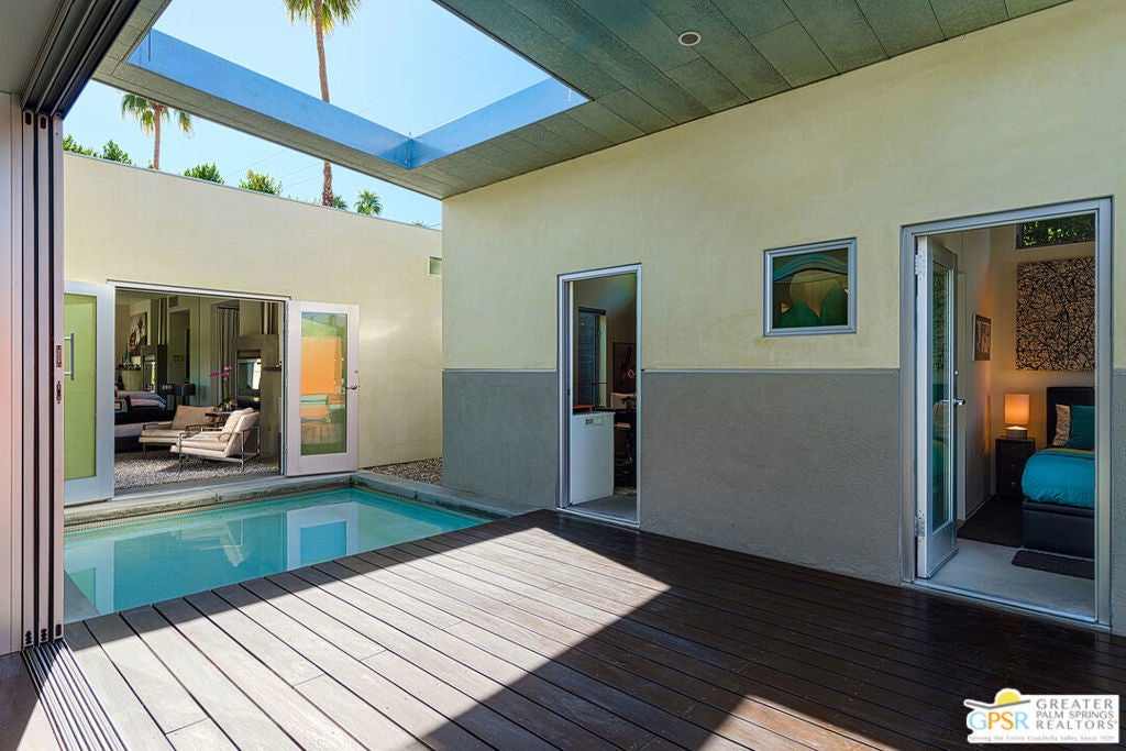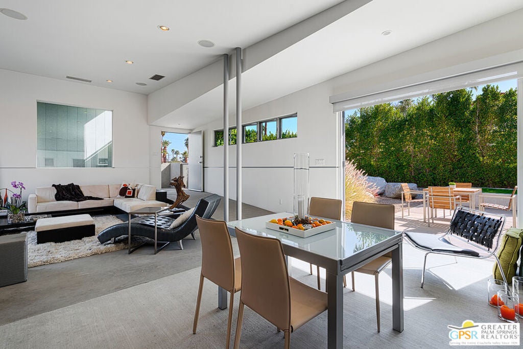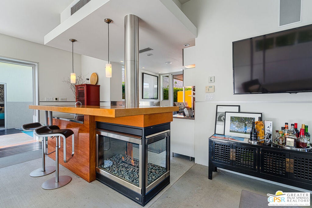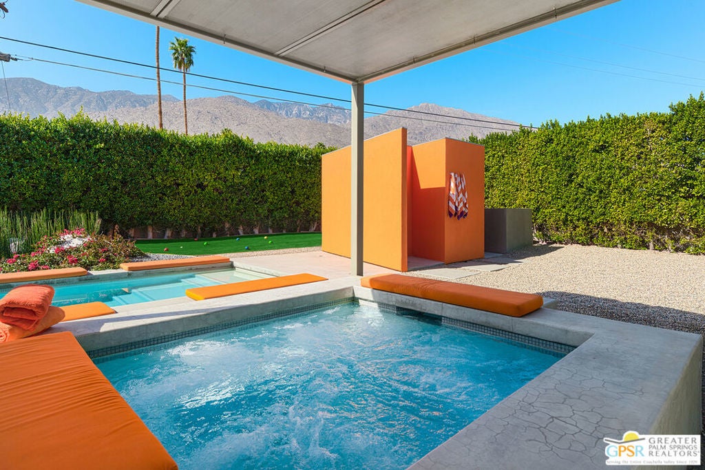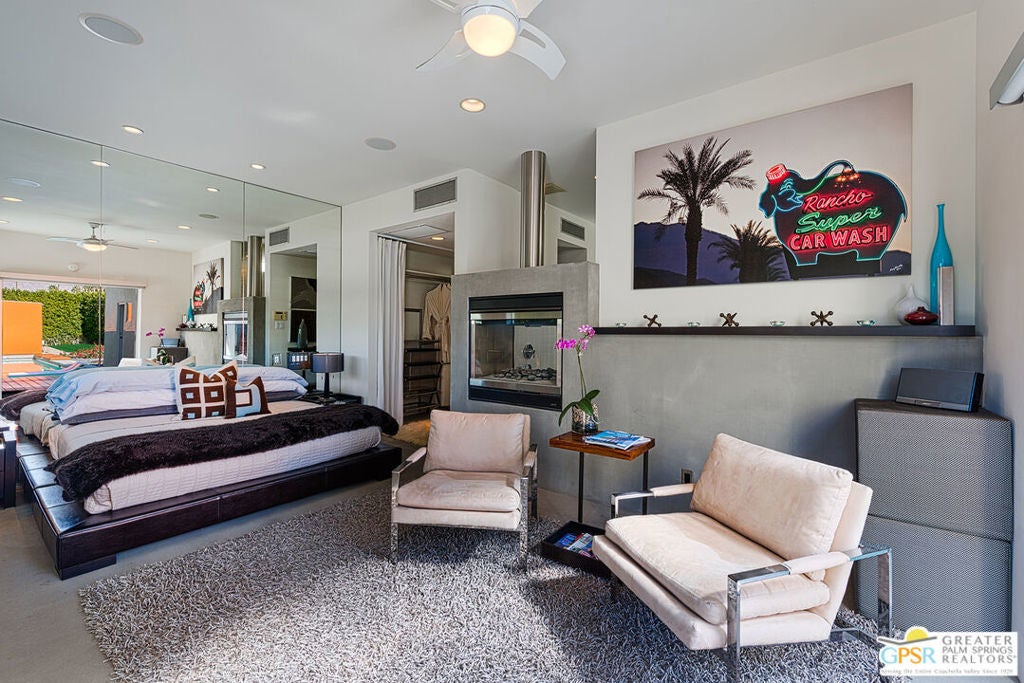 AVAILABLE March 16, 2026 to Dec 31, 2026, and starting April 1, 2027. Seasonal Rental. This unique Palm Springs modem compound is in the popular Twin Palms Estates neighborhood. The walled and gated property features multiple structures and outdoor spaces, resort-style amenities, and architectural design reminiscent of the iconic Alexander butterfly mid-century modern homes. This Palm Springs home truly speaks to the Art of Desert Living, has been cited and featured in a variety of magazines worldwide and won Home of The Year in Metropolitan Home. The art of desert living is best exemplified in a property's outdoor amenities, and this property doesn't disappoint. Amenities include a 60 ft saltwater pool, large saltwater spa, outdoor kitchen, outdoor bed, 4 fire-pits, 2 outdoor showers and more. There is about 2,000 sqft of interior space spread out over 3 buildings. The main house consists of a living room, dining room and kitchen. All rooms have concrete floors and large sliding glass doors, that when opened, blur the line between indoor and outdoor spaces. The living room features a wall mounted TV plus a large seating area with L-shaped sofa, ottoman and 2 comfortable chairs. A large sliding glass door connects the living room to an outdoor bed with pool and mountain view. Next to the Dining room is the kitchen. The two rooms are separated by a breakfast bar with a built-in fireplace. The kitchen itself has a modem and commercial vibe and features high quality appliances including large stove top with grill, oven, wine refrigerator, refrigerator freezer and dishwasher. The adjacent dining room seats six and has two over-sized sliding glass doors. One of the doors opens to a wood bridge that spans the pool to secondary ensuite bedroom and the other door opens to an outdoor dining room, distinctive firepit seating area and a detached structure solely for the primary bedroom and bathroom. The Primary Bedroom is a stand-alone structure just steps away from the main house. Like the main house it has concrete floors and a large sliding glass door, that when opened, blur the line between your bedroom and the outside. Inside you'll find a King size bed, spacious closet, Smart TV and gas fireplace that separate the bedroom from the master bathroom. On the bathroom side, the fireplace is perfectly situated next to the large bathtub. Who needs candles when you can soak beside the flames of a roaring fireplace? There is also a large shower with waterfall shower head, two large sinks, a clerestory window and a door that opens to a private outdoor shower. The Guest bedroom/den structure features a guest bedroom with queen size bed and Smart TV. A bathroom connects it to the guest living room that features a couch that can sleep one, and another Smart TV. The main purpose of this Palm Springs modern compound is "rest, rejuvenation, and fun". Flanking the 60 ft saltwater pool, lounge chairs and large outdoor bed float above the water while the outdoor kitchen with gas grill, refrigerator and bar seating area anchor to the additional yard amenities. Next to the outdoor kitchen is a bubbling saltwater spa which is just steps away from an additional outdoor bed perfect for lounging. At the other end of the pool is the Pool House that provides an outdoor shower, cabana room and washer/dryer. On the other side of the compound is a distinctive seating area where guests can sit or lie on huge boulders encircling a recessed fire pit that shoots flames right out of the ground. This desert modern home is distinctive and award-winning; providing an elemental experience that includes earth, fire and water with a generous serving of Palm Springs architecture, upscale amenities and conveniences, and a chic urban vibe.