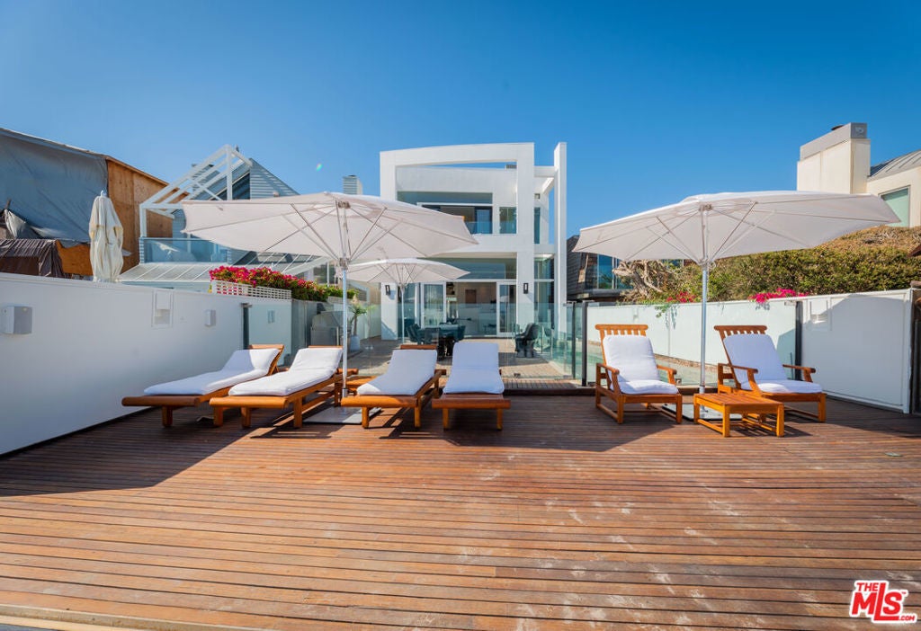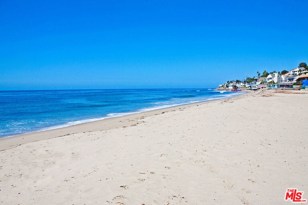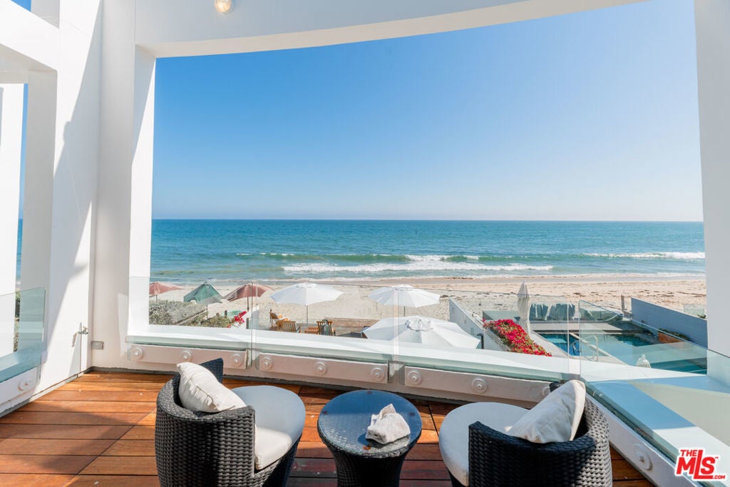 Located on the deepest part of sandy Malibu Colony beach, this stunning, recently remodeled architectural residence evokes the essence of Malibu beach sophistication. Gated for privacy, one enters into a fully landscaped courtyard where they are greeted by a modern water feature which leads to a large glass and beam enclosed entry. The impeccably furnished dining and living areas are as inviting as they are inspiring with soaring ceilings, recessed cove lighting, retractable buffets, significant art walls, contemporary fireplace and an ocean side wall of glass. Show off your culinary skills in style while watching the waves break in this newly completed entertainer's kitchen, which showcases gorgeous stone finishes, Miele appliances and touch-open cabinetry for that extra touch of class. The comfortable den includes a chic gallery wall of photography and display shelves for your collections. A private stairway takes you past the office alcove to the ocean view master suite and bath equipped with a glass privacy partition, skylights that allow you to star gaze from the bed, as well as a sitting area and oceanfront patio. There are three additional en-suite bedrooms and a detached studio perfect for live-in staff or visiting friends. There is an internal courtyard opposite the entry for casual conversation over a fire pit. The spacious beachfront patio with pool, spa, lounging and dining areas is the dream location for entertaining friends or a peaceful retreat for relaxing. The height of luxury in the heart of Malibu's 'Gold Coast' awaits!