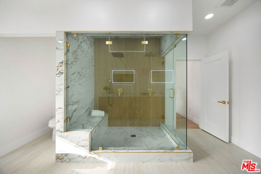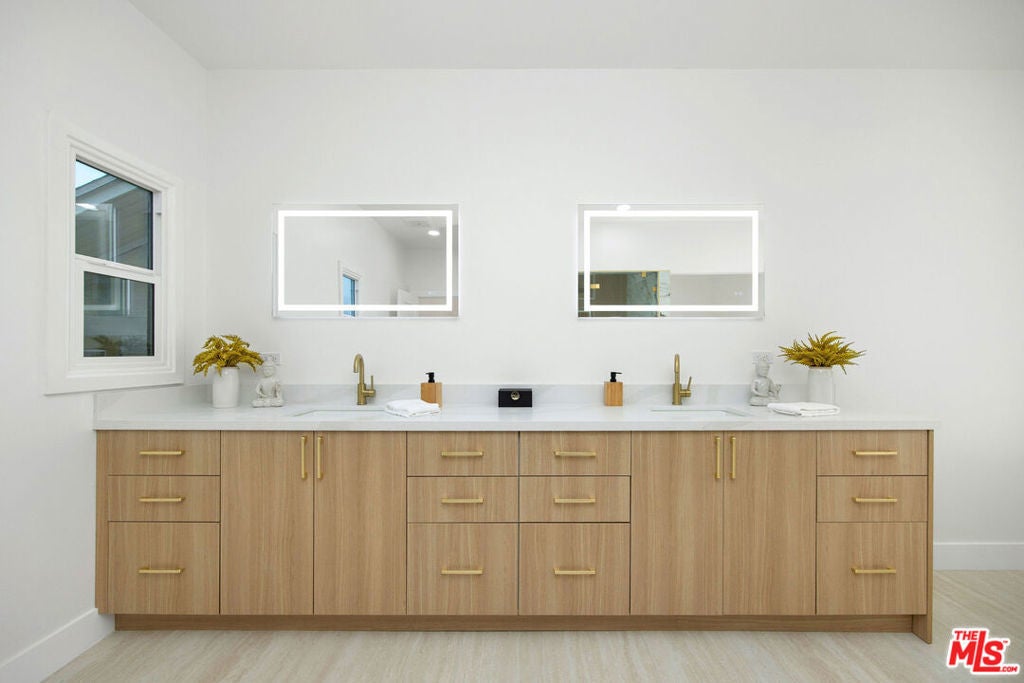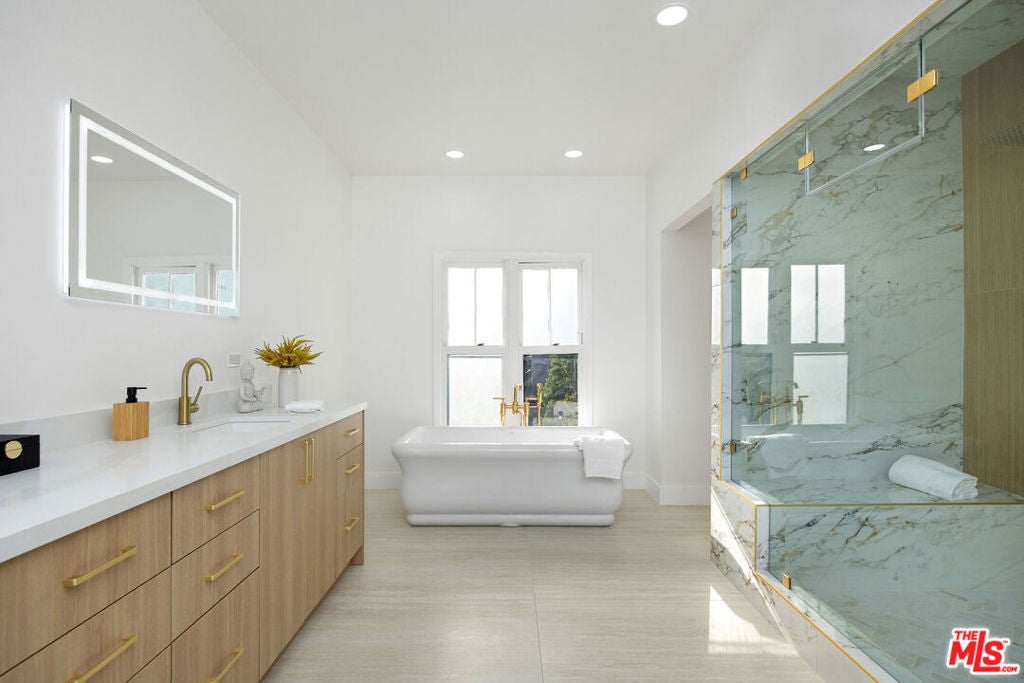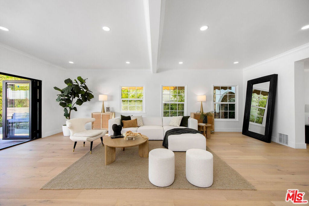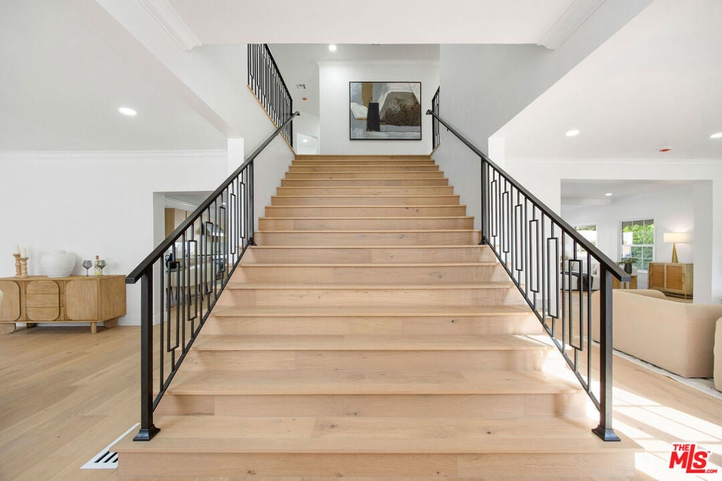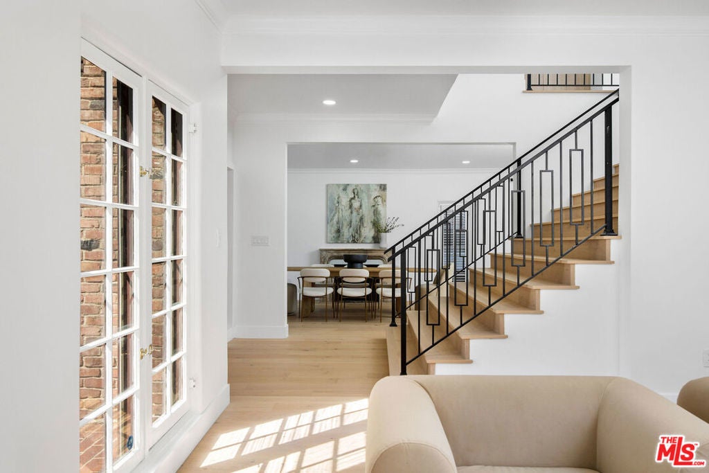 Romantic old-world charm meets modern luxury in this reimagined English Tudor, perfectly situated within Windsor Village HPOZ of Hancock Park. Behind manicured grounds and a majestic pine, the renovated interior unfolds with wide-plank oak floors, airy open-concept living spaces, and a statement staircase framed in black iron. The chef's kitchen features premium stainless steel Thermador appliances, while brand-new Panorama sliding doors connect the indoors to a true entertainers backyard with a covered patio, built-in BBQ, sink, fridge, and storage. Recent updates include new plumbing, electrical, ductwork, dual AC units, roof, paint, and paid for solar panels. The garage is recently finished with new doors, epoxy floors. The spa-inspired primary bath boasts a freestanding tub, porcelain shower with gold trim, and abundant natural light. Additional highlights include a wine cellar, decorative fireplaces, and an option for a sixth bedroom making this historic-meets-modern gem truly turn-key.