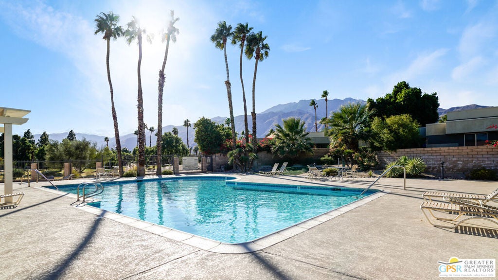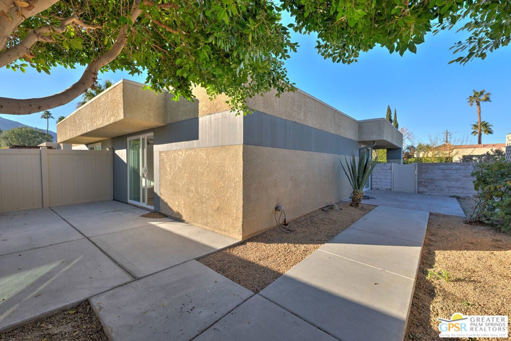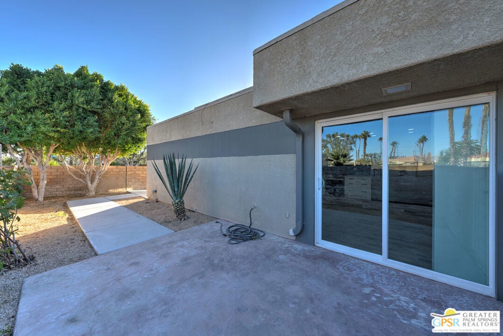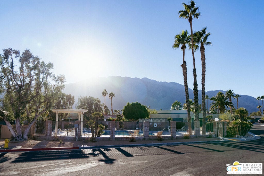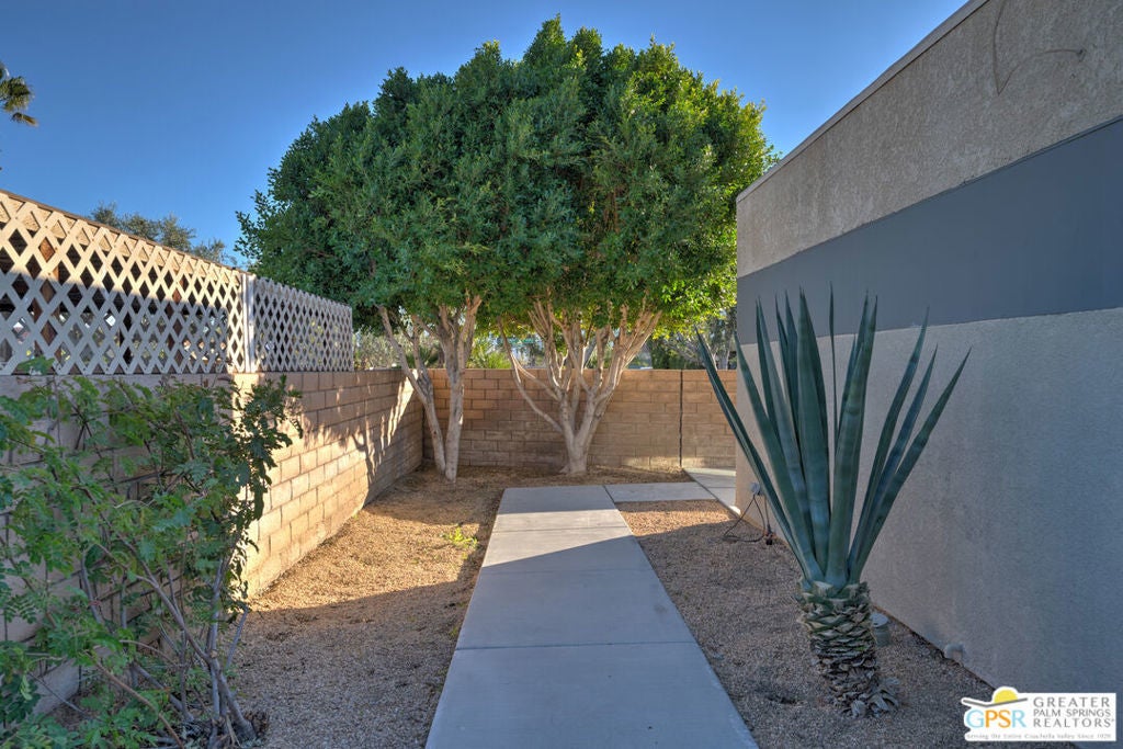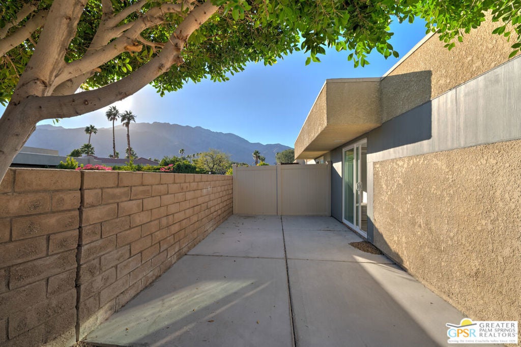 CONDO + PRIVATE YARD + GARAGE for Long-term lease. Be the first to live in this newly renovated one bedroom and one bathroom condo with a private yard and private attached garage is a true Palm Springs gem. Just minutes from downtown Palm Springs, this community is a PERFECT place to be. Completely renovated, this condo balances modern style with the beauty of the California desert. Utilizing the desert color palette, the high quality features are underscored by the ubiquitous flooring throughout and framed by the white walls and ceiling in this OPEN FLOOR PLAN home. In the kitchen, large aggregate quartz counters compliment the spacious wall-length cabinetry, tile backsplash and built-in appliances. The bedroom includes a newly renovated bathroom with matching blue tiles and modern fixtures. Advance outdoors via the sliding doors in the living room or master bedroom to a wrap-around back/side yard with drought-tolerant landscaping and beautiful shade tree in the corner. The yard is perfect for entertaining or enjoying time with your furry best friend. An interior laundry room includes a stacked washer/dryer. The attached one-car garage includes a tankless water heater. The pool and spa are a few homes away. The community includes gated access, eight (8) pools/spas, tennis/pickle ball and basketball courts, and a large central park private for only community residents. Pets ok. Water, trash and landscaping included in rent.