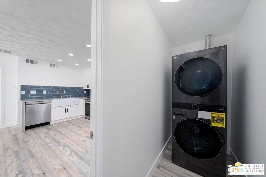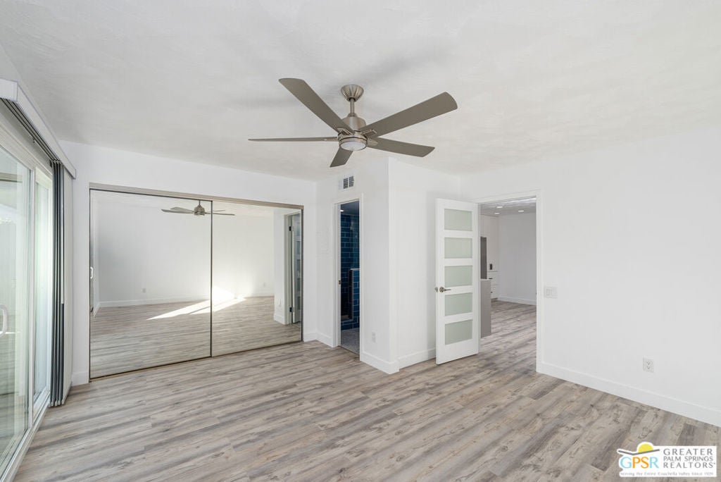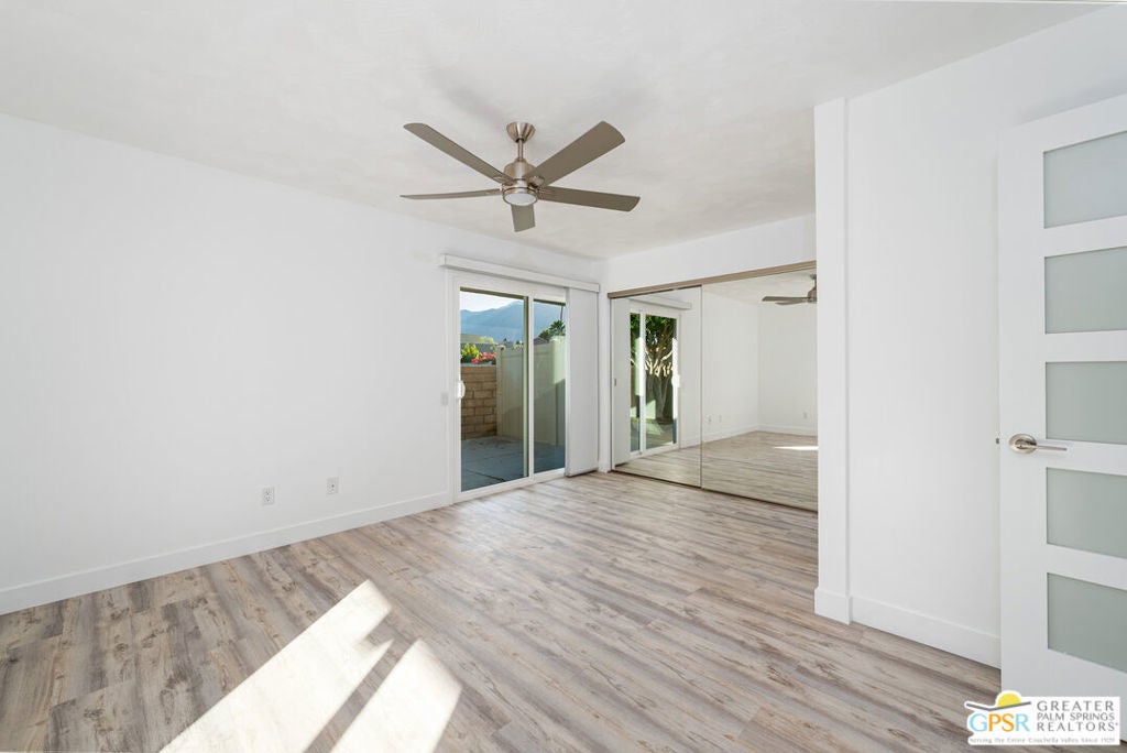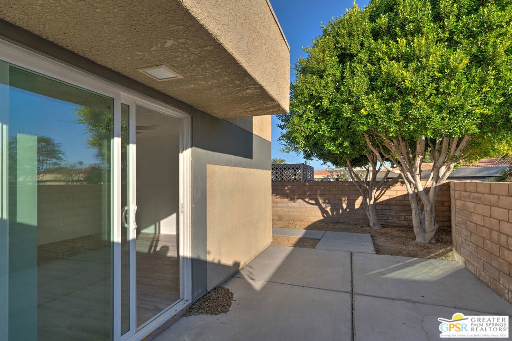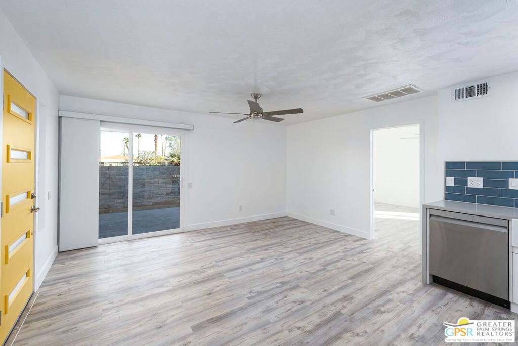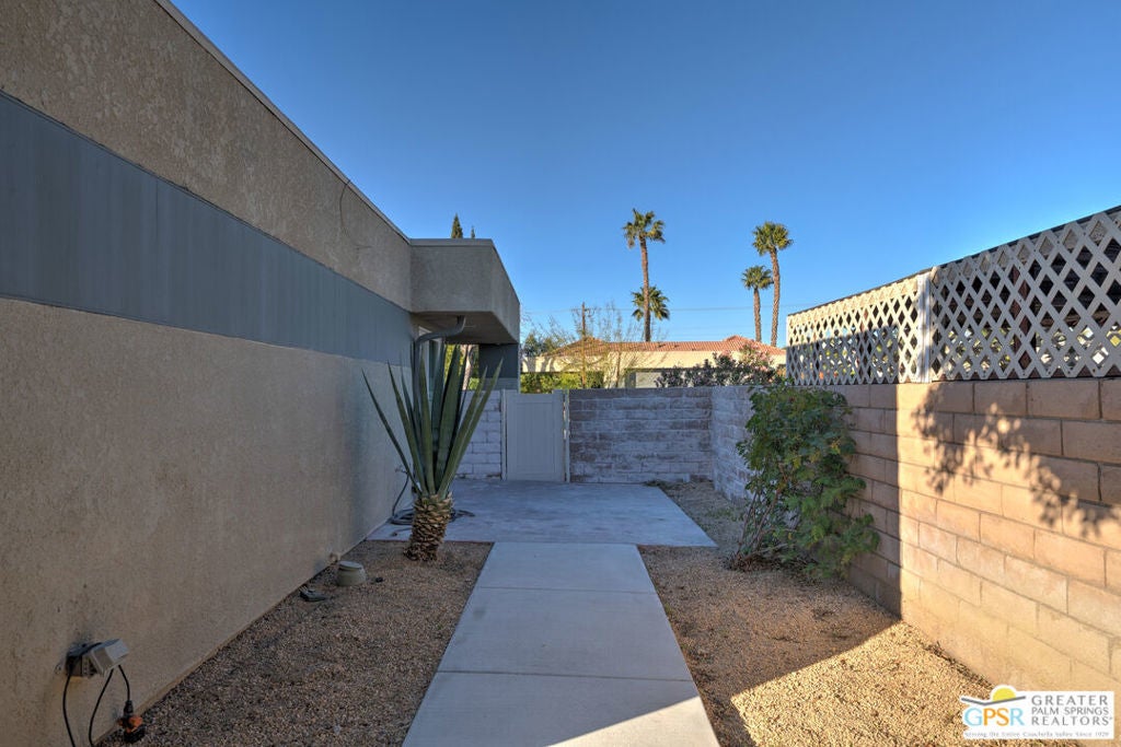 CONDO + PRIVATE YARD + GARAGE for Long-term lease. Be the first to live in this newly renovated one bedroom and one bathroom condo with a private yard and private attached garage is a true Palm Springs gem. Just minutes from downtown Palm Springs, this community is a PERFECT place to be. Completely renovated, this condo balances modern style with the beauty of the California desert. Utilizing the desert color palette, the high quality features are underscored by the ubiquitous flooring throughout and framed by the white walls and ceiling in this OPEN FLOOR PLAN home. In the kitchen, large aggregate quartz counters compliment the spacious wall-length cabinetry, tile backsplash and built-in appliances. The bedroom includes a newly renovated bathroom with matching blue tiles and modern fixtures. Advance outdoors via the sliding doors in the living room or master bedroom to a wrap-around back/side yard with drought-tolerant landscaping and beautiful shade tree in the corner. The yard is perfect for entertaining or enjoying time with your furry best friend. An interior laundry room includes a stacked washer/dryer. The attached one-car garage includes a tankless water heater. The pool and spa are a few homes away. The community includes gated access, eight (8) pools/spas, tennis/pickle ball and basketball courts, and a large central park private for only community residents. Pets ok. Water, trash and landscaping included in rent.