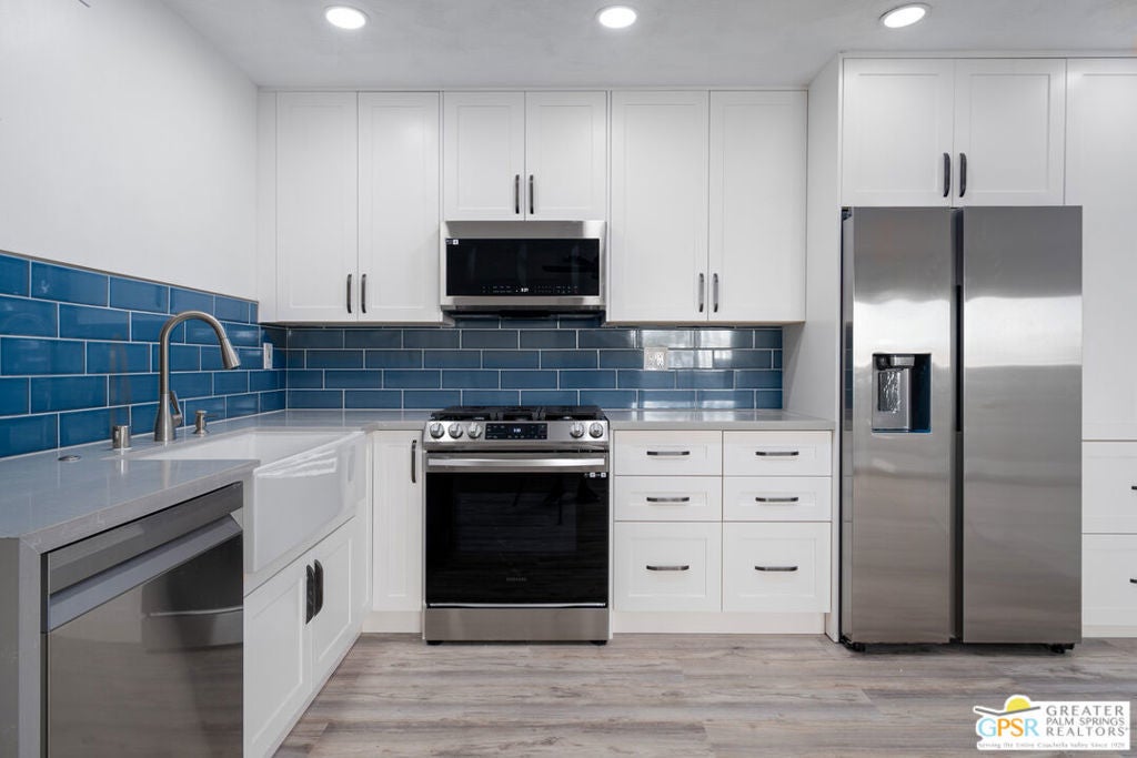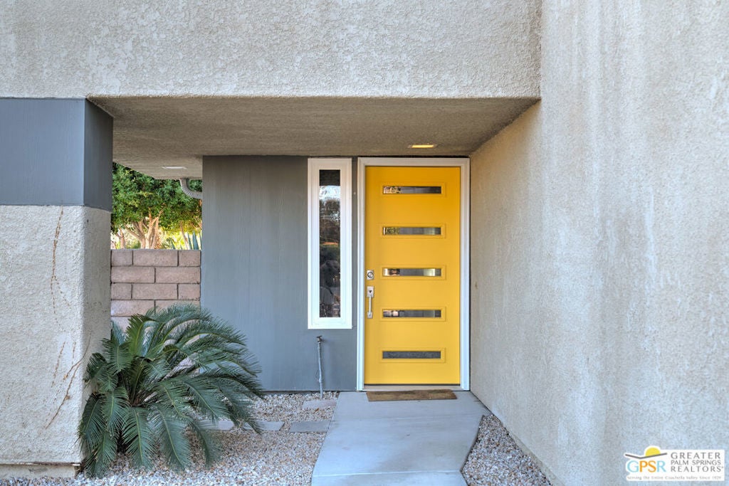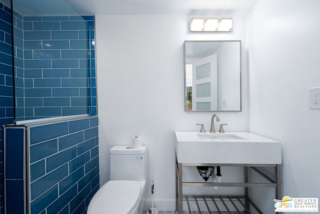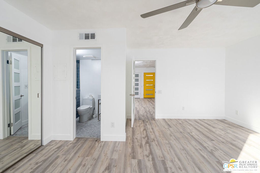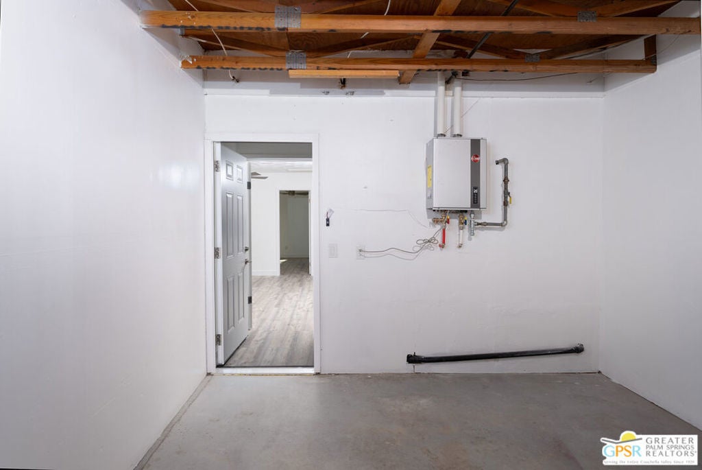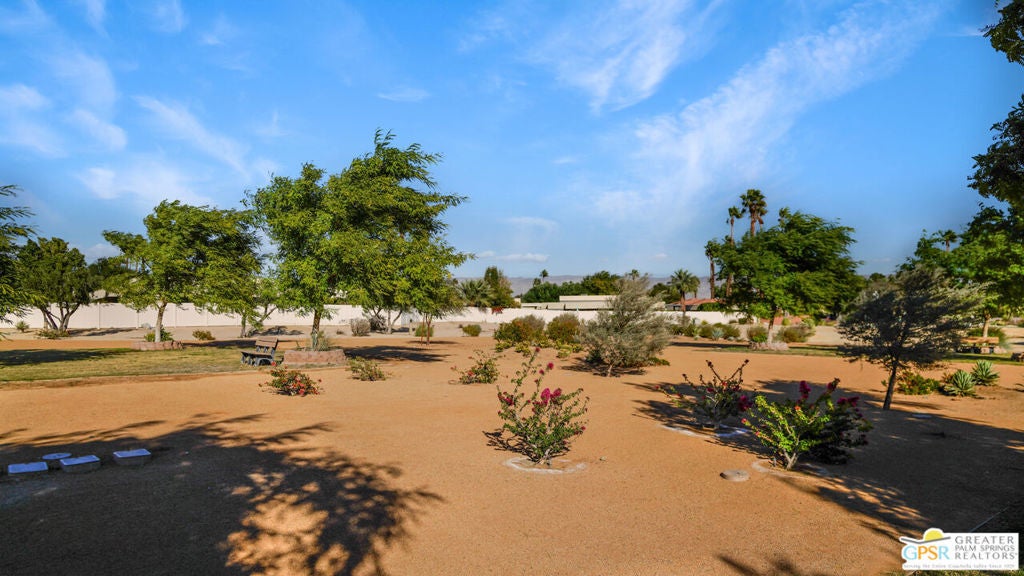 CONDO + PRIVATE YARD + GARAGE for Long-term lease. Be the first to live in this newly renovated one bedroom and one bathroom condo with a private yard and private attached garage is a true Palm Springs gem. Just minutes from downtown Palm Springs, this community is a PERFECT place to be. Completely renovated, this condo balances modern style with the beauty of the California desert. Utilizing the desert color palette, the high quality features are underscored by the ubiquitous flooring throughout and framed by the white walls and ceiling in this OPEN FLOOR PLAN home. In the kitchen, large aggregate quartz counters compliment the spacious wall-length cabinetry, tile backsplash and built-in appliances. The bedroom includes a newly renovated bathroom with matching blue tiles and modern fixtures. Advance outdoors via the sliding doors in the living room or master bedroom to a wrap-around back/side yard with drought-tolerant landscaping and beautiful shade tree in the corner. The yard is perfect for entertaining or enjoying time with your furry best friend. An interior laundry room includes a stacked washer/dryer. The attached one-car garage includes a tankless water heater. The pool and spa are a few homes away. The community includes gated access, eight (8) pools/spas, tennis/pickle ball and basketball courts, and a large central park private for only community residents. Pets ok. Water, trash and landscaping included in rent.