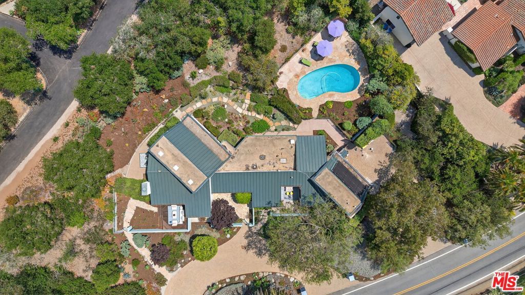 Enchanting, Contemporary Masterpiece in Montecito, CA: Quartz Crystal embedded counter tops. Rare fossil tile in courtyard. Sparkling, solar- heated swimming pool. Gas/Wood fireplace for romantic, autumn nights. On the market for the first time, this five-bedroom, four-bath modern retreat by acclaimed architect Bob Easton blends elegance, versatility, and nature in the award winning Cold Spring School District. Set on nearly an acre, the property features two private guest studios, mountain views and patios all around the nearly 1 acre lot all just minutes from Butterfly Beach, Coast Village Road, and downtown Santa Barbara in a much loved and peaceful neighborhood.Inside, natural finishes Italian marble, limestone, travertine, and bamboo create a warm, contemporary palette. The great room with fireplace flows to a formal dining area with wet bar, library/office, and multiple patios. Every bedroom opens directly to the outdoors, fostering a seamless indoor-outdoor lifestyle.The spacious primary suite offers two walk-in closets and a serene garden-view bath. Three additional bedrooms form a family-friendly cluster, while two detached studios provide ideal space for guests, extended family, or home offices. One studio is a two-story unit with kitchen, bath, and sitting area; the other includes a remodeled bath with river-rock flooring and sweeping treetop views.Unique to this property: the longtime owner, a local artisan, integrated exceptional built-in storage throughout including 34 kitchen drawers and 24 in the master bath. Touring the home feels like stepping into a private gallery, with much of the contemporary art available for purchase.Outdoors, the lush grounds invite endless possibilities from gardens and orchards to a second dwelling. A circular stone driveway, two-car garage, and additional parking for up to 14 vehicles (including RV/boat) enhance practicality. Recent upgrades include new paint, furnace, water heater (with warranty), and updated lighting/outlets.A rare offering that balances artistry and functionality, 520 Barker Pass Road is more than a home it's a versatile canvas for inspired Montecito living.