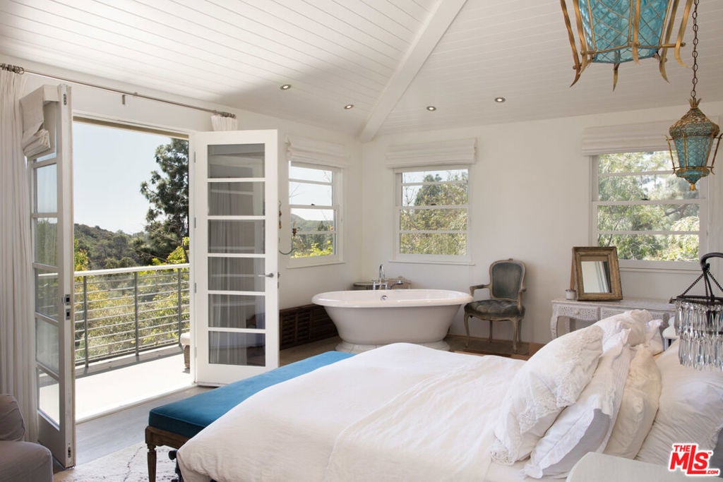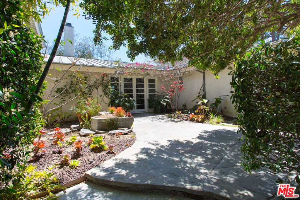 Magnificent gated contemporary home by Paul Hinckley. Organically infused materials such as glass, wood & concrete are used throughout the house creating a gorgeous light-filled oasis. The open entry leads to a living room w/soaring Douglas Fir ceilings, two-sided wood burning fireplace & concrete style floors. The private dining room contains the same surfaces as the living room, creating a seamless visual experience. Stunning chefs kitchen with stainless steel appliances. There is a large meditation/spa room with a luxurious indoor/outdoor bath area. The master suite is located up a private mahogany staircase with sumptuous master bath, walk-in closet and French doors that lead out to a romantic balcony. There are four additional bedrooms and an office. All public rooms lead to a gorgeously landscaped outdoor area with an exquisite lap pool, spa, bbq and enormous grassy yard with unique views that overlook Lake Hollywood Reservoir and the City. A rare offering.