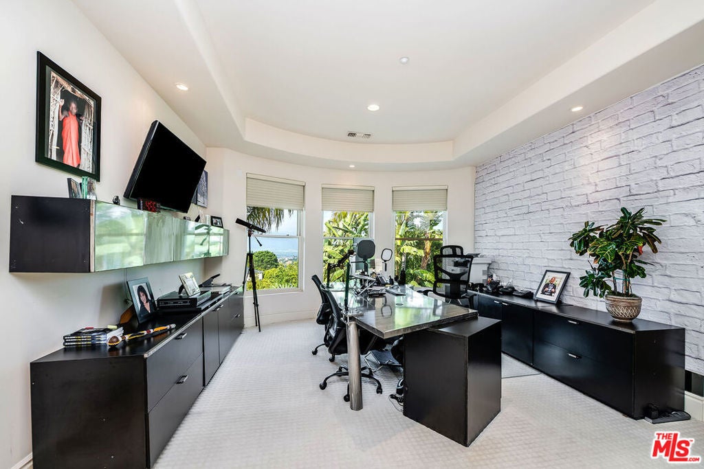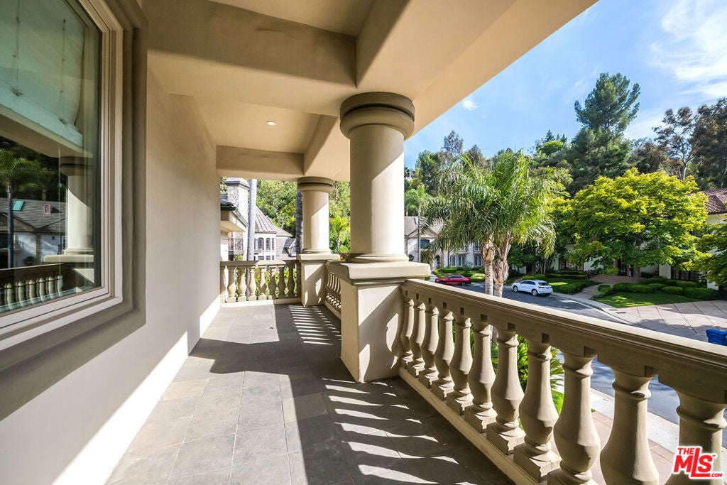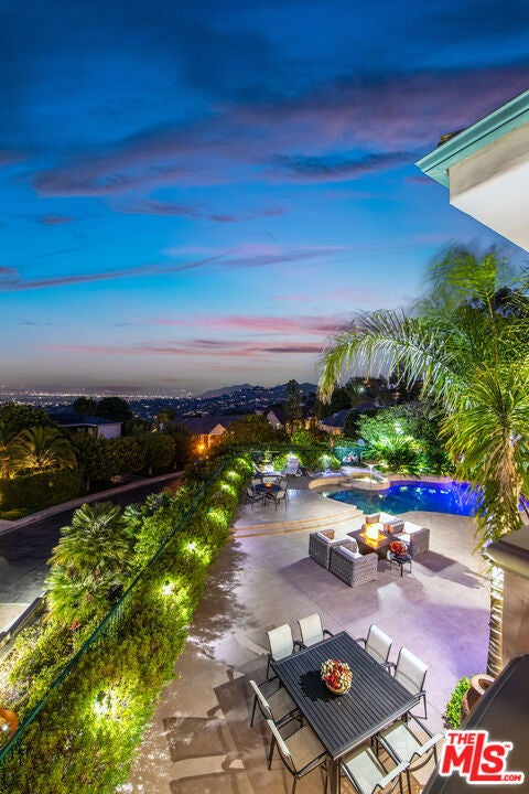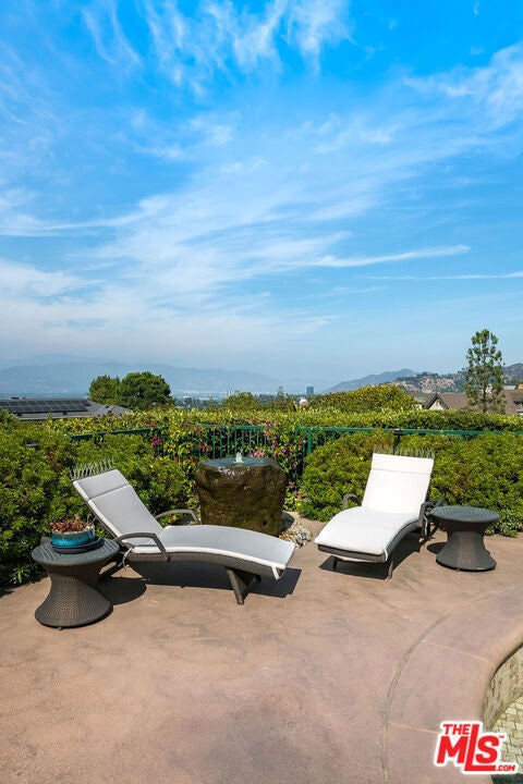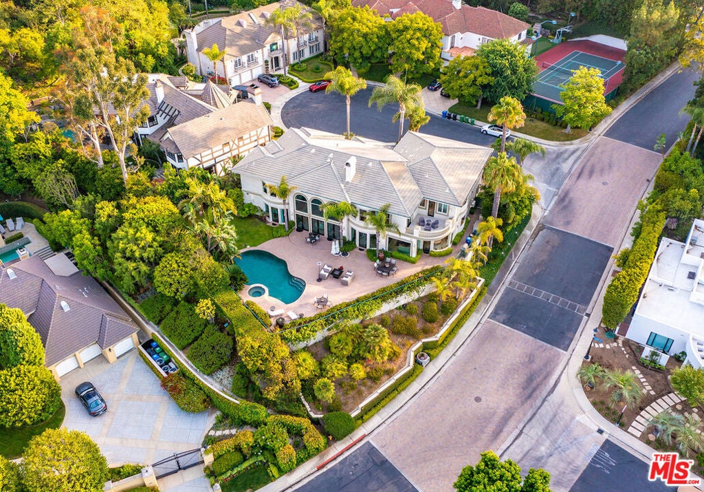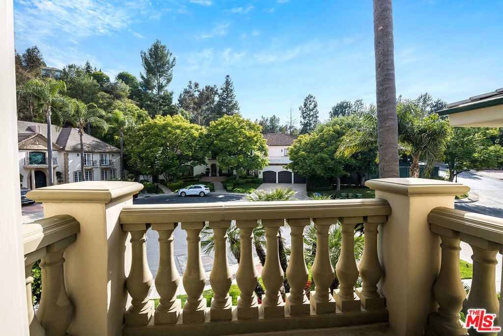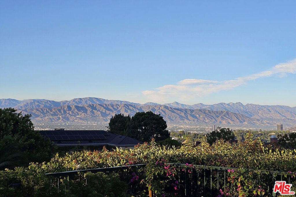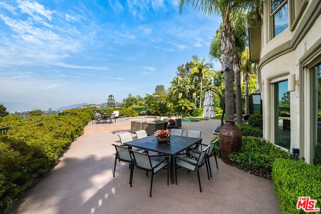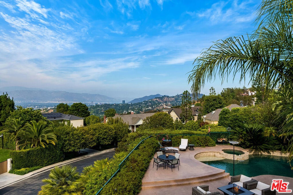 Nestled in the exclusive 24-hour guard-gated enclave of The Summit above Beverly Hills, the magnificent Contemporary Villa offers the ultimate in privacy, luxury, and serenity, all just minutes from the vibrant heart of Beverly Hills and Studio City. Situated atop a small knoll at the end of a peaceful cul-de-sac on a premier corner lot, the graceful estate features spectacular city, canyon, and mountain views, providing a sense of tranquility, charm, comfort, and privacy in one of Los Angeles' most exclusive enclaves. This timeless estate spans just under 7,000 sq.ft. on an approx. 16,216 sq.ft. lot, perfectly blending modern luxury with classic architectural detail. A grand arched entry with intricate textured glass and palm frond sculpted iron double front doors open to a formal foyer with travertine floors and a sweeping curved staircase, setting the tone for the sophistication found throughout. The formal living room impresses with soaring two-story ceilings, a stately fireplace, built-in granite bar, and walls of arched windows and glass doors that flood the space with natural light and open to the backyard oasis. Every ceiling is sculptural. Heated floors in both the living room and gourmet kitchen add comfort and refinement. Art lovers will appreciate the abundant wall space and thoughtful niches throughout the home, perfect for displaying a curated collection. The large formal dining room features a long built-in buffet with cabinetry, and matching arched ceiling, ideal for elegant entertaining. The chef's kitchen featuring two clear-span curved glass windows is equipped with professional-grade appliances, a large granite center island, and an adjoining breakfast room that seamlessly flows into the inviting family room. A powder room, guest bedroom and bathroom, media/screening room, and laundry room complete the lower level. Upstairs, two spacious guest or family bedrooms each offer ensuite baths, while the expansive primary suite is a true sanctuary, complete with private balconies overlooking breathtaking vistas, massive dual custom walk-in closets, and a marble-clad bath featuring dual vanities and commodes, a soaking tub, separate steam shower, and an adjoining gym. The resort-like backyard is an entertainer's dream, with generous patio space surrounding the pool and spa, tropical-inspired landscaping, and grass area, all set against the dramatic backdrop of panoramic views. A three-car attached garage provides ample space for vehicles and storage. Offering an exceptional lifestyle in a secure, sought-after community, this remarkable estate embodies peaceful, private living with effortless access to all the best of Beverly Hills and beyond.