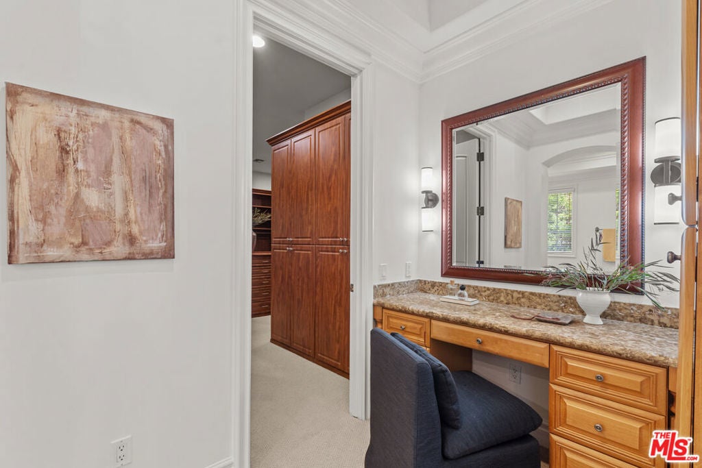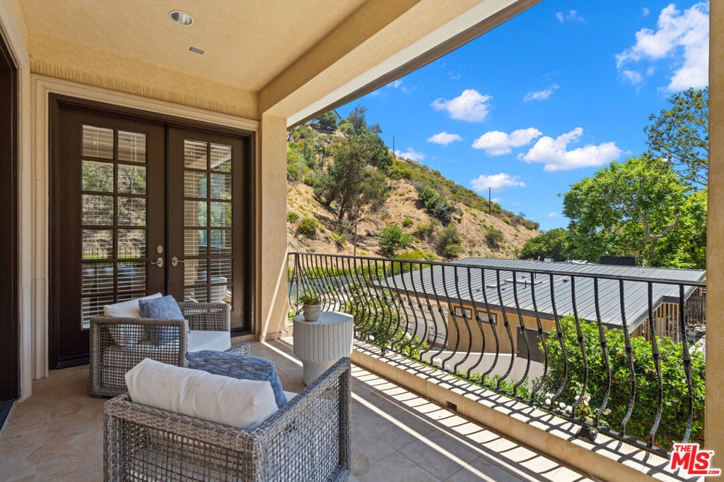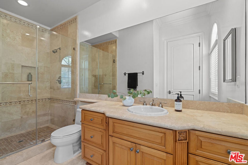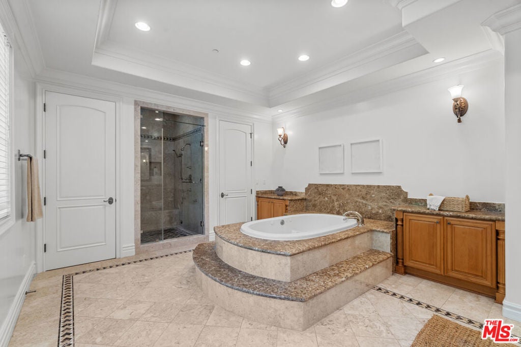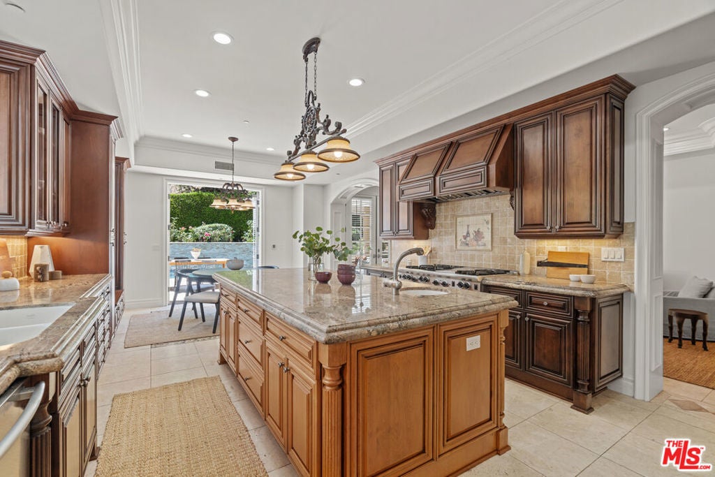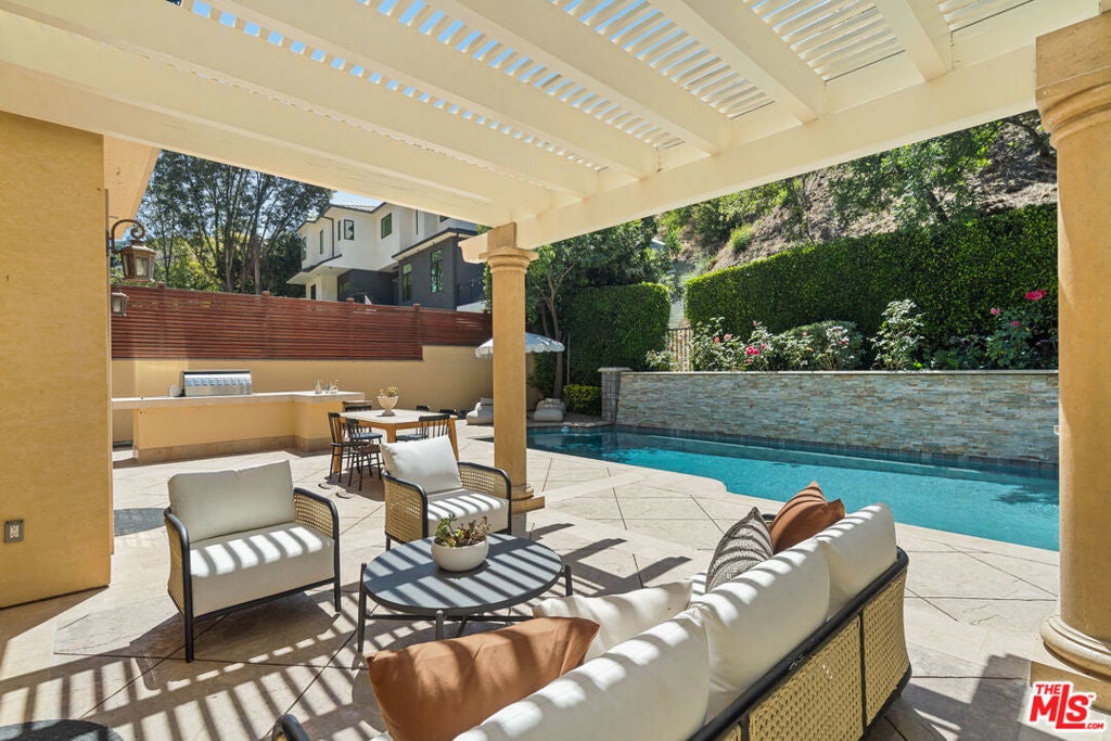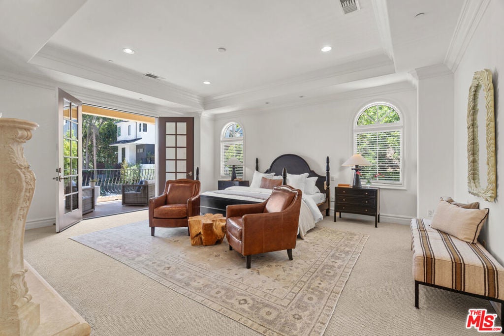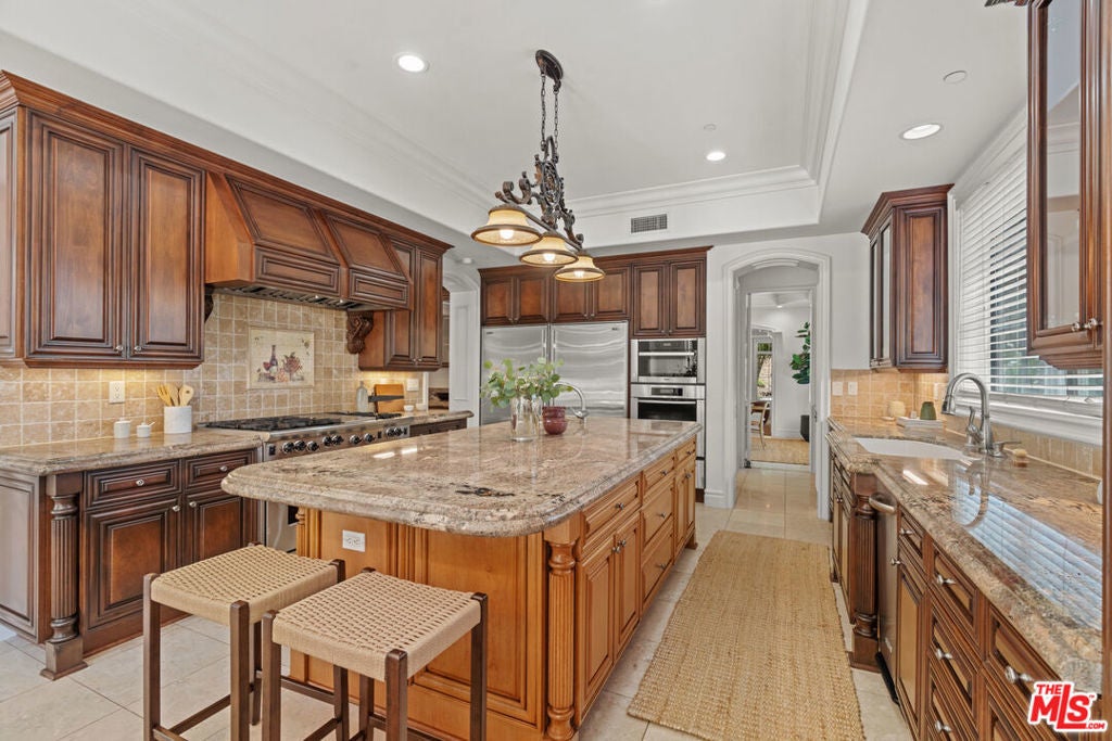 New Price! Tuscan-inspired architecture defines this exceptional 2007-built private estate perched on top of a quiet cul-de-sac in premier upper Brentwood neighborhood North of Sunset. Over 6,200 sq. ft. of living space on over 11,000 sq ft lot with pool & spa make this 6-bedroom, 6.5-bath residence the epitome of California luxury living. The 2 story floorplan features a layout designed with functionality, comfort, & modern living needs. Welcome guests into a grand entry with soaring ceilings, marble floors, tall curved staircase, formal living room with ornate fireplace, bright dining room, wine cellar, family room with fireplace, & 2 spacious ground floor bedrooms. The chef's center island kitchen boasts Sub-Zero double door refrigerator, Miele appliances, butler's pantry, & breakfast nook opening to the family room with French doors & direct access to the pool & patio. The upper landing of the grand foyer leads to separate wings featuring four en-suite bedrooms plus a versatile media/game /study room. The primary suite is a deluxe retreat with a sitting room, fireplace, balcony, spa bath with steam shower, dual water closets, & a stunning custom oversized walk-in closet. Highlights include 4-car garage, outdoor BBQ & fire pit, laundry room, coffered ceilings, custom crown moldings, elegant wrought-iron railings, multiple balconies, arched doors with decorative glass panels, circular inlaid stone medallion in the stone tile polished floor. Timeless in style & sophistication, this beautiful property feels private, warm, the spaces filled with light, openness, and quality craftsmanship.