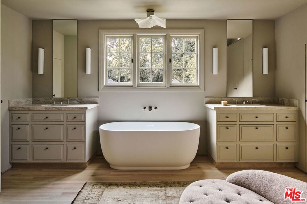 Set behind the private gates of Laughlin Park, one of Los Feliz's most coveted enclaves, this elegantly reimagined residence offers a timeless blend of artful craftsmanship and thoughtful design. Spanning over 4,600 square feet across a main house and guest house, the property has a masterful layout where each space flows effortlessly into the next, marked by warmth, intention, and ease. Inside, richly layered interiors reveal natural stone flooring, accordion-style doors, and curated finishes that speak to understated luxury. Oversized windows bathe the home in natural light, illuminating expansive yet inviting living spaces. The chef's kitchen features custom cabinetry, marble countertops, and top-tier appliances, offering both style and function. Upstairs, the formal living room, anchored by a stately fireplace and dramatic beamed ceiling, sets the tone for elegant entertaining. The primary suite serves as a private retreat serene, spacious, and refined with a large walk-in closet and dressing area, balancing the home's original character with modern comfort. Step outside to a private sanctuary. High hedges and layered landscaping create a tranquil backdrop for the glistening pool, with a seamless connection to the exceptional guest house. Just moments from Griffith Park and the vibrant eateries and shops of Los Feliz, this architectural gem offers a rare combination of sophistication, privacy, and authenticity in one of L.A.'s most desirable neighborhoods.