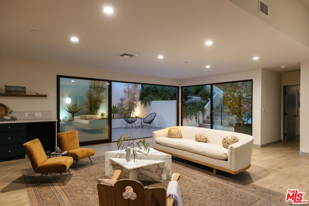 Step into the epitome of luxury living and stunning design in this spectacular Beverly Hills residence, complete with a thoughtfully crafted ADU. The interior has been completely renovated and its elegant design was recently featured in the Hollywood Reporter. Every detail has been meticulously curated to create a space that is both stunning and functional. Tucked away on a quiet and private street, this peaceful home is designed around a seamless indoor-outdoor flow so you can really appreciate the magical landscaping. Wide plank oak floors lead you through an expansive open floor plan, with walls of glass allowing natural light to flood the home and provide a picturesque backdrop. Host unforgettable gatherings with multiple al fresco dining and entertaining spaces connected to a gourmet kitchen and spacious living room. As you ascend to the top floor, you'll discover a primary suite, boasting a tall ceiling and expansive window panels that frame the terraced hillside. This private enclave includes a generous primary bath, a large walk-in closet, and a built-in workspace - all enveloped by the tranquil view of the lush backyard. The lower level presents a 1b1b (included in total bedroom/bathroom count) 700+ square foot ADU with its own direct mailing address, W/D hookup, walk-in closet, and gated parking that's separate from the 2-vehicle carport. Don't miss the opportunity to visit this extraordinary residence firsthand - it's a true gem that must be seen to be fully appreciated.