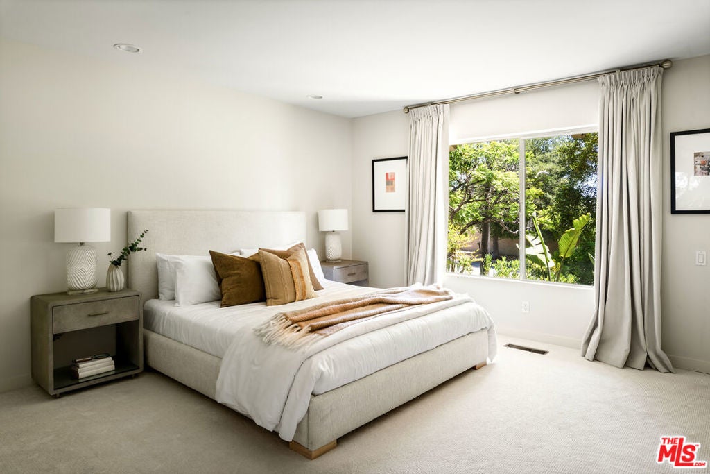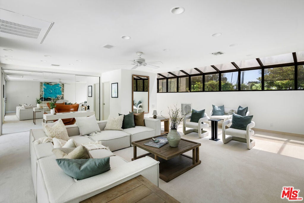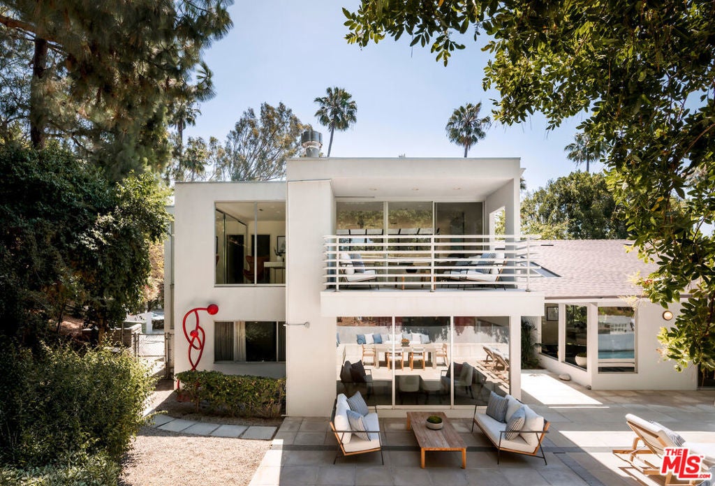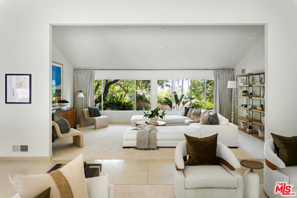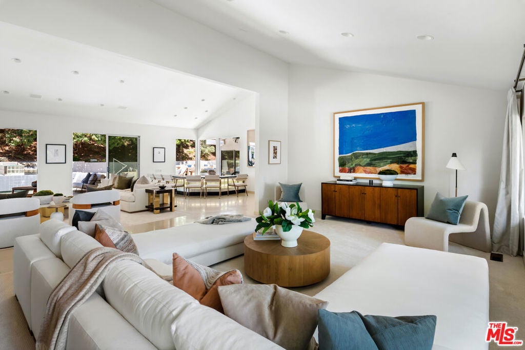Set back from the street below towering Mexican fan palms, this California ranch-inspired home is a fusion of contemporary and midcentury influences on a mostly one-level floor plan in highly sought Beverly Hills proper. A circular driveway leads to carefully manicured landscaping and mature trees complementing the home's elegant and inviting double-door entry flanked by fashionable glass blocks. Inside, vaulted ceilings elevate the foyer and public entertaining spaces. In the family room, a magnificent mirrored fireplace reflects natural light as sliding glass opens to the rear grounds near a smartly designed wet bar for serving multiple party guests. The adjacent formal living room is perfect for intimate gatherings and quiet conversation. Upstairs, a partial loft-style bonus room is ideal as a media room, office, guest quarters, game room, and more, complete with a private balcony overlooking the backyard below. The striking kitchen is both a conversation piece and gourmet culinary center, outfitted with copious cabinetry, smooth glossy countertops, center island with cooktop and hood, hot plate, recipe desk, and premier brands such as Sub-Zero and Miele. Floor-to-ceiling windows in the adjacent eat-in area showcase views of the serenity that awaits outside, accessible via sliding glass door to maximize indoor-outdoor flow. The formal dining room, positioned off of the entry, is excellent for hosting family and friends on special occasions. A voluminous owner's suite has vaulted ceilings, picture windows, direct pool access, and an en-suite spa-like bath with dual vanities, makeup station, jetted tub, and separate shower. Secondary bedrooms are en-suite and light-filled. In the backyard, enjoy an abundance of patio space, lounging decks, built-in seating, outdoor living and dining areas, lush atrium/garden, and pool and spa with water feature, all enveloped by leafy greenery. This world-famous, sought-after location provides access to coveted City of Beverly Hills services such as schools, utilities, and police, just moments to the high fashion of Rodeo Drive, Century City, and the many offerings of the Westside.