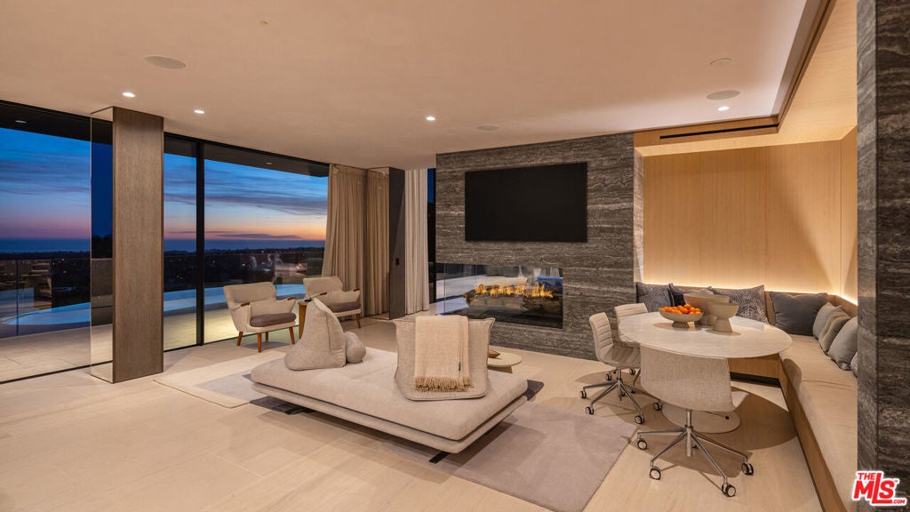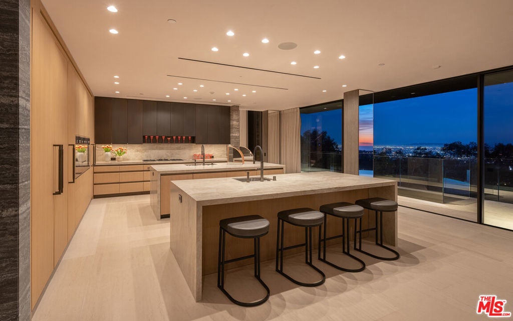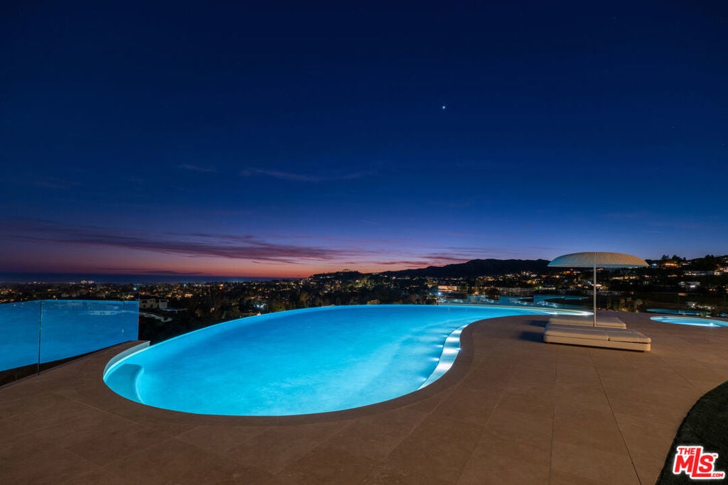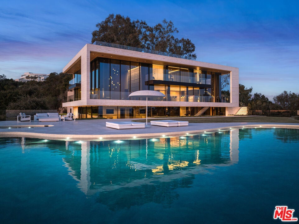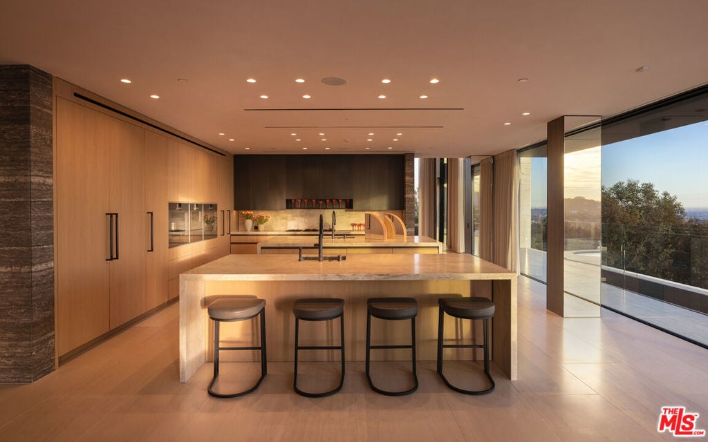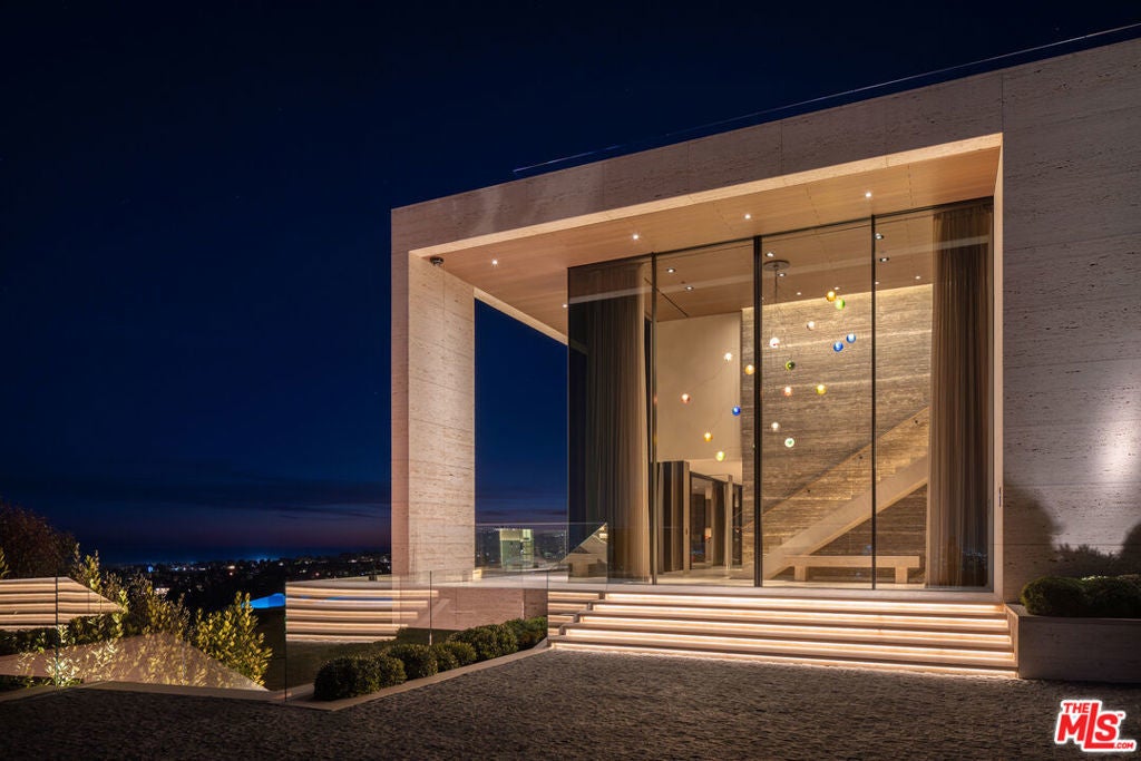 Commanding one of the most coveted promontories on the Westside, this architectural tour de force by Thomas Juul-Hansen unfolds across two acres, framing sweeping vistas from downtown to the Pacific. Clad in Alabastrino Travertine the same stone that graces the neighboring Getty Museum the residence strikes a perfect balance between modern design and natural warmth, with rich wood paneling and sculptural slatting adding depth and character to its expansive spaces. Designed for both grand entertaining and intimate living, the home's fluid layout and soaring volume is anchored by a striking formal living room, where sky-high pocket glass doors erase the boundary between indoors and out, revealing an uninterrupted panorama of city lights and ocean horizons. The dining room and chef's kitchen, both equally breathtaking, extend this effortless openness, blending refinement with functionality. The primary suite is a private sanctuary, enveloped in glass and spilling onto wraparound terraces that offer unobstructed views in every direction. Additional guest suites, each generously scaled, echo this same ethos of light, openness, and connection to the landscape. Elevated amenities abound a state-of-the-art home theater, fitness and wellness studio, and a meticulously curated wine cellar ensuring every element of modern luxury is accounted for. Beyond the walls of glass, the estate unfolds into an expansive outdoor retreat. A sprawling patio and flat grassy lawn lead to a showstopping infinity-edge pool and spa, seamlessly merging with the horizon. An outdoor kitchen, built-in BBQ, and a rooftop terrace unlike any other in Los Angeles provide the ultimate setting for both large-scale hosting and private sunset escapes. A masterclass in design, craftsmanship, and setting, this estate is more than a home it's a legacy, an architectural landmark poised above the city, offering an unparalleled fusion of privacy, scale, and world-class design.