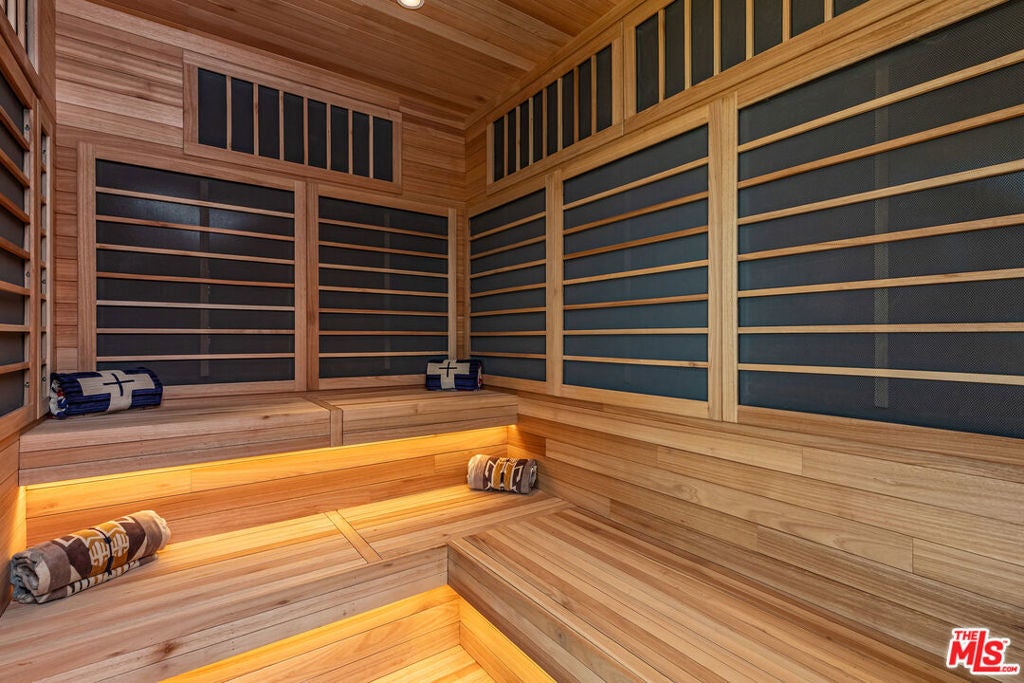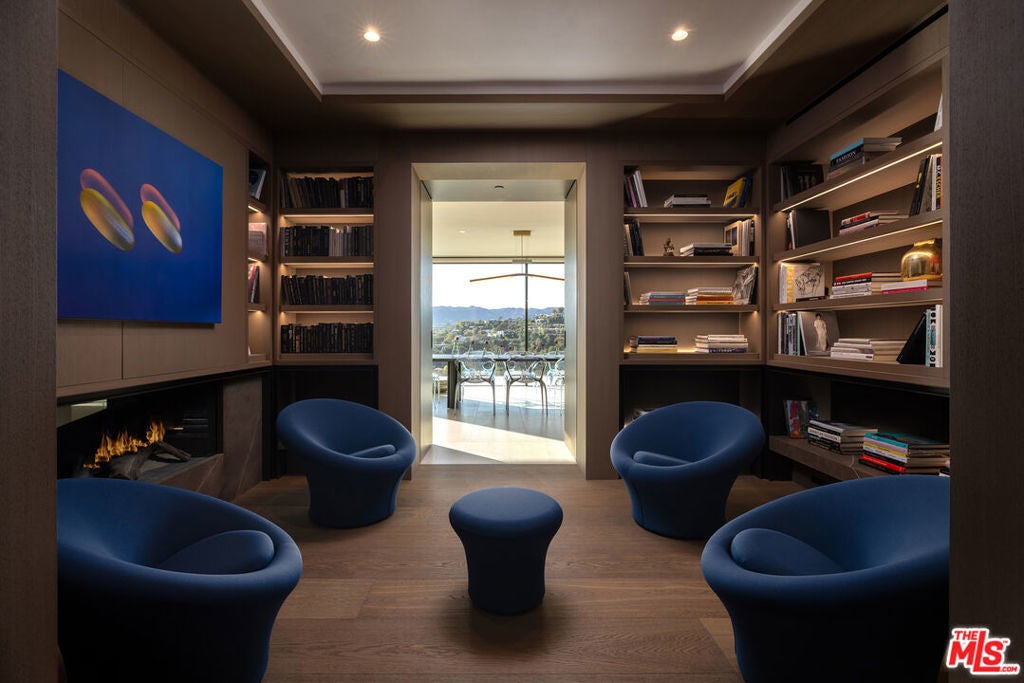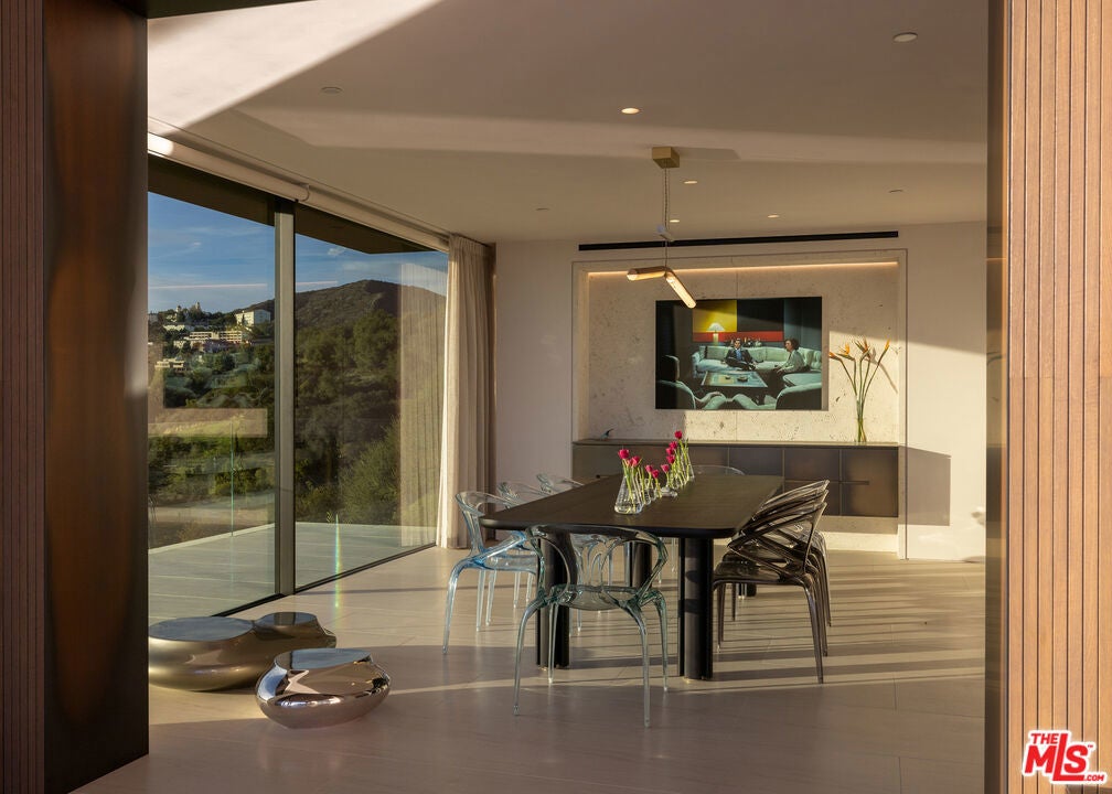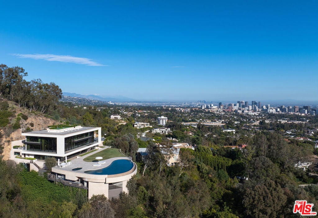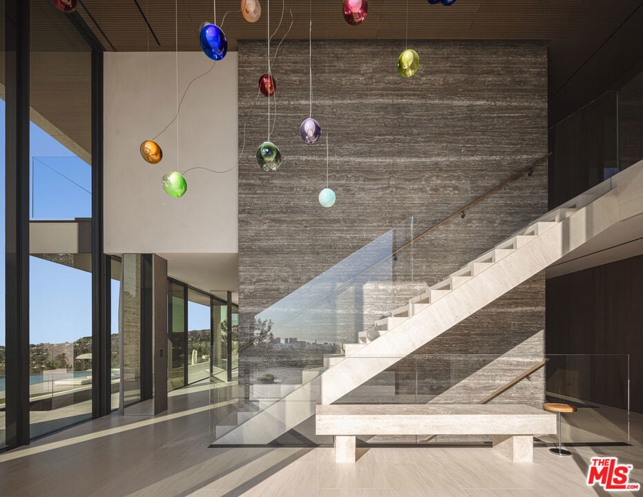 Commanding one of the most coveted promontories on the Westside, this architectural tour de force by Thomas Juul-Hansen unfolds across two acres, framing sweeping vistas from downtown to the Pacific. Clad in Alabastrino Travertine the same stone that graces the neighboring Getty Museum the residence strikes a perfect balance between modern design and natural warmth, with rich wood paneling and sculptural slatting adding depth and character to its expansive spaces. Designed for both grand entertaining and intimate living, the home's fluid layout and soaring volume is anchored by a striking formal living room, where sky-high pocket glass doors erase the boundary between indoors and out, revealing an uninterrupted panorama of city lights and ocean horizons. The dining room and chef's kitchen, both equally breathtaking, extend this effortless openness, blending refinement with functionality. The primary suite is a private sanctuary, enveloped in glass and spilling onto wraparound terraces that offer unobstructed views in every direction. Additional guest suites, each generously scaled, echo this same ethos of light, openness, and connection to the landscape. Elevated amenities abound a state-of-the-art home theater, fitness and wellness studio, and a meticulously curated wine cellar ensuring every element of modern luxury is accounted for. Beyond the walls of glass, the estate unfolds into an expansive outdoor retreat. A sprawling patio and flat grassy lawn lead to a showstopping infinity-edge pool and spa, seamlessly merging with the horizon. An outdoor kitchen, built-in BBQ, and a rooftop terrace unlike any other in Los Angeles provide the ultimate setting for both large-scale hosting and private sunset escapes. A masterclass in design, craftsmanship, and setting, this estate is more than a home it's a legacy, an architectural landmark poised above the city, offering an unparalleled fusion of privacy, scale, and world-class design.