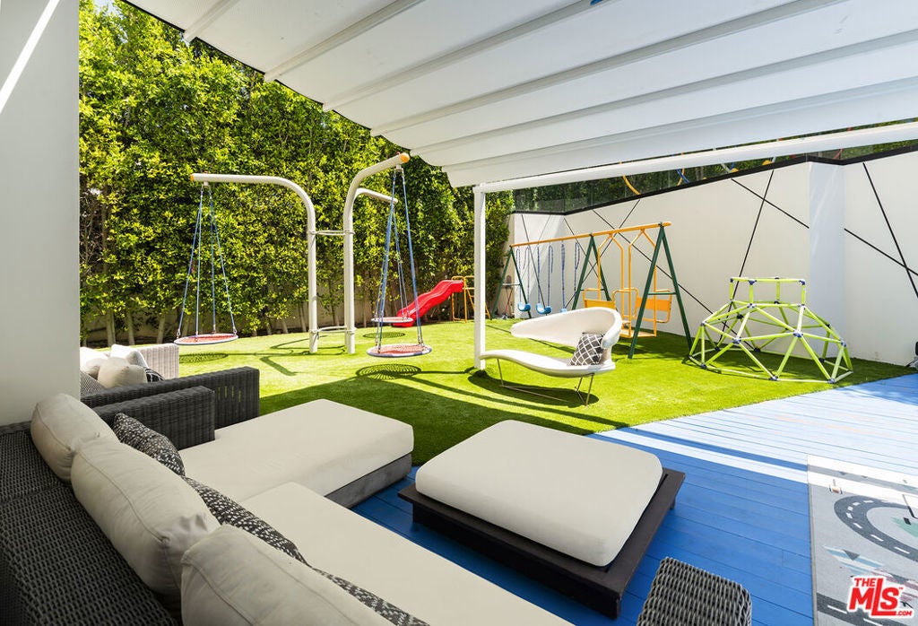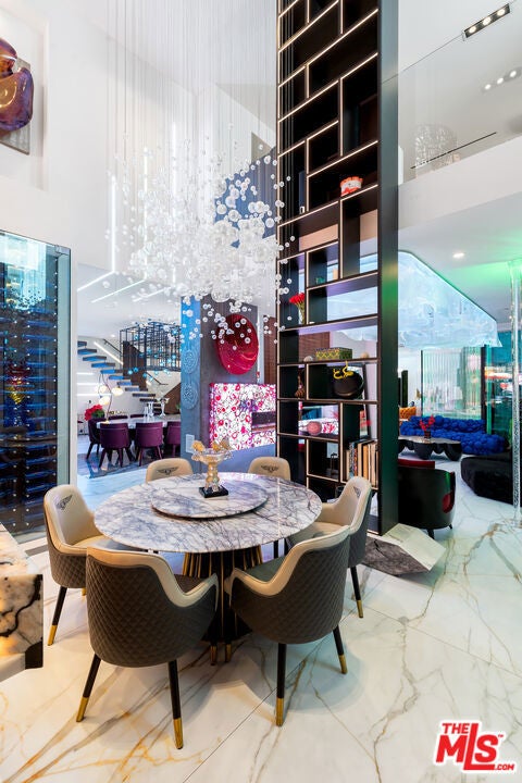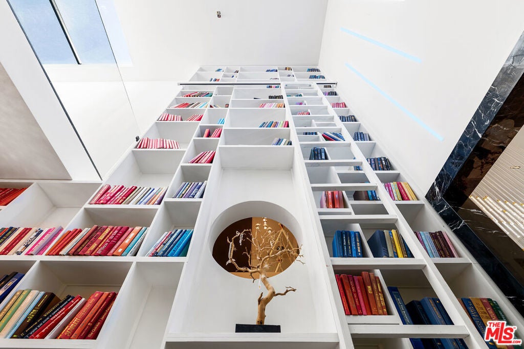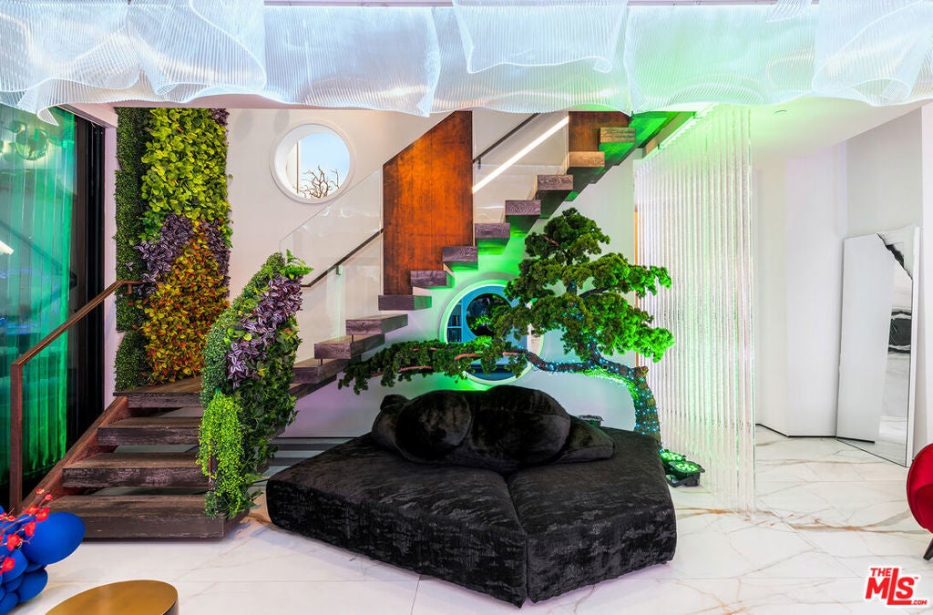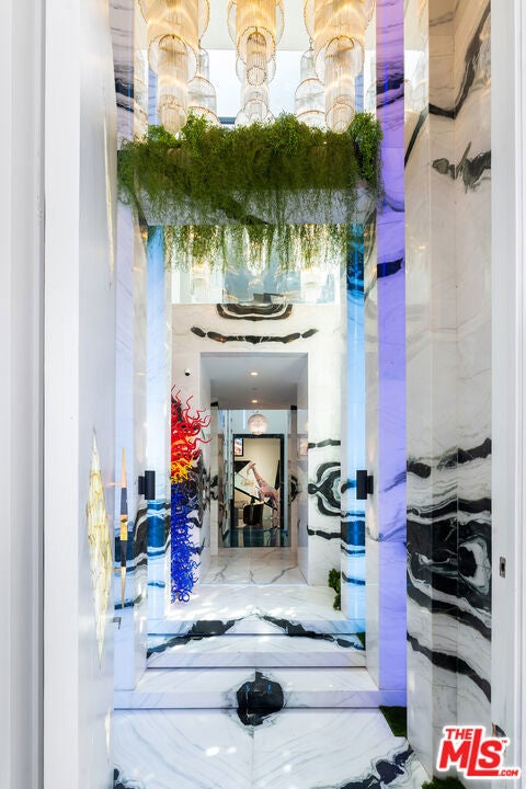 Introducing LUMINOSITY, an eclectic celebration of color and light, a vivid sanctuary of artistic splendor, an exotic play-place for all ages. Concealed behind gates and privacy hedges, this bedazzling compound promises pops of color everywhere, beginning with a dramatic stone pathway set beneath geometric arches and flanked by dual fire pits atop a reflecting pool with cherry blossom feature. Party guests arrive into a striking 25-foot foyer adorned in 32 slabs of open-book panda white marble, illuminated by seven chandeliers. Shape, angle, and pattern converge in the formal living room with its living moss walls, reimagined decorative fireplace, iridescent light displays, and piano nook. Numerous floor-to-ceiling and double-height book and display cases can be found throughout, drawing the eye upward and enhancing vertical volume. The kitchen is centered by a Brazilian marble waterfall island with backlit Patagonia and onyx marble serving ledge, gorgeous gothic chandeliers, and state-of-the-art brands such as Wolf and Miele, including three ovens, custom refrigerator, and cooktop. This creative culinary space also opens to an enchanting entertainer's deck with barbecue, perfect for evening drinks and dining al-fresco. Other public spaces inspire imagination with unique, thought-provoking fixtures and psychedelic finishes. The primary suite is spacious, with a sitting area and fireplace, fantastic Japanese soaking tub enclosure with lit onyx wall, and oversize changing wardrobe. For endless entertainment possibilities, there is a ball pit with projection screen, billiard/foosball room, and state-of-the-art cinema room with loft seating. There is also a gym and two laundry rooms. Smart home automation is by Lutron and controlled by iOS, Sonos speakers are found throughout, and EV charging is enabled in the garage. Outside, discover a pool and spa with baja shelf and Bellagio water feature, inspiring murals, side patios, terraces, and outdoor kitchen and bar surrounded by a mote. For the more rambunctious, there is a mini play park complete with swing apparatus and jungle gym. Furniture is included in the sale. This private wonderland promises a lifestyle of ultimate leisure and never-ending discovery. Welcome!