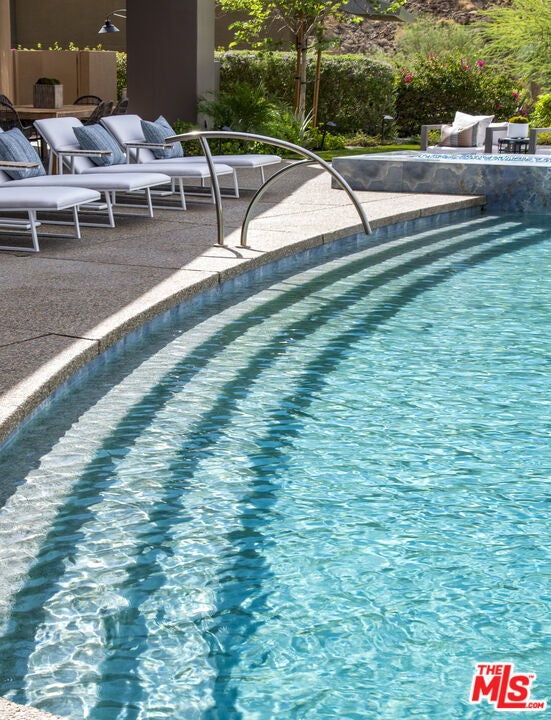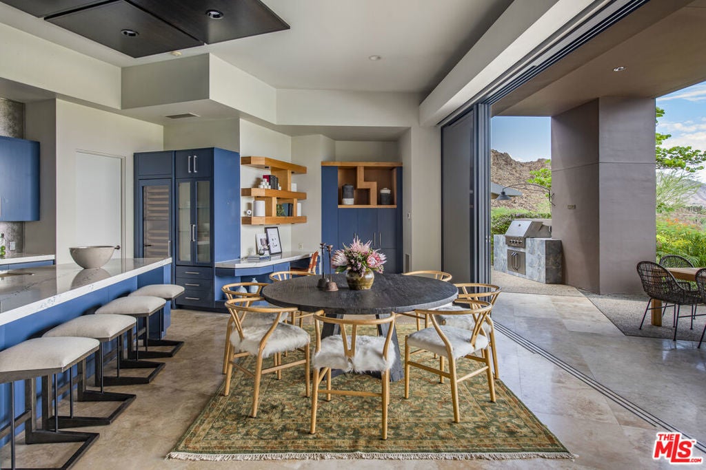 Located inside the gates of Ironwood Country Club, this striking modern home offers a rare blend of clean-lined design and effortless desert living. Walls of glass frame sweeping mountain and valley views, while natural light pours across the open layout. The residence features four bedrooms and four baths, including a dramatic primary suite with fireplace, dual walk-in closets, two water closets (one with smart toilet), and a spa-inspired bath with cold plunge tub and oversized shower. Two ensuite guest rooms add privacy, with a fourth bedroom currently serving as a fitness room. A newly updated chef's kitchen showcases premium appliances, built-in wine fridge, and oversized sunken wet bar perfect for entertaining against a backdrop of desert scenery. Outside, the refreshed pool and spa create a private retreat surrounded by drought-tolerant landscaping. Sustainability comes built-in with owned solar, newer HVAC, and a tankless water heater. Situated at the end of a cul-de-sac, this home delivers luxury, seclusion, and some of the most captivating views in the community.