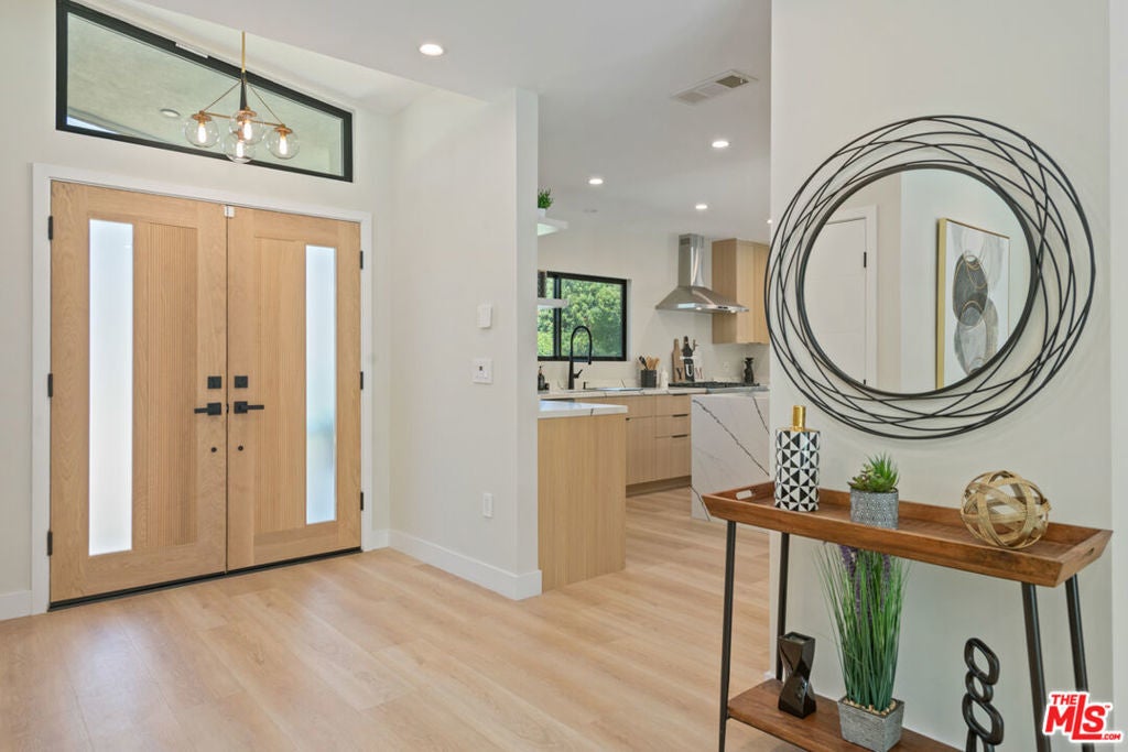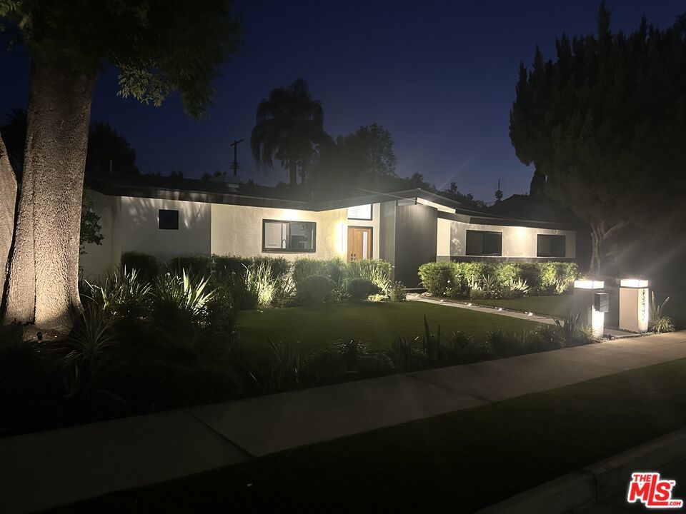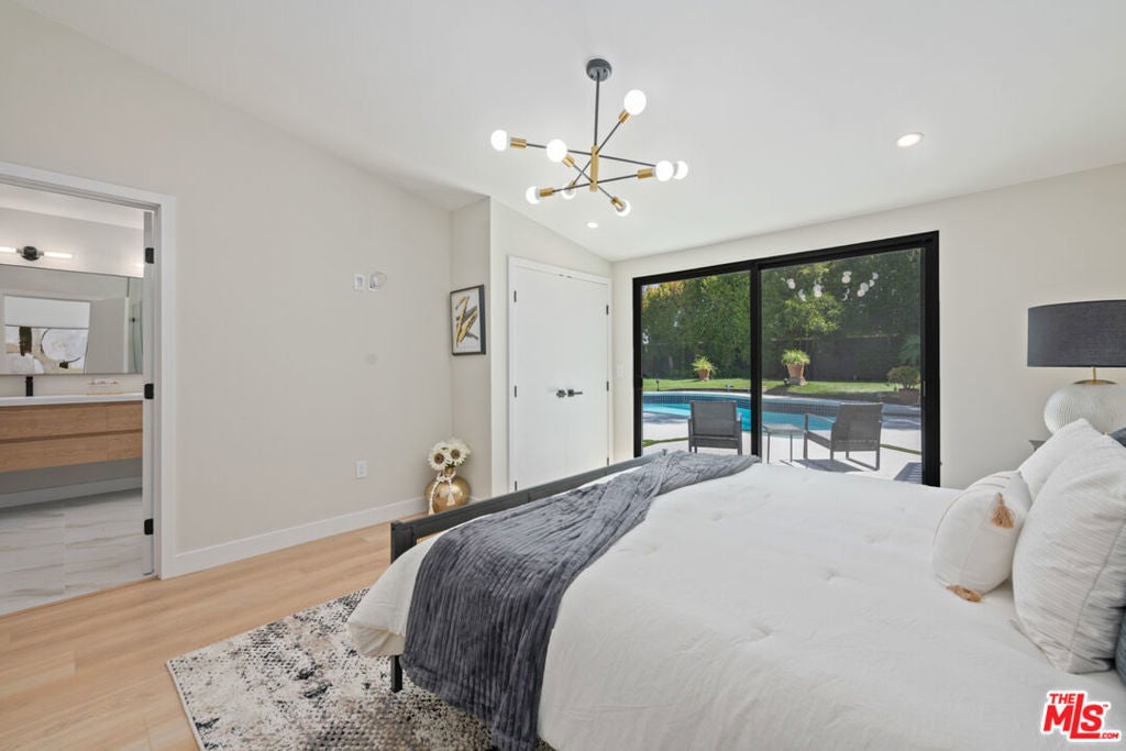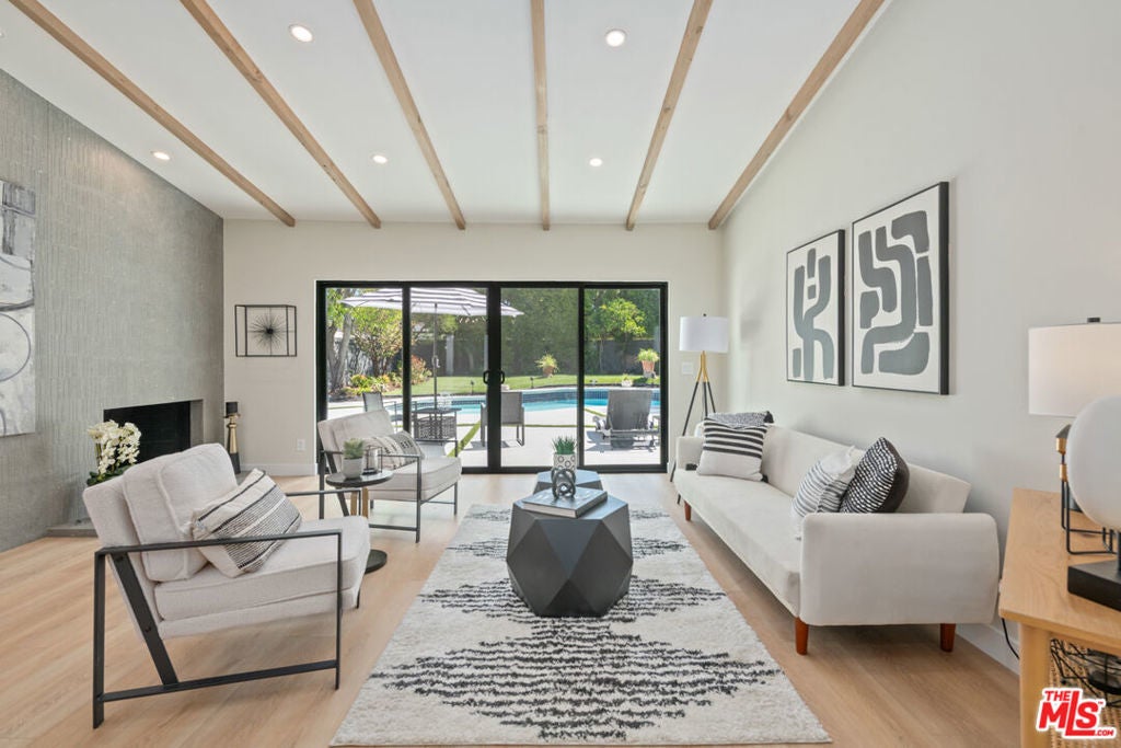 Welcome to an exquisite residence nestled in the prestigious Walnut Acres area of Woodland Hills, CA, on the quiet part of Burbank Boulevard. This Charles du Bois-design home embodies elegance and modern sophistication, offering a harmonious blend of mid-century charm and contemporary upgrades. Award-winning schools and walking distance to El Camino Real Charter High School. Step inside to discover a meticulously modernized and renovated interior, featuring a spacious 2,195 square-foot layout. The home provides three elegantly appointed bedrooms and three luxurious bathrooms. The heart of the home is the chef's kitchen, showcasing quartz counters, a magnificent center island, and a 36" Thor gas range. Stainless steel appliances and a walk-in pantry complete this culinary haven, while a wet bar with a wine fridge and a glass-enclosed wine closet caters to the most discerning entertainers. Experience the seamless flow of the living spaces, which include a formal dining room. Dual fireplaces elegantly serve both the living room and family room, which open onto the sprawling backyard, inviting you to a serene outdoor retreat where a sparkling new pool/spa with new pool equipment awaits, surrounded by lush landscaping and dazzling landscape lighting.The primary suite is a sanctuary of its own, with access to the beautiful backyard and pool, complete with an abundance of closet space and a beautifully designed en-suite bath with dual sinks, a separate soaking tub, shower and water closet. Smart home features include a Nest thermostat, a Ring doorbell, and a comprehensive security system with cameras that ensure peace of mind. A brand new roof, new Milgard double-pane windows and sliders and fully paid-for solar panels underscore the home's commitment to efficiency and sustainability. Other features include a full indoor laundry room (which could also serve as an office), an oversized two-car garage that offers additional storage or workshop space, complemented by a gated driveway that accommodates four additional cars for off-street parking. Proximity to Calabasas for shopping and fine dining. A must-see for discerning buyers looking for a home that has it all!