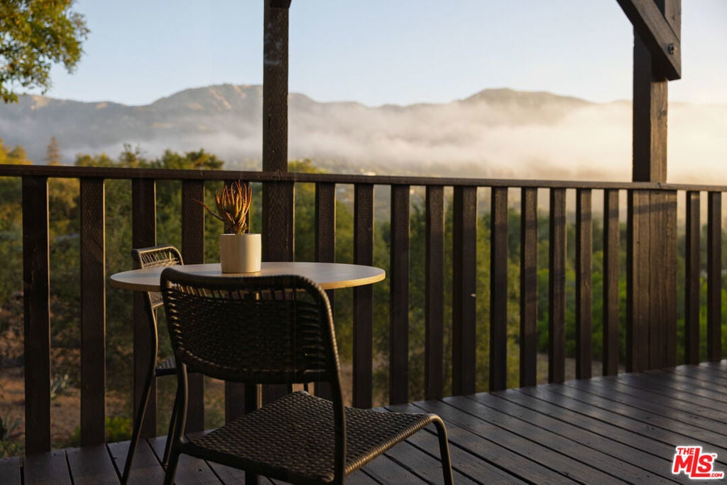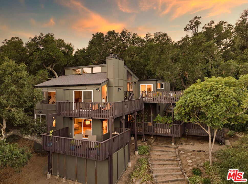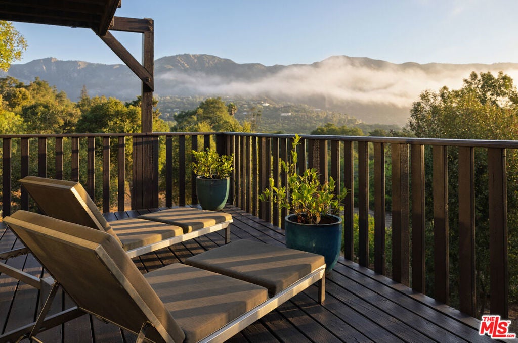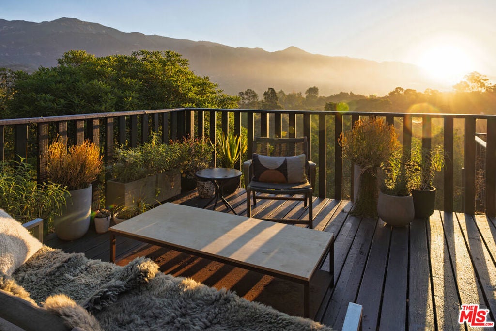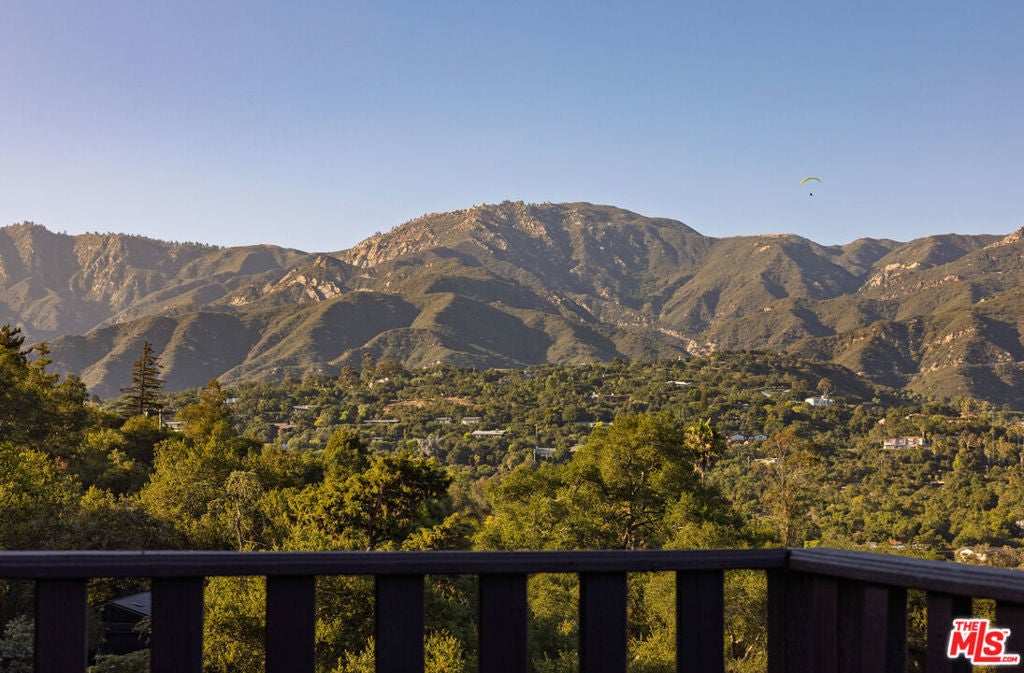 This Riviera Summit mid-century retreat, set on approximately one acre, embodies a rare harmony of architecture and nature. Just minutes from downtown Santa Barbara and Montecito's shopping and dining, the serene multi-level residence is celebrated for its architectural significance, mountain vistas, sunrises and moonrises, and daily encounters with deer, hawks, and the evening song of coyotes. The home's open layout blends European sensibility with Santa Barbara's signature indoor-outdoor living, seamlessly connecting the main living, kitchen, and dining spacesappointed with high-end appliancesto multiple view decks, ideal for year-round entertaining, al fresco dining, and relaxed lounging. Arrival is marked by a distinctive entry deck designed around two graceful oak trees, leading to a calming water fountain. Inside, expansive windows, beamed ceilings, and a striking stone fireplace frame mountain views that serve as living artwork. The private primary suite occupies its own level, offering a sitting area, fireplace, generous closet, flexible office space, and a secluded deck that heightens the sense of retreat. Its spa-like bath features a soaking tub with views to the natural surroundings. Freshly painted inside and out, with a new roof and gutters, the residence offers peace of mind along with timeless style. Bordered by Franceschi and Parma Parks, the home is immersed in nature with world-class hiking and cycling just outside the door. Below the residence, the gently sloping acre invites possibilities: a pool, orchard, enhanced landscaping, or an ADU with existing design plans and site approvals, an opportunity to expand this mid-century gem into a multi-generational enclave or guest retreat.