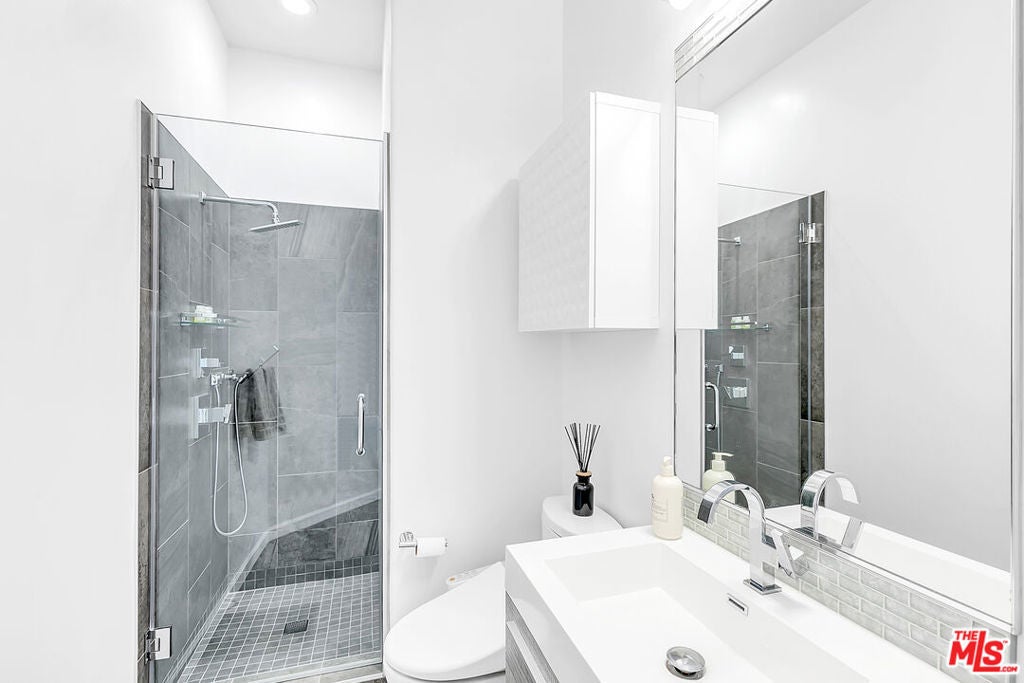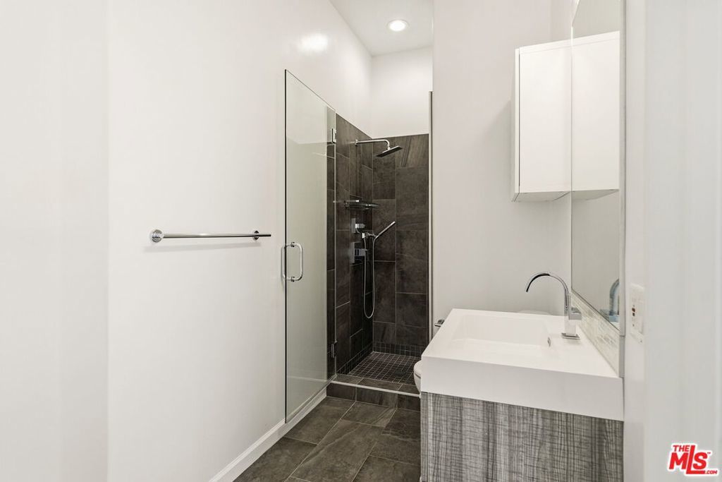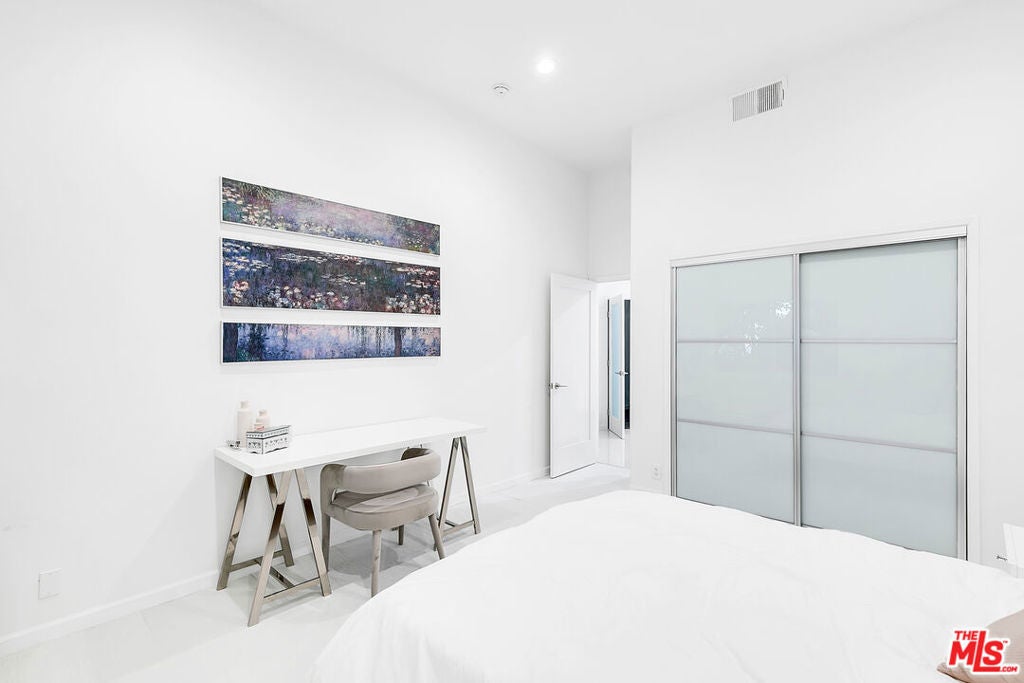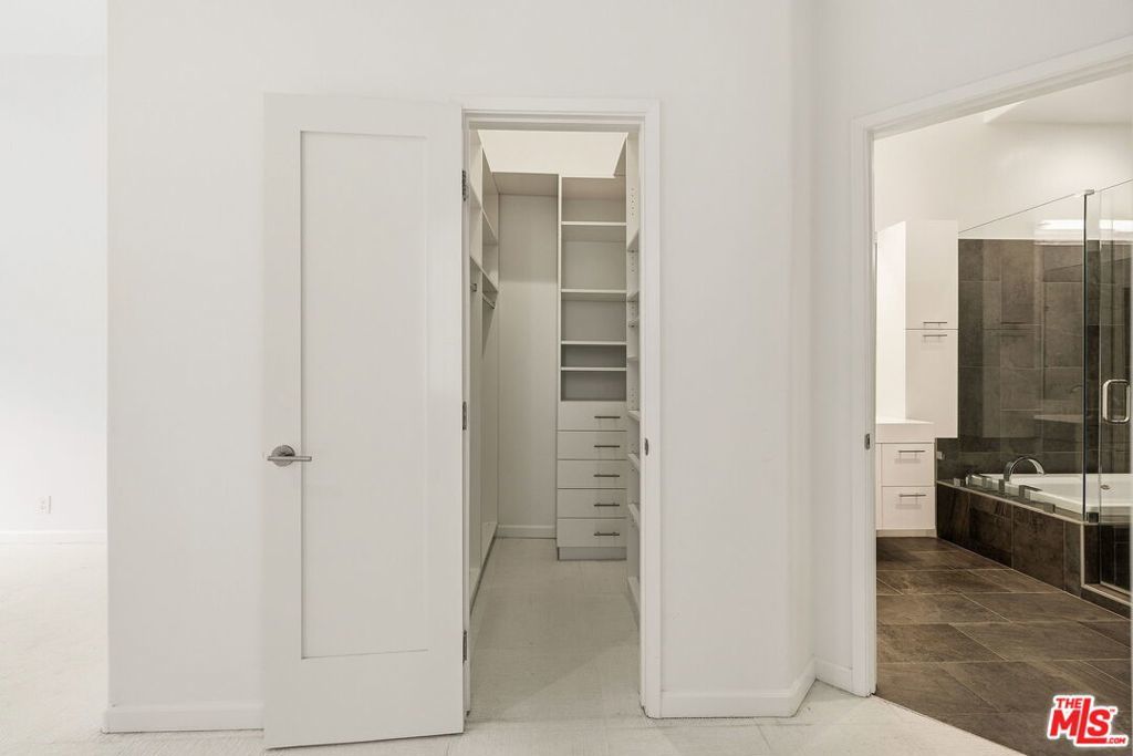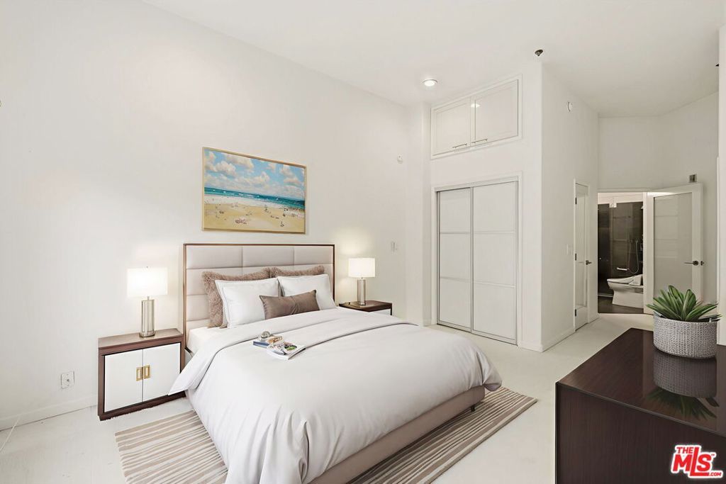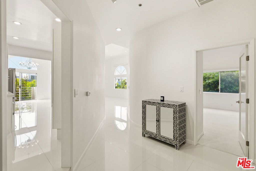 Location, location, location! Just steps from Melrose Place, this renovated penthouse boasts soaring ceilings, floor-to-ceiling windows, and sweeping views of the Hollywood Hills and West Hollywood skyline. The open layout is filled with natural sunlight and features sleek white porcelain tile and upgraded flooring. A gourmet kitchen with quartz countertops, modern cabinetry, and stainless steel appliances opens to the living area. The spacious primary suite offers a walk-in closet and spa-like bath with a jetted tub and luxury shower system.