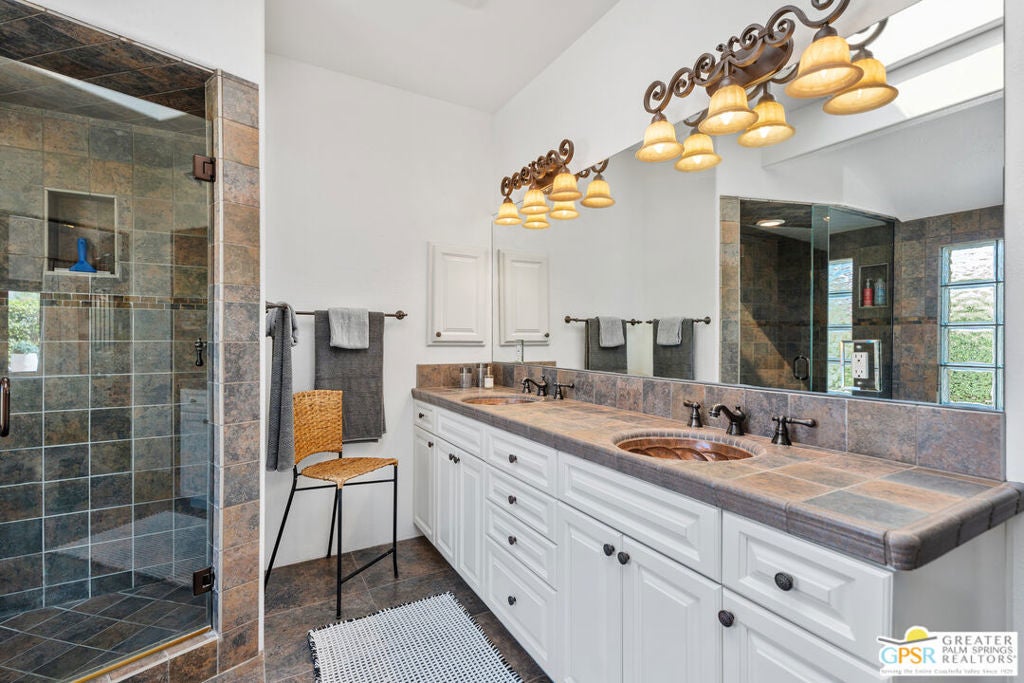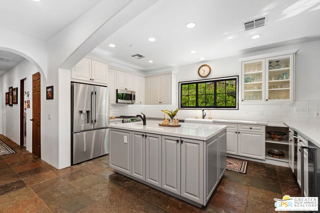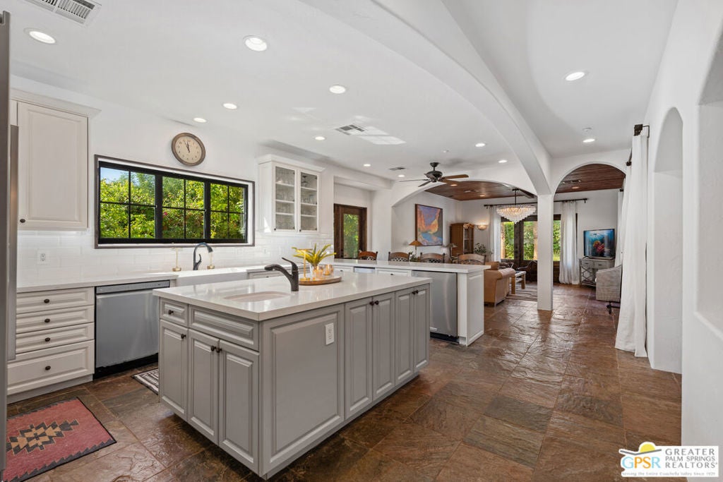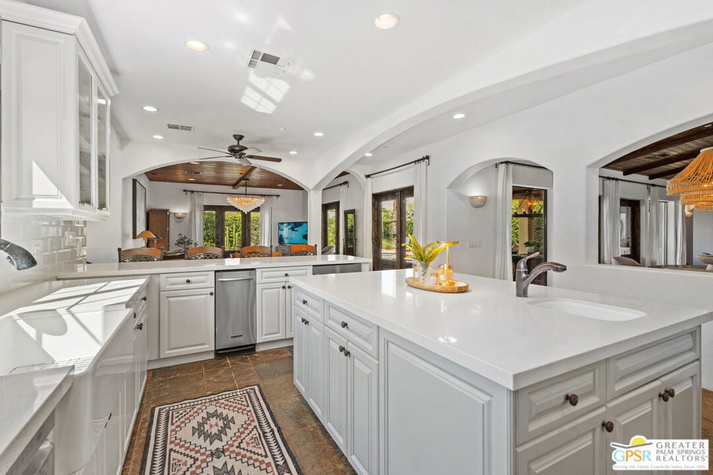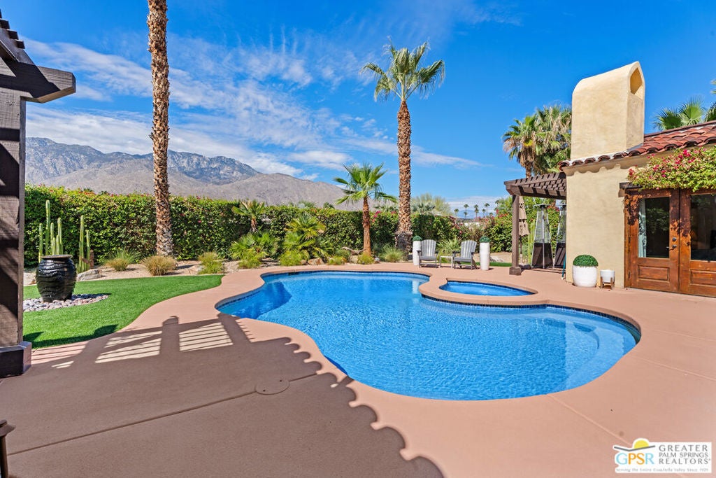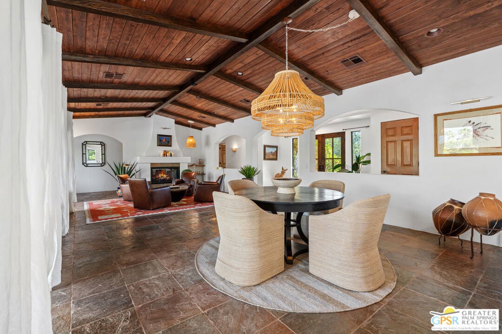 UNBELIEVABLE PRICE REDUCTION! This is now officially a steal! Seller has already purchased another home and is very motivated. Come see this beautiful home today and make us an offer. Nestled in the heart of Araby, one of Palm Springs' most coveted neighborhoods, this stunning residence combines the look of traditional Mediterranean and Spanish architecture with all the modern amenities. Sitting on land that you own, and with no HOA fees, this four-bedroom, four-bathroom home offers an exceptional blend of comfort and sophistication. Located on a private street with its own security gate, you drive up to this exceptional home that boasts a direct access 3-car garage with additional driveway parking. As you enter the property through the front gates, you are surrounded by a lushly landscaped courtyard, complete with its own firepit and conversation seating area. The Saltillo tile pathway leads to the rustic alder double entry doors. Through the doors, the view of Mt. San Jacinto takes your breath away. The charm continues with a layout that emphasizes open spaces and abundant natural light. The wood-clad vaulted ceiling with exposed wooden beams and numerous archways add to the property's architectural allure, while the slate flooring provides a rustic touch. Sit down to enjoy an intimate evening with friends in front of the fireplace or use the entire expanse of the great room to entertain a crowd. The gourmet kitchen features a large central island, expansive breakfast bar and modern appliances, but the slate floors seamlessly integrate the rustic charm throughout. A separate family room adjacent to the kitchen offers another space for TV viewing or intimate gatherings. The primary bedroom features a cozy fireplace and stunning mountain views through 2 sets of double doors. The large ensuite bathroom boasts a long double vanity with beautiful copper sinks. You will also find a separate tub and shower and abundant natural light, providing a truly indulgent retreat. There are three additional bedrooms; two with ensuite bathrooms and one with a private entrance and patio. The free form pool and spa on the over-sized lot is complemented by the gazebo and outdoor barbeque area. There is a large, covered patio for al fresco dining and it provides the perfect setting for entertaining or just watching the sunset over the mountaintops. Don't miss your opportunity make this exceptional residence, located on historic Anza Trail, your own!