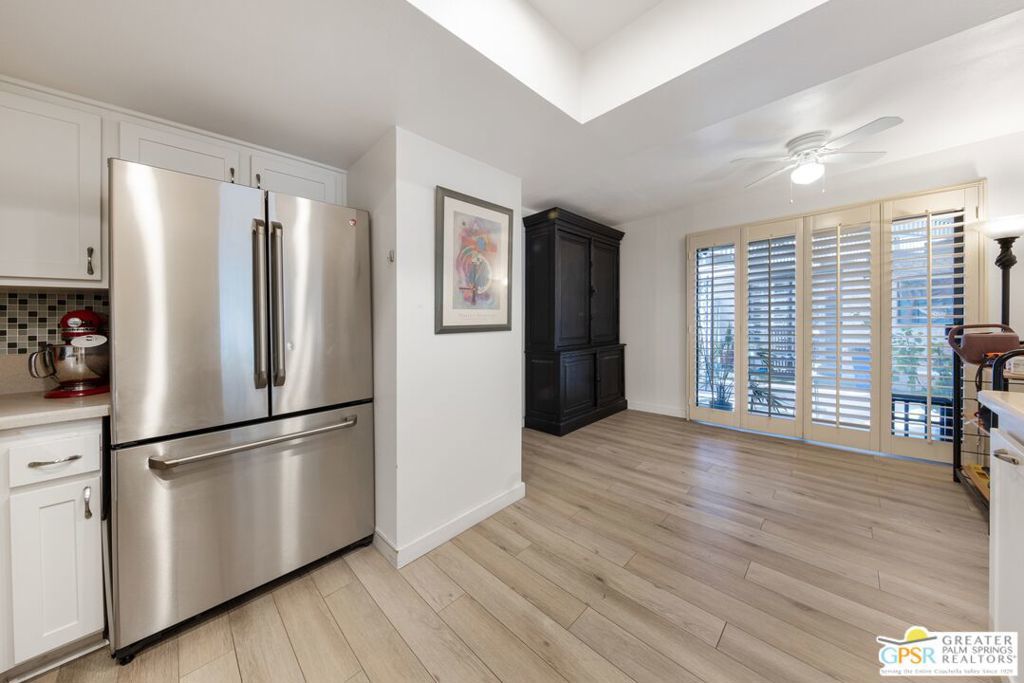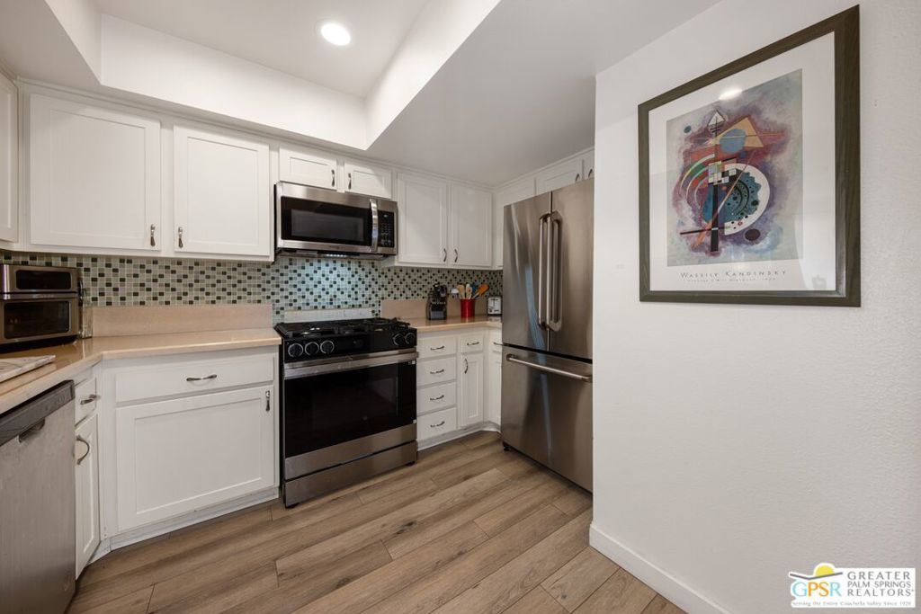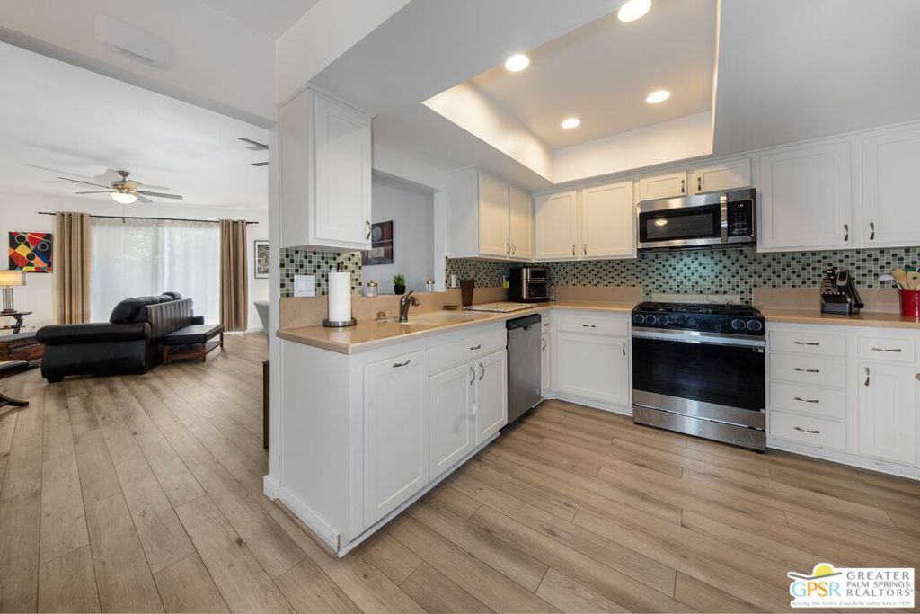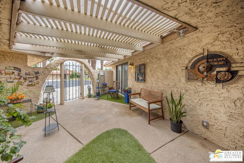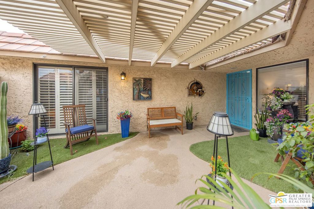Situated at the end of a peaceful cul-de-sac, this beautifully updated 2-bedroom, 2-bathroom home in Cathedral Canyon Country Club blends modern elegance with desert serenity. This home features a chef-inspired kitchen equipped with high-end appliances and sleek flooring throughout. The garage includes storage cabinets for added convenience. The home's private setting provides peace and quiet while still offering easy access to community amenities, including refreshing pools for those warm desert days. The semi-private backyard is a peaceful oasis, complete with a charming patio perfect for relaxing or entertaining. This home presents an incredible opportunity to embrace the desert lifestyle. Don't miss out on owning a piece of paradise in this sought-after community.