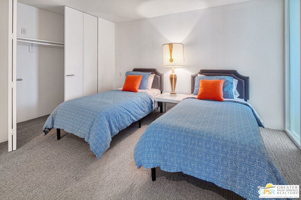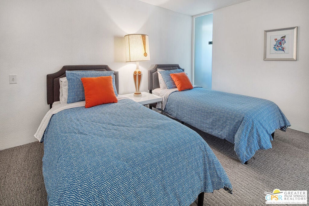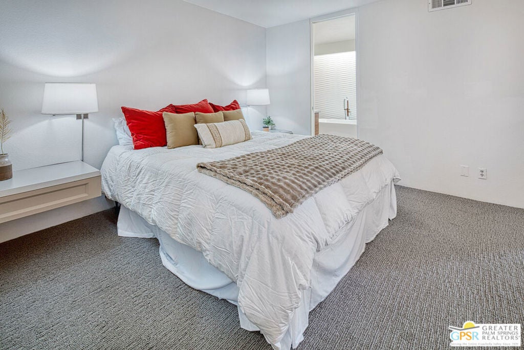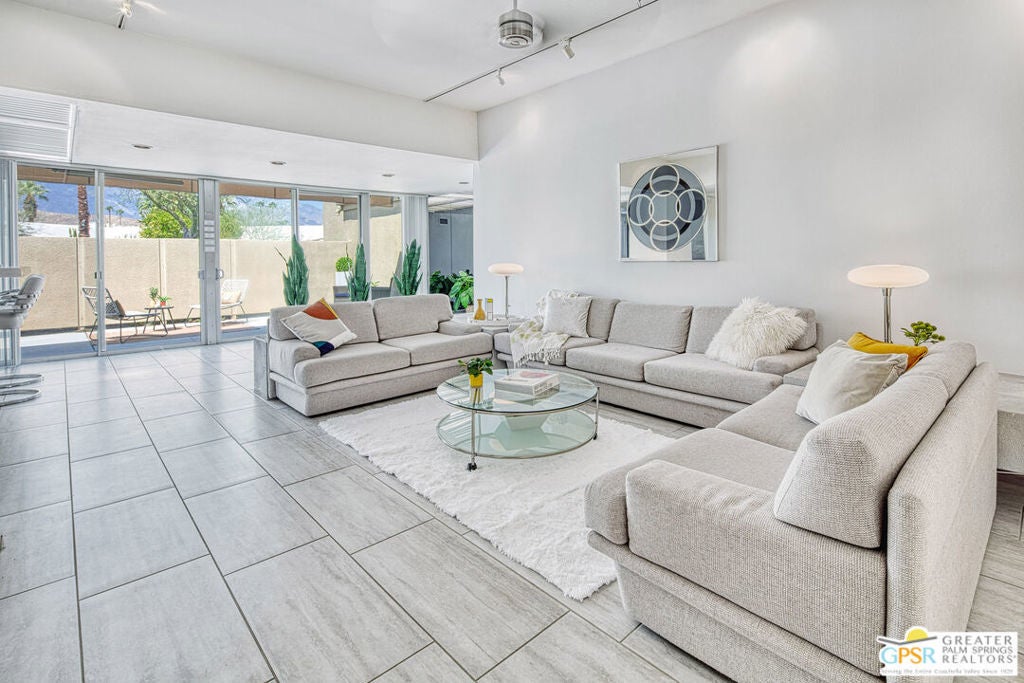 BRING OFFER!: Step into a timeless 1966 architectural home in historic Tamarisk Gardens where iconic mid-century meets modern design. Glass sliders frame dramatic western mountains while sunlight pours through skylights, highlighting tall ceilings and retro double-sided fireplace. Its TRANQUIL poolside location in the quiet 28-unit community offers the very best in privacy, convenience, and views. Designed for both Relaxation and Entertaining, the flexible floor plan offers three en suite baths plus versatile bonus spaces that adapt seamlessly to your lifestyle: (studio? home office? gym?) Recent upgrades: Wi-Fi enabled HVAC, NEW 200/220 electrical panel, dedicated EV charger in 1 of 2 deeded parking spots. Your front door opens directly to the peaceful, sparkling pool and spa, surrounded by "lushly landscaped grounds" (as described in M. Riche's book MOD MIRAGE.) Fee-simple ownership (you own!) LOW HOA covers premium cable & wifi, garbage, grounds, roof & exterior maintenance. Only two owners in units history--never rented, this rare meticulously maintained home offers legacy alongside Greater Palm Springs luxury living. Tamarisk Country Club member bonus: enjoy a secure private cart/ walking gate entry. (Buyer & buyer's agent to verify all information.)