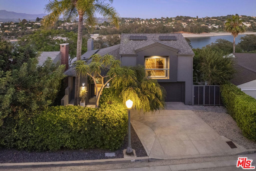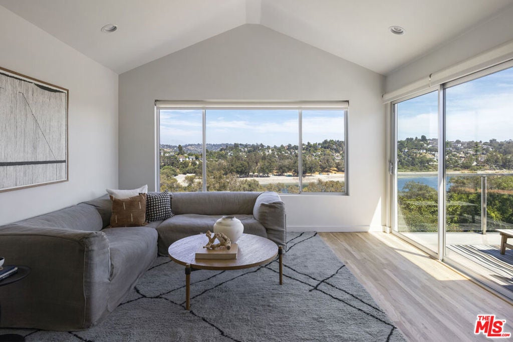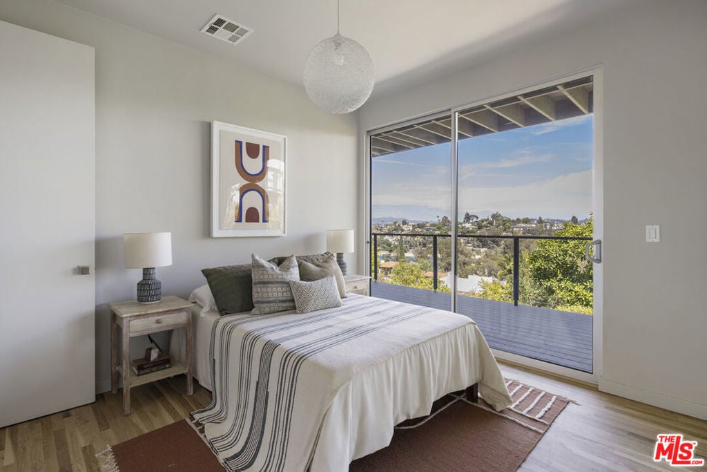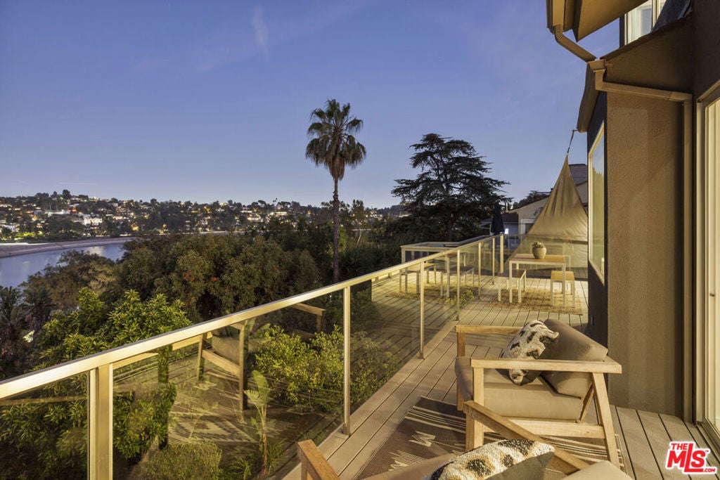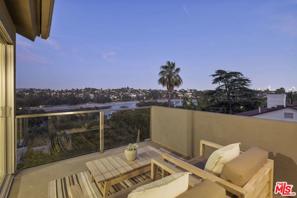 In prime Silver Lake, this radiant, updated Modern commands spectacular panoramic vistas and enjoys rare privacy within the coveted Ivanhoe Elementary boundary. Vaulted ceilings, oversized windows, and sliding doors bring in sunlight and frame striking views of the Reservoir and mountains, opening to decks for morning coffee and al fresco dinners in the glow of moonrise over the hills. Newly refinished hardwood floors with an eco-friendly European finish run throughout the expansive open-plan layout; the stylish kitchen includes stainless appliances and a Carrara marble waterfall island. Three bedrooms include a top-level primary with a sitting room, private terrace, and luxe bath with incredible sightlines. Multiple Trex decks extend the living space outdoors; the updated yard is a serene setting with ten mature fruit trees and room to add a pool. Amenities include HVAC, owned solar panels, gated access, and garage. You're just blocks from LAMILL, Broome Street, Forage, the Reservoir, and more.