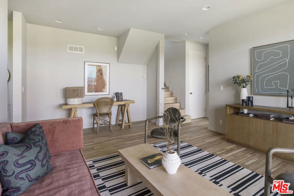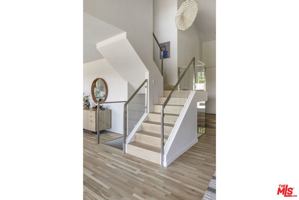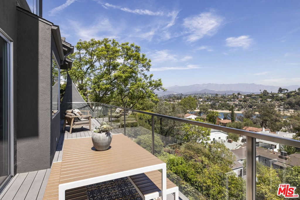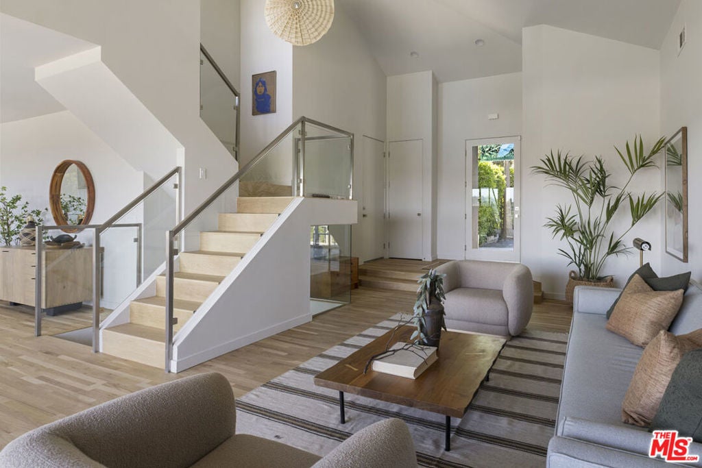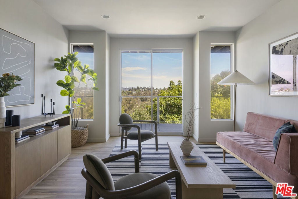 In prime Silver Lake, this radiant, updated Modern commands spectacular panoramic vistas and enjoys rare privacy within the coveted Ivanhoe Elementary boundary. Vaulted ceilings, oversized windows, and sliding doors bring in sunlight and frame striking views of the Reservoir and mountains, opening to decks for morning coffee and al fresco dinners in the glow of moonrise over the hills. Newly refinished hardwood floors with an eco-friendly European finish run throughout the expansive open-plan layout; the stylish kitchen includes stainless appliances and a Carrara marble waterfall island. Three bedrooms include a top-level primary with a sitting room, private terrace, and luxe bath with incredible sightlines. Multiple Trex decks extend the living space outdoors; the updated yard is a serene setting with ten mature fruit trees and room to add a pool. Amenities include HVAC, owned solar panels, gated access, and garage. You're just blocks from LAMILL, Broome Street, Forage, the Reservoir, and more.