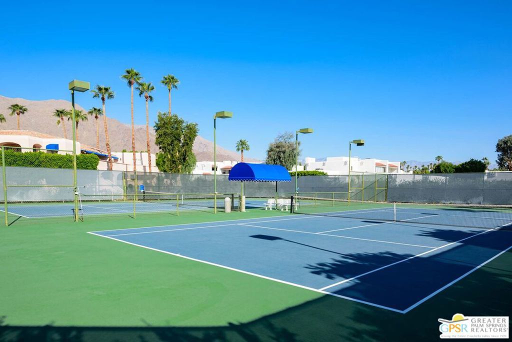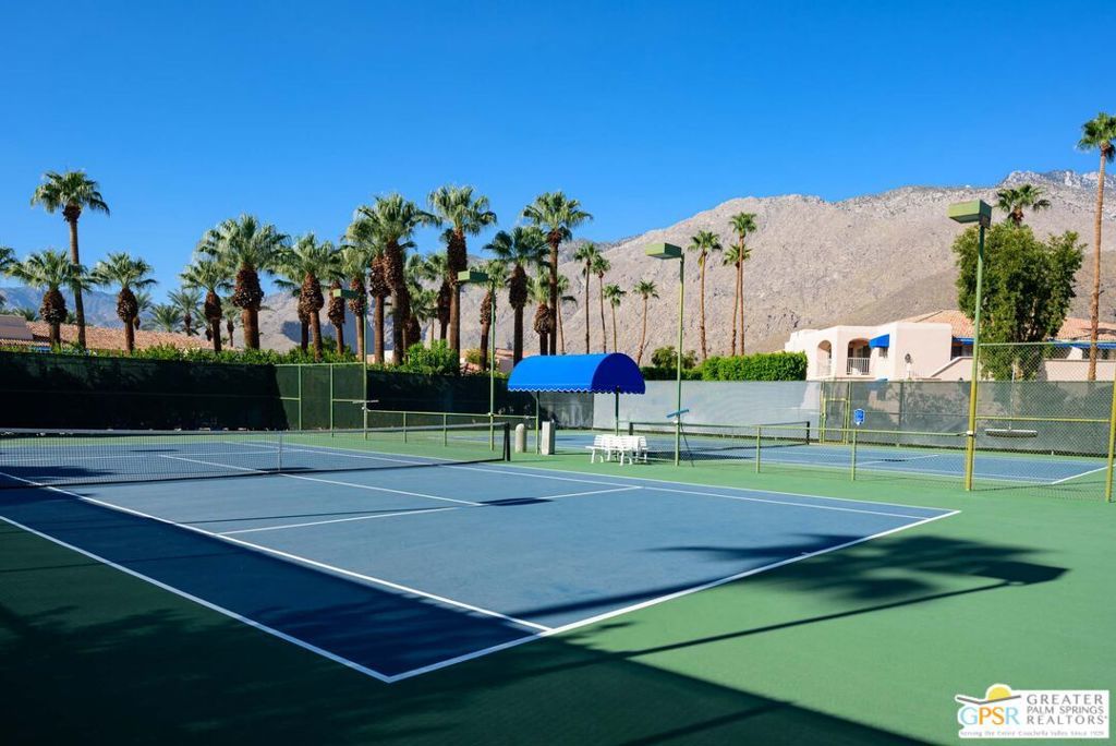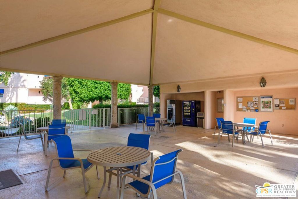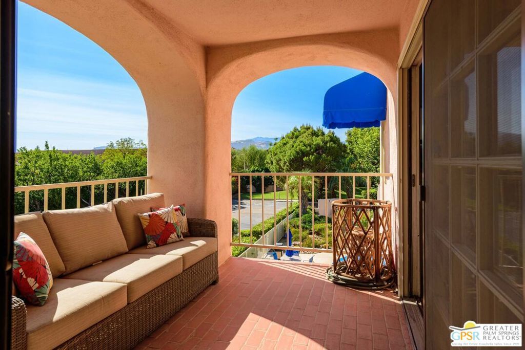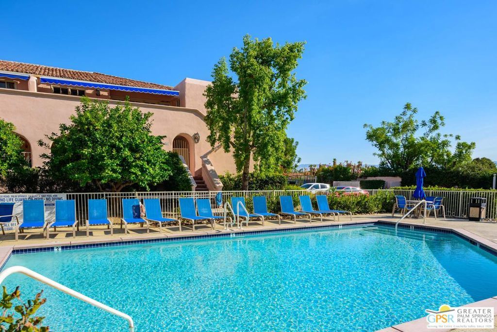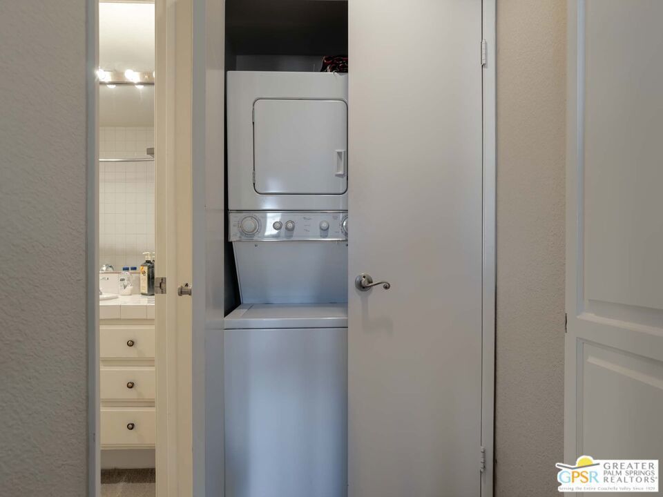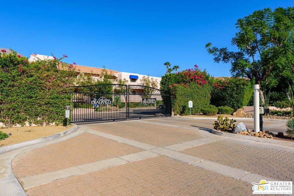 The Deauville gated community boasts beautiful grounds, three pools, tennis courts, a clubhouse, exercise room and subterranean parking. Spacious 2 bed 2 bath upper end unit condo with in-unit washer/dryer. One of the best locations in the complex, with two balconies; the larger balcony has a retractable awning for sunny days with great views of the pool and San Jacinto Mountains. This fantastic location is a short distance to downtown, the casino, shopping, dining, and entertainment. This is an all-electric complex, perfect for full-time residency or a vacation getaway. The HOA includes water, trash, grounds, pools, spas, spectrum internet including the building's exterior, and roofs.