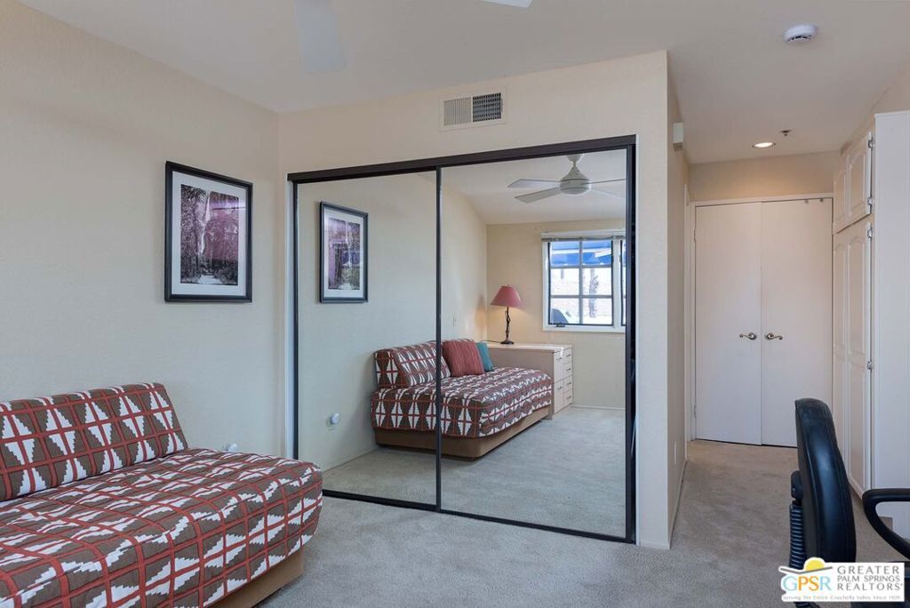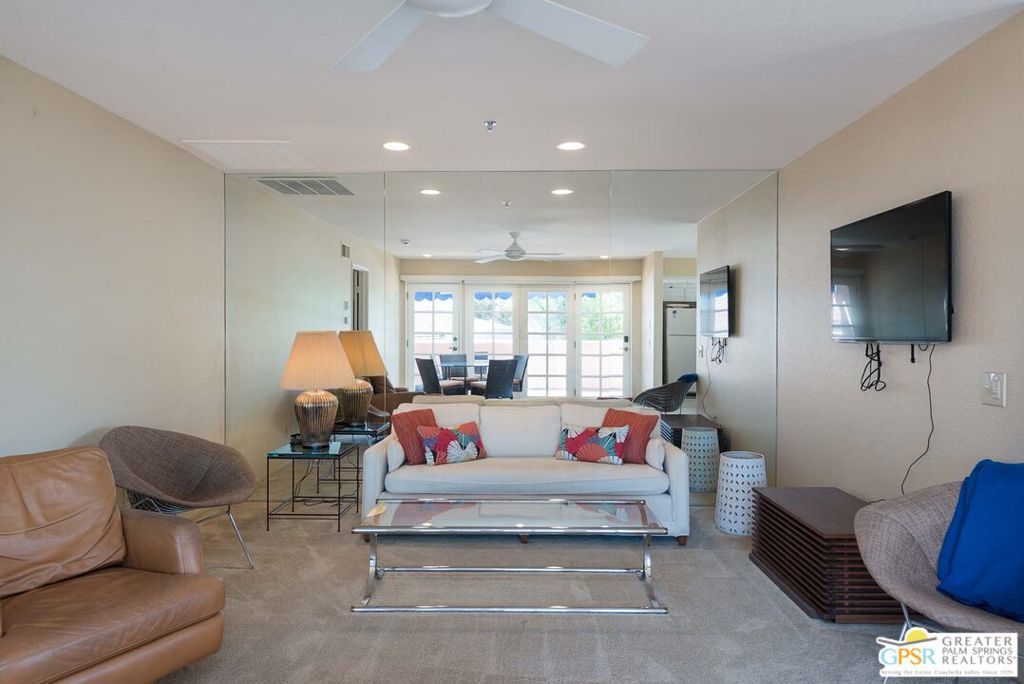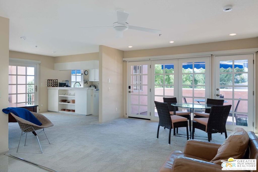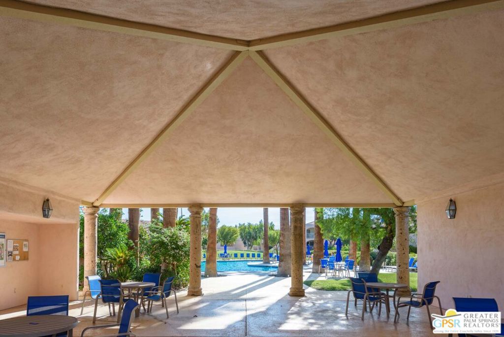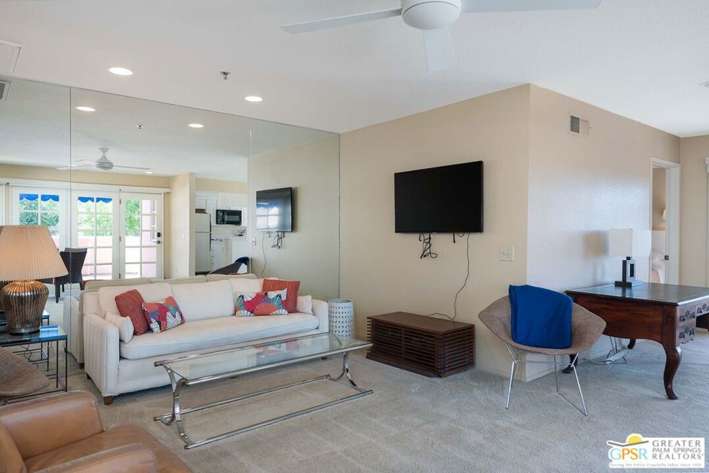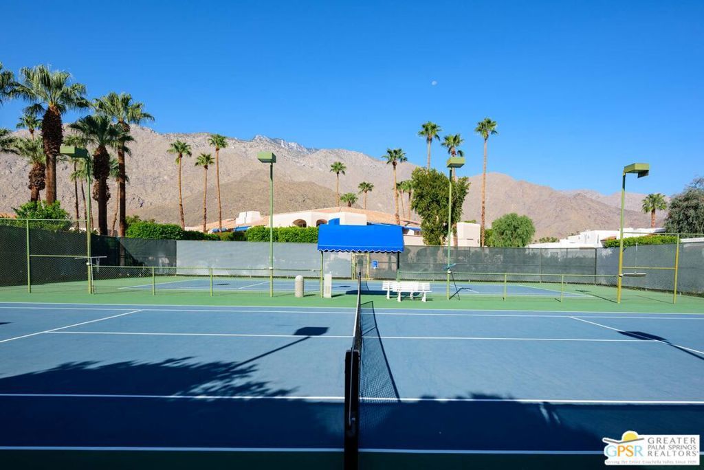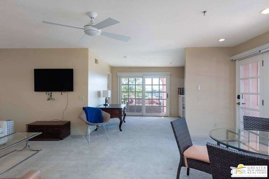 The Deauville gated community boasts beautiful grounds, three pools, tennis courts, a clubhouse, exercise room and subterranean parking. Spacious 2 bed 2 bath upper end unit condo with in-unit washer/dryer. One of the best locations in the complex, with two balconies; the larger balcony has a retractable awning for sunny days with great views of the pool and San Jacinto Mountains. This fantastic location is a short distance to downtown, the casino, shopping, dining, and entertainment. This is an all-electric complex, perfect for full-time residency or a vacation getaway. The HOA includes water, trash, grounds, pools, spas, spectrum internet including the building's exterior, and roofs.