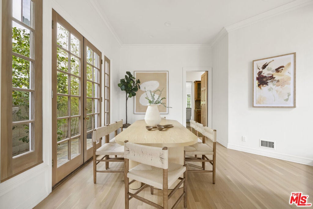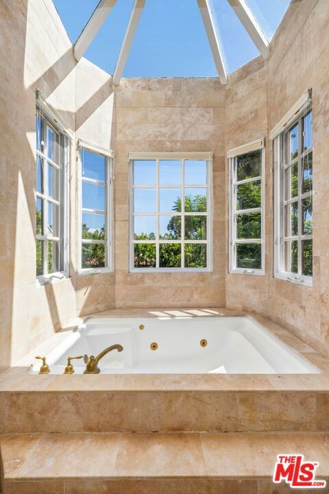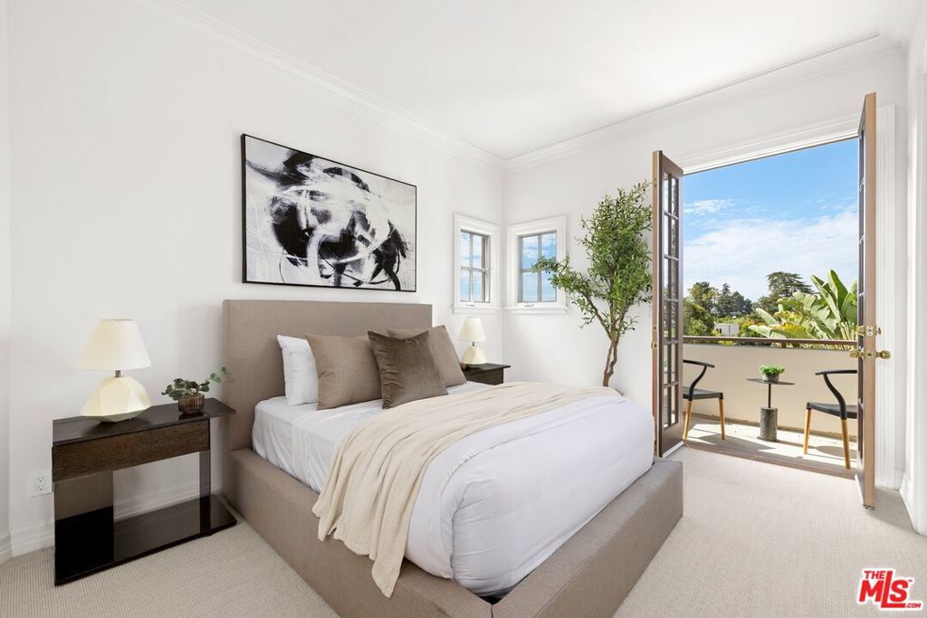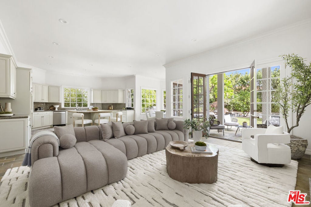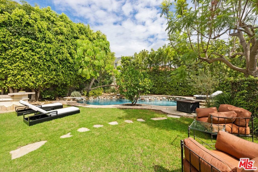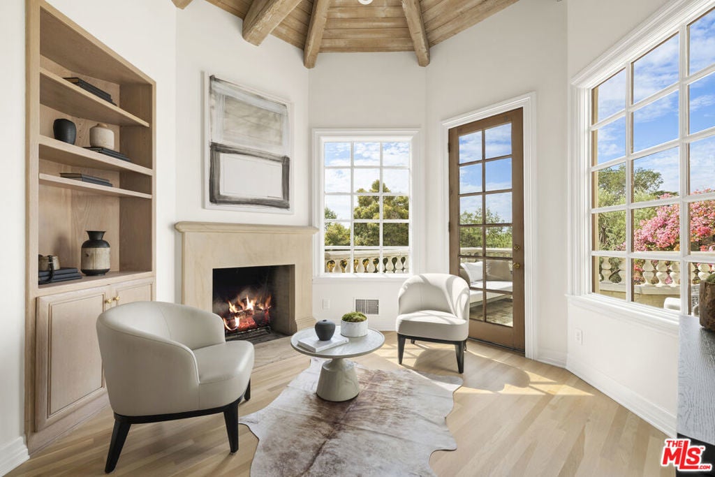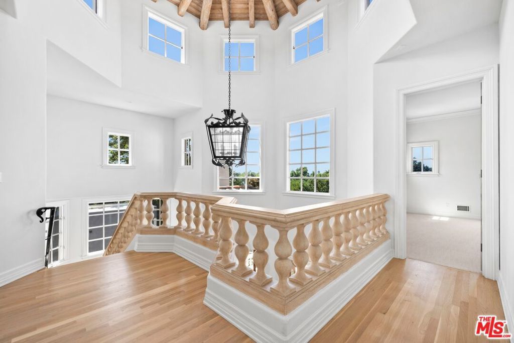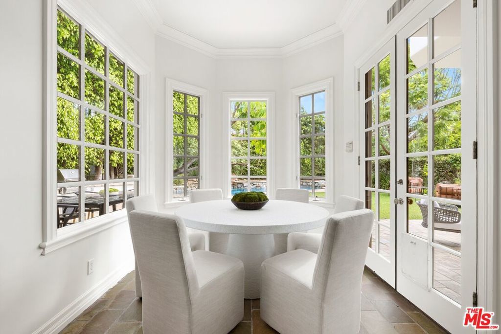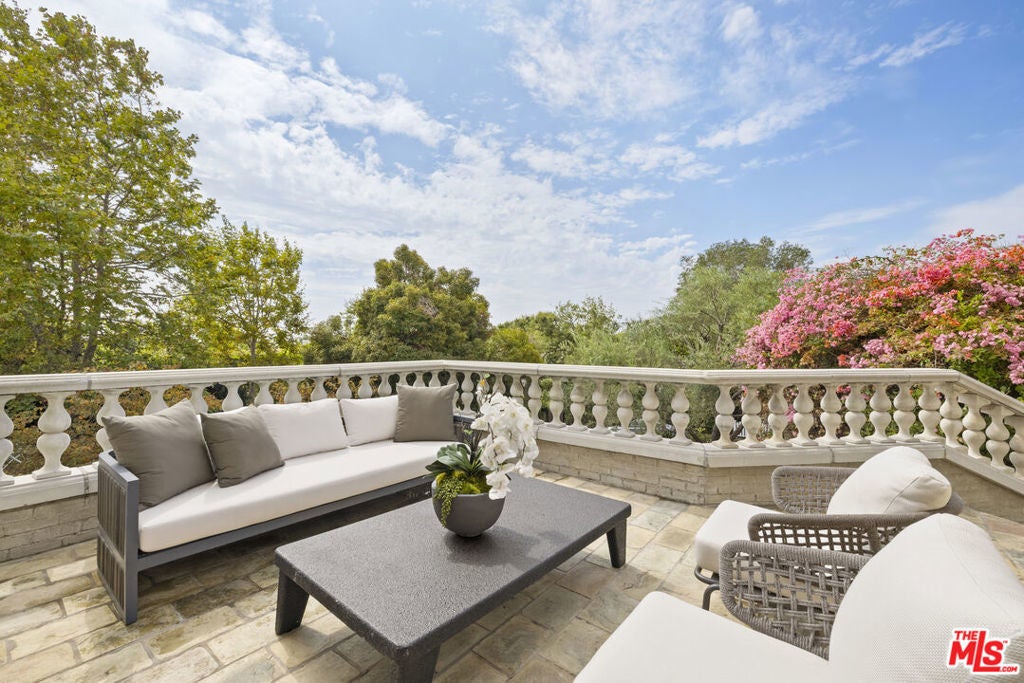 Set on one of Brentwood's most coveted tree-lined streets, this timeless Spanish-inspired estate is surrounded by lush landscaping and designed to balance classic elegance with modern livability. Beyond the striking facade, a beautiful, welcoming entrance introduces interiors filled with natural light, offering both everyday comfort and grand spaces for entertaining. The main level flows seamlessly with a formal living room and fireplace, elegant dining room, spacious family room with bar, sunlit breakfast nook, and a flexible den/office. Upstairs, the primary suite serves as a private sanctuary with a sitting room, fireplace, balcony, dual walk-in closets, spa-like bath beneath a dramatic skylight, and an attached office, while three additional bedrooms provide comfort for family or guests. The lower level offers a media room, bedroom suite, and direct access to an oversized 5-car garage (accommodating up to 6 compact cars). Outside, the backyard is a true retreat with a pool, spa, and outdoor kitchen surrounded by mature landscaping that ensures complete privacy, while multiple patios and terraces create effortless indoor-outdoor living just moments from Brentwood Village, top schools, and the best of the Westside.