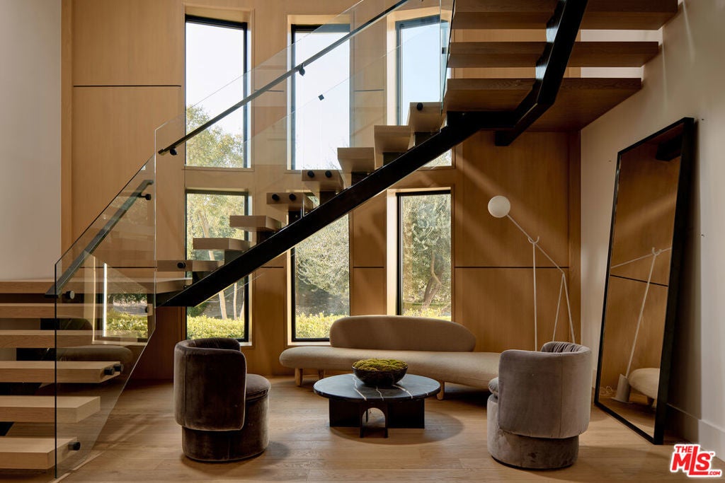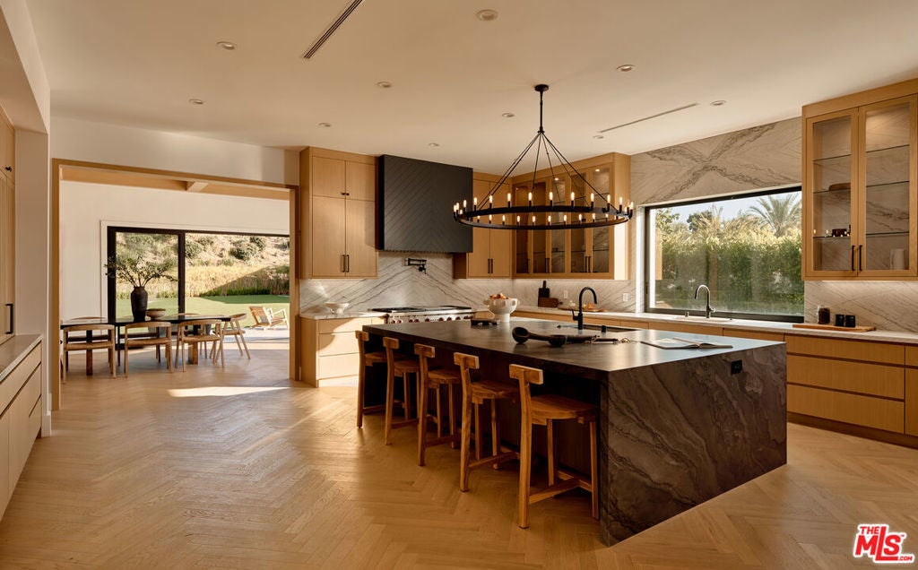 Tucked behind double security gates within the esteemed Estates at The Oaks, this exceptional residence spans approximately 15,000 square feet across more than an acre of privately gated grounds. Set near the end of a quiet cul-de-sac, the approach introduces soaring 30-foot ceilings and an open-air interior courtyard, immediately establishing the home's scale, serenity, and seamless connection to the outdoors. Expansive living spaces are drenched in natural light from grand arched windows and floor-to-ceiling glass doors. Oak floors with herringbone accents run throughout, anchoring a layout that balances volume with warmth. A formal dining room with coffered ceilings opens to an alfresco terrace with fireplace, while a sunken fireside lounge near the pool offers a one-of-a-kind entertaining moment. Additional amenities include a fully equipped home theater, a dedicated gym with sauna, a custom office, and a striking wine display and tasting lounge enclosed in glass. The heart of the home is a newly designed chef's kitchen appointed with top-tier appliances, a spacious breakfast area, oversized butler's pantry, and separate caterer's kitchen all oriented to flow into the family room, where sliding glass walls frame garden views and a dramatic full-height fireplace. Seven total bedrooms and nine bathrooms include six private suites within the main house, each with a newly appointed bath. The primary retreat enjoys panoramic mountain views, a fireplace, and a private terrace, accompanied by dual custom closets and a spa-like bath with a glass-wrapped shower, soaking tub, and separate water closets.A newly constructed guest house mirrors the quality and detail of the main home, complete with a full kitchen, den, fireplace, and sliding glass walls that open to a covered lounge. Outside, every inch of the grounds has been carefully considered: a sparkling pool with waterfalls and LED lighting, custom half basketball court, putting green, expansive turf lawn, and garages for four cars behind a second set of gates. Located in one of Calabasas' most coveted guard-gated enclaves, just moments from acclaimed schools, shopping, and the beaches of Malibu, this residence offers both elevated design and enduring comfort a rare combination in one of Southern California's most desirable communities.