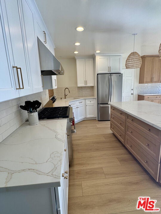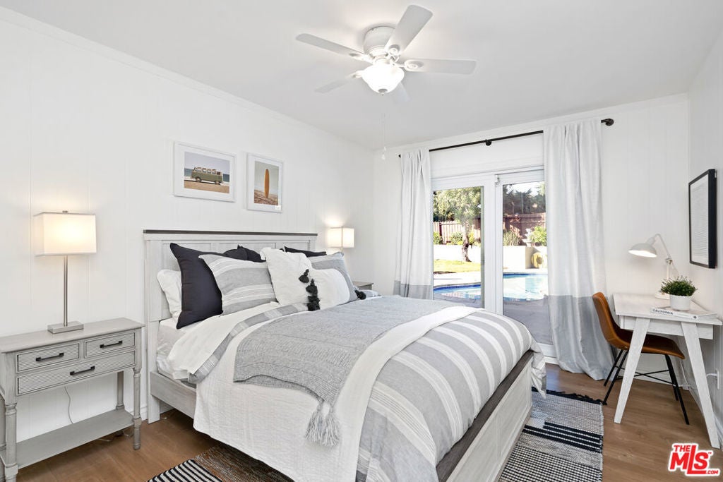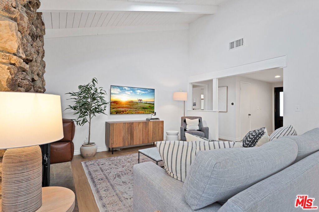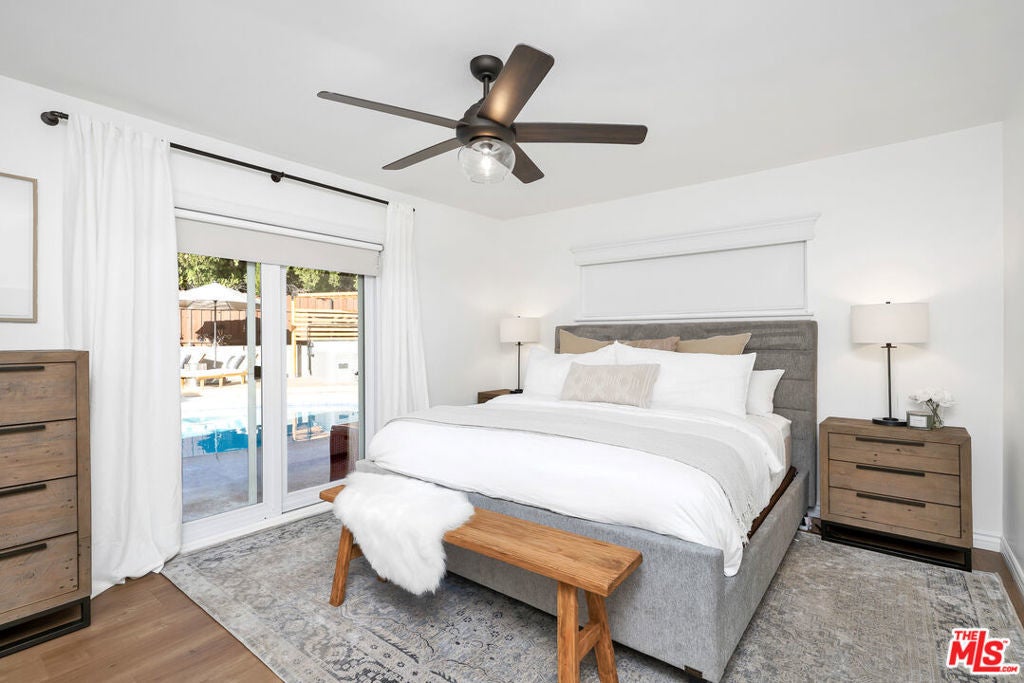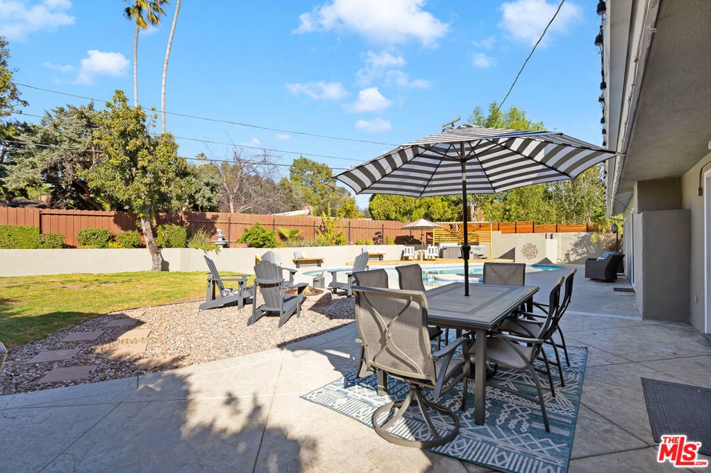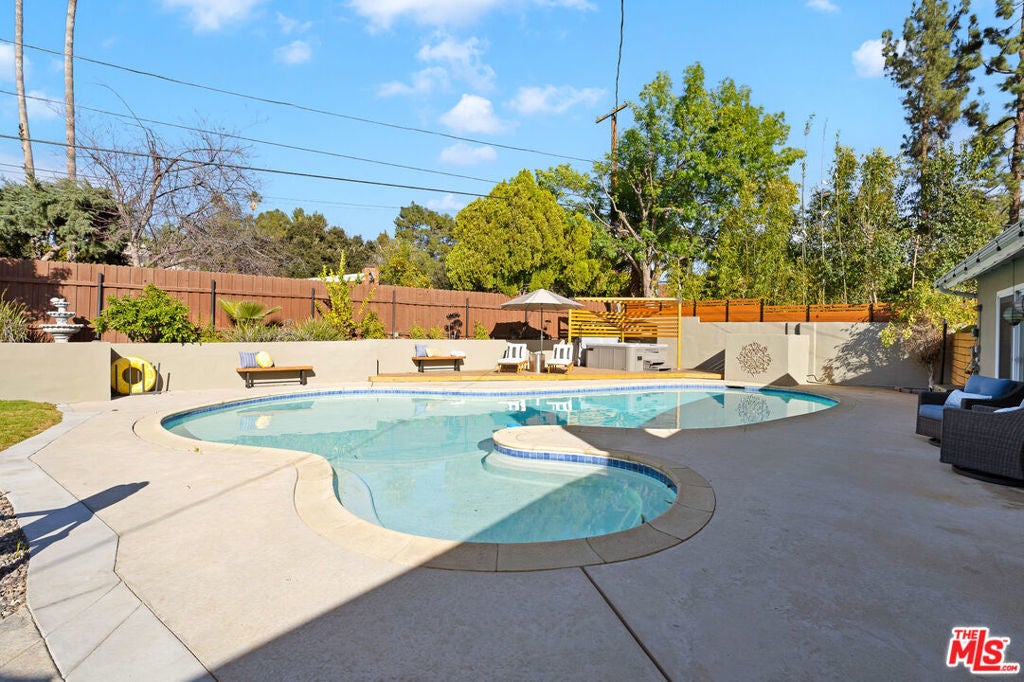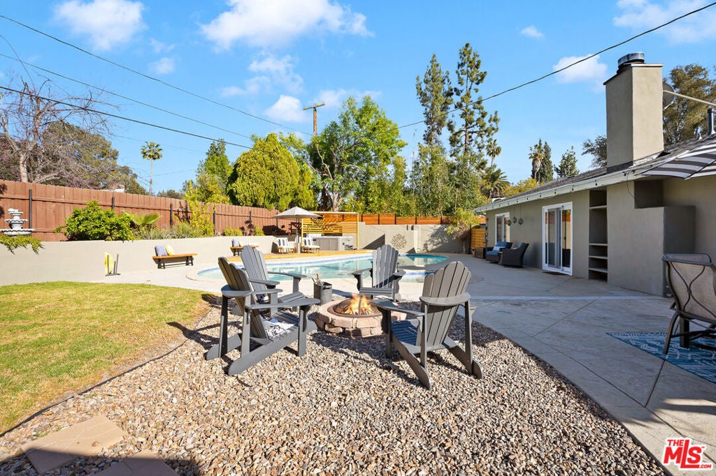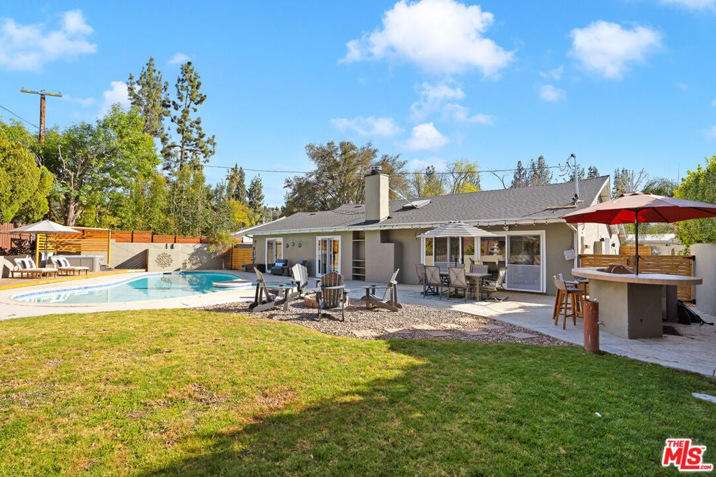 FULLY FURNISHED, FULLY EQIUIPPED!!! This mid-century modern home in Woodland Hills/Calabasas offers comfort, style, and convenience just 25 minutes from Malibu. Featuring vaulted ceilings, skylights, and sliding glass doors, the interior is filled with natural light and contemporary charm. The open-concept living and dining area includes a cozy fireplace and large-screen TV, while the gourmet kitchen is equipped with a Wolf gas range, stainless steel appliances, bar area, and ample storage. With four bedrooms, including a primary suite with king bed, ensuite bath, and walk-in closet, plus a dedicated gym and multiple office nooks, the home is ideal for families or groups. The resort-style backyard boasts a pool, hot tub, fire pit, wood deck, outdoor kitchen/bar, and multiple lounging and dining spacesperfect for entertaining. Located in a quiet, safe neighborhood with a circular driveway, Tesla charger, and plenty of guest parking, the home is just minutes from Calabasas Commons, Westfield Topanga, and offers easy access to downtown LA.