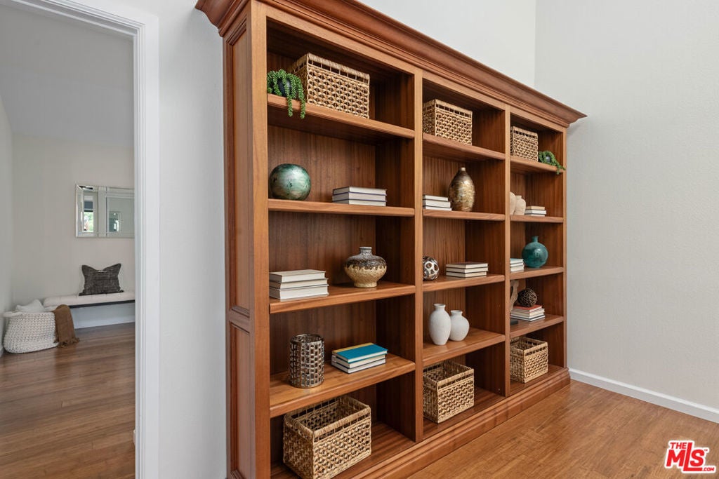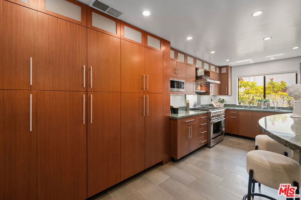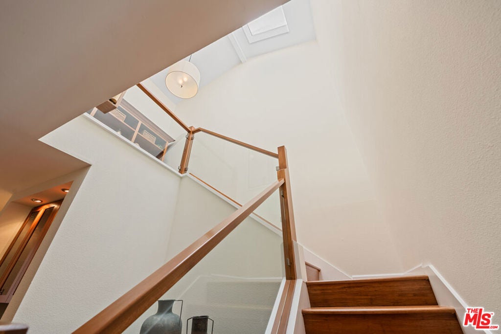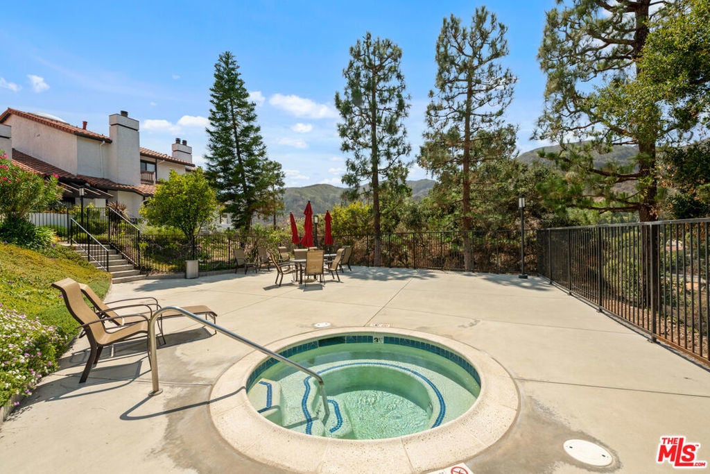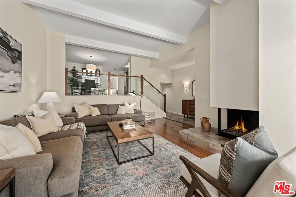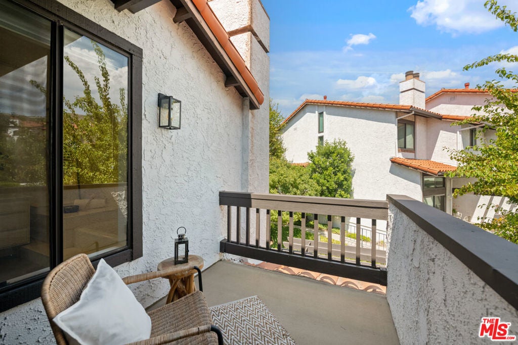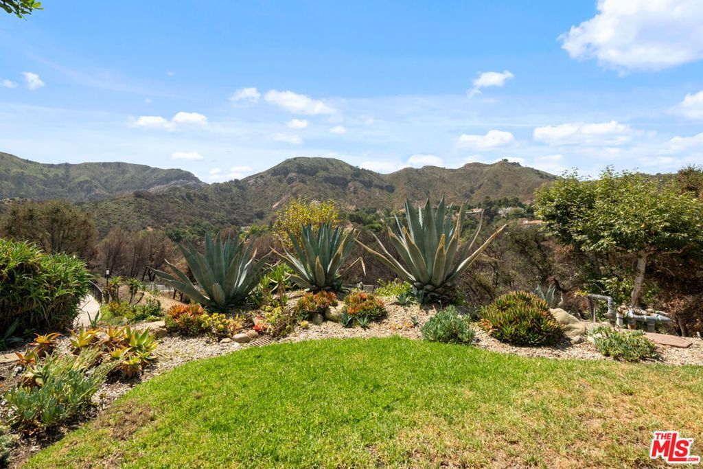 Step into this beautifully designed home featuring an inviting open floor plan that seamlessly integrates the living room with high ceilings, a striking rock stone fireplace, bamboo flooring and an al fresco dining area perfect for entertaining. The spacious dining room boasts elegant glass railings and a stylish bar that leads to a gourmet kitchen, complete with dramatic mood lighting, stainless steel appliances, granite countertops, and custom "pull out" shelving cabinetry. Enjoy the convenience of a built-in microwave, a deep "D" sink, two wine chillers, cozy breakfast bar that are all seated on beautiful ceramic floors. The main level features an exclusive private office or 3rd bedroom that offers complete privacy from upstairs life. A central skylight bathes soft light onto the stunning upstairs mahogany bookcase then gently pours that light down through the glass railed stairwell to the dining area. The luxurious primary bedroom is a true retreat, equipped with a thoughtful designed custom walk-in closet and private balcony that provides relaxing garden greenbelt and mountain views. The master bath features double sinks and large spa tub that offer a serene escape. The second bedroom, also on the upper level, includes an updated bath providing comfort and style. Additional highlights of this freshly painted exceptional home include bamboo wood floors, tankless water heater, epoxy floor in the garage and comprehensive security system. The outdoor space is equally impressive featuring a spacious entertainers patio with privacy hedging perfect for socializing with family and friends. Just up the path is a sparking swimming pool framed by a mountainous landscape featuring a spa, gym, and sauna for ultimate relaxation and recreation. Enjoy the security of a spacious 2 car garage with direct access and adjacent dedicated laundry area with ample cabinet space. There is additional utility in an under the home storage area access door. This residence also provides exclusive entry to a unique private park featuring dog-friendly zones, a playground, and expansive grassy areas, all located just minutes from the beach and picturesque local hiking paths that meander endlessly through the Santa Monica Mountains. Seize the chance to make this beautiful home yours! Fireplaces are considered decorative; therefore, the seller will not provide any repairs or credits.